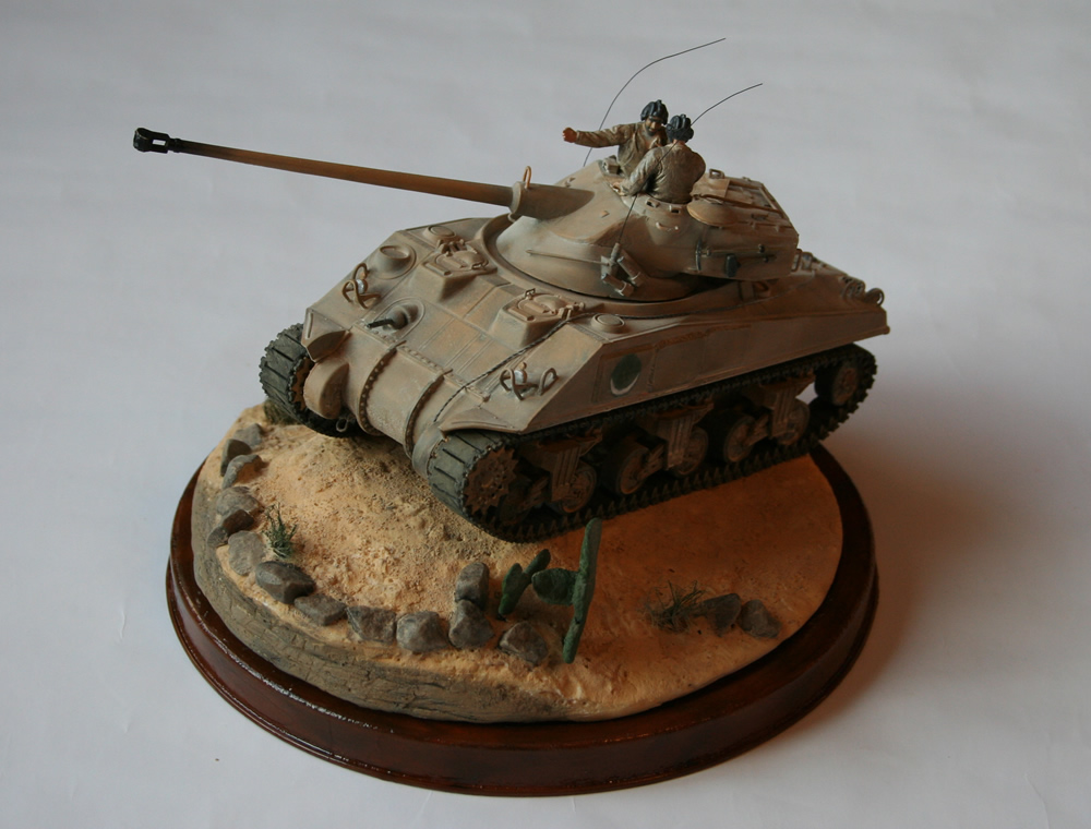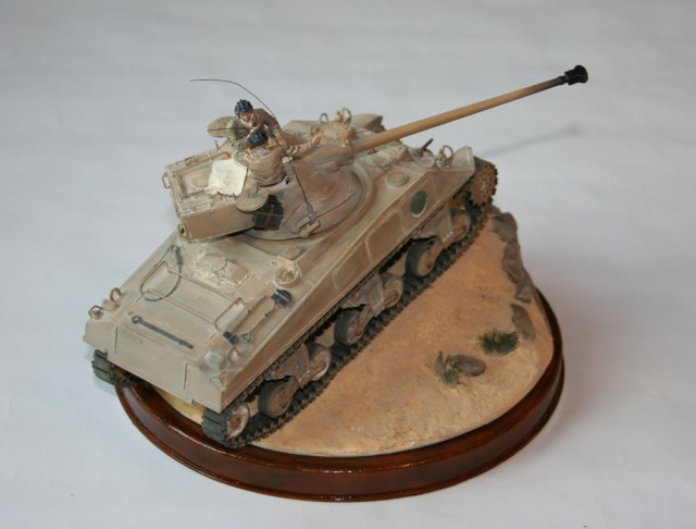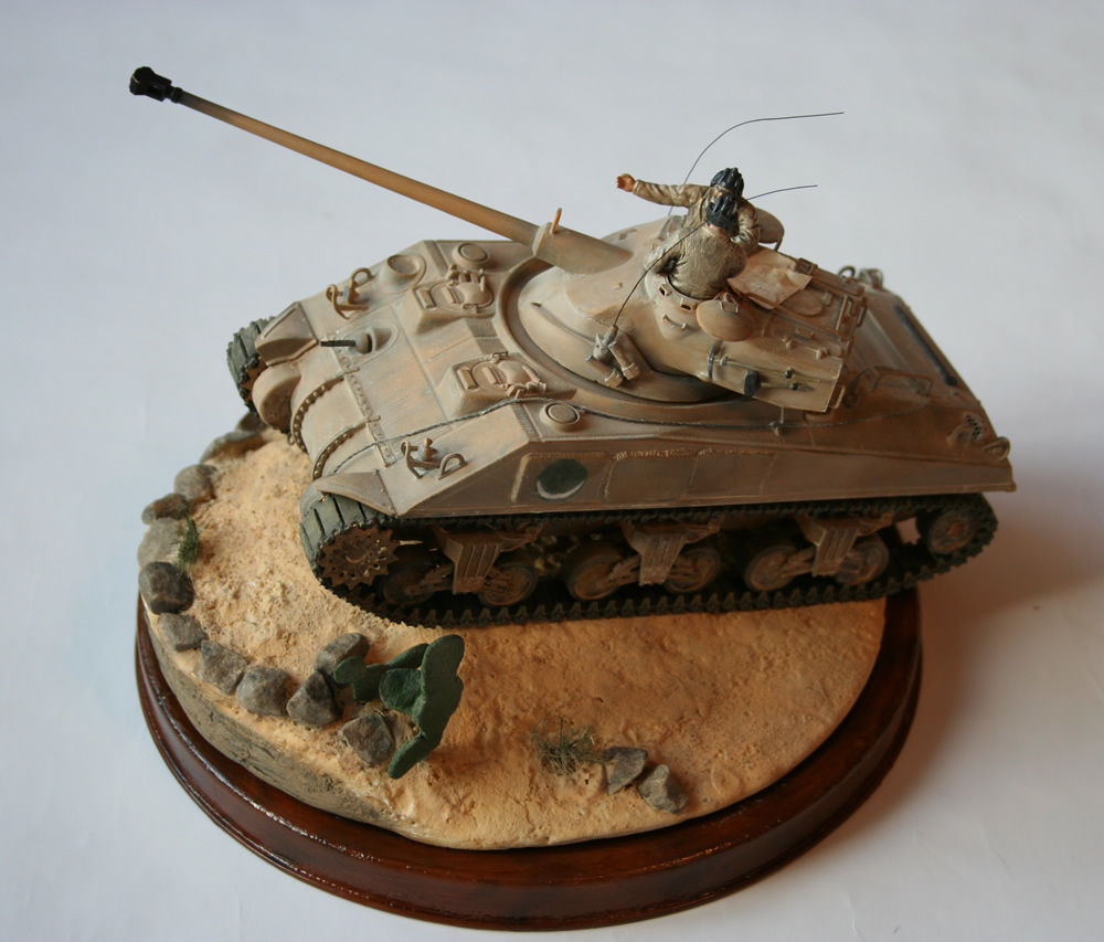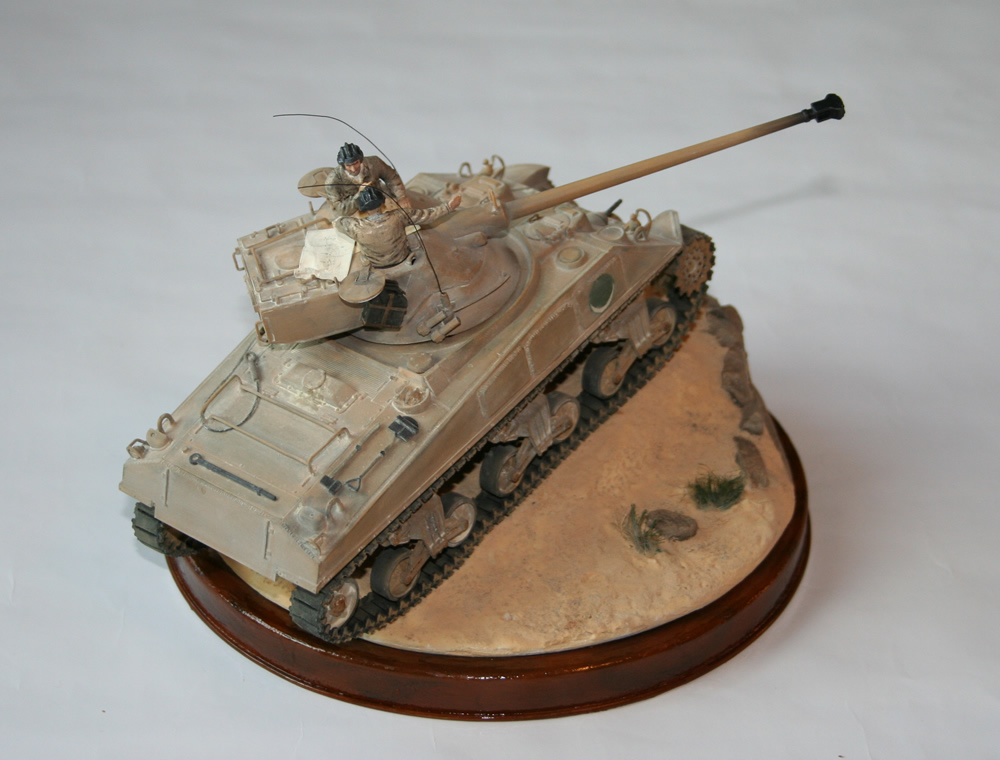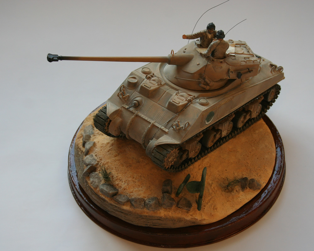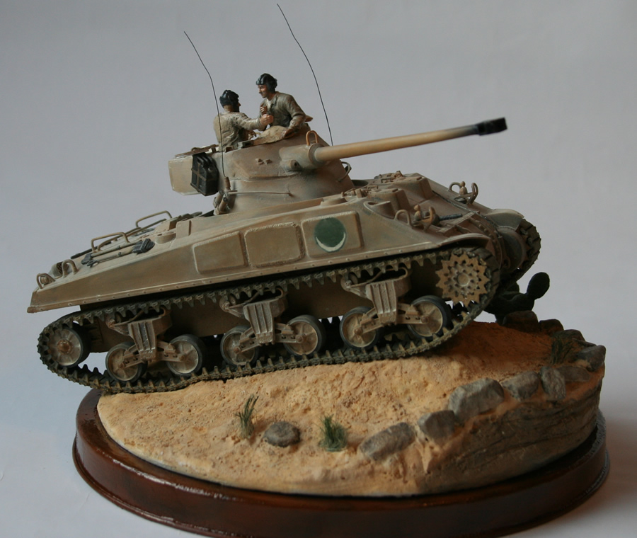 Корпус танка M4A4 взят от gragon'а(пришлось долго искать эту модель), а башня от французской фирмы Heller. Собиралась конверсия достаточно легко, правда пришлось повозиться с башней, уж больно она непокорна и плохо стыкуема. Модель покрашена тамиевским акрилом, фильтрована маслом и пигментами.