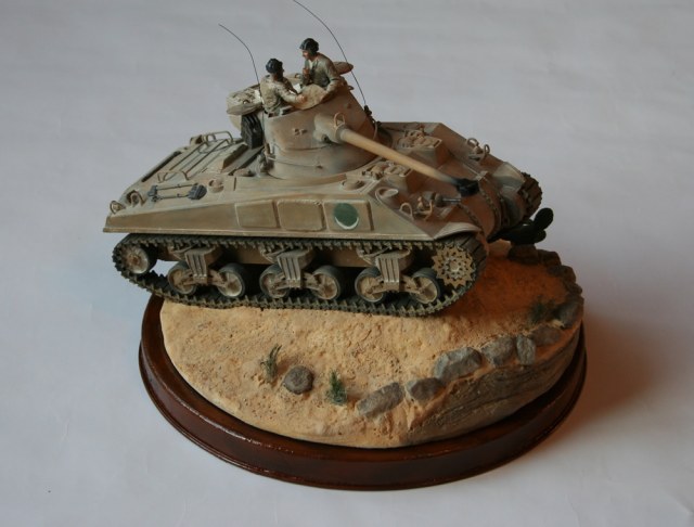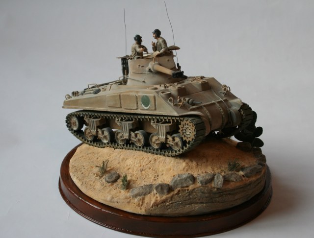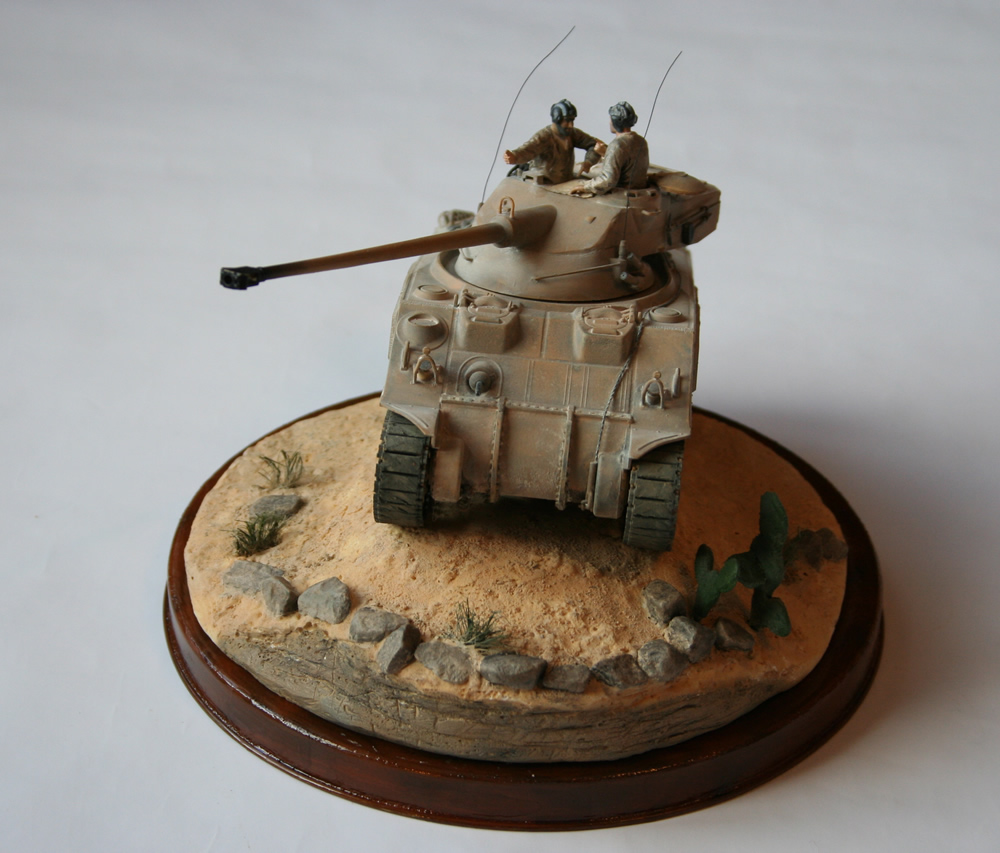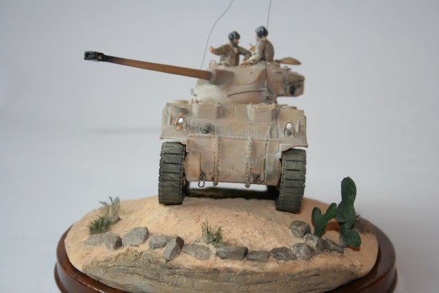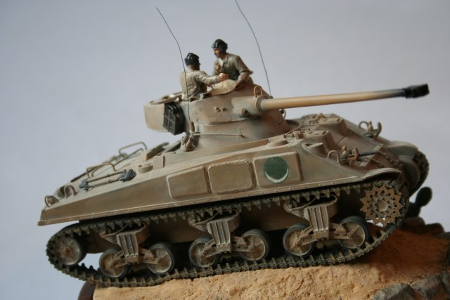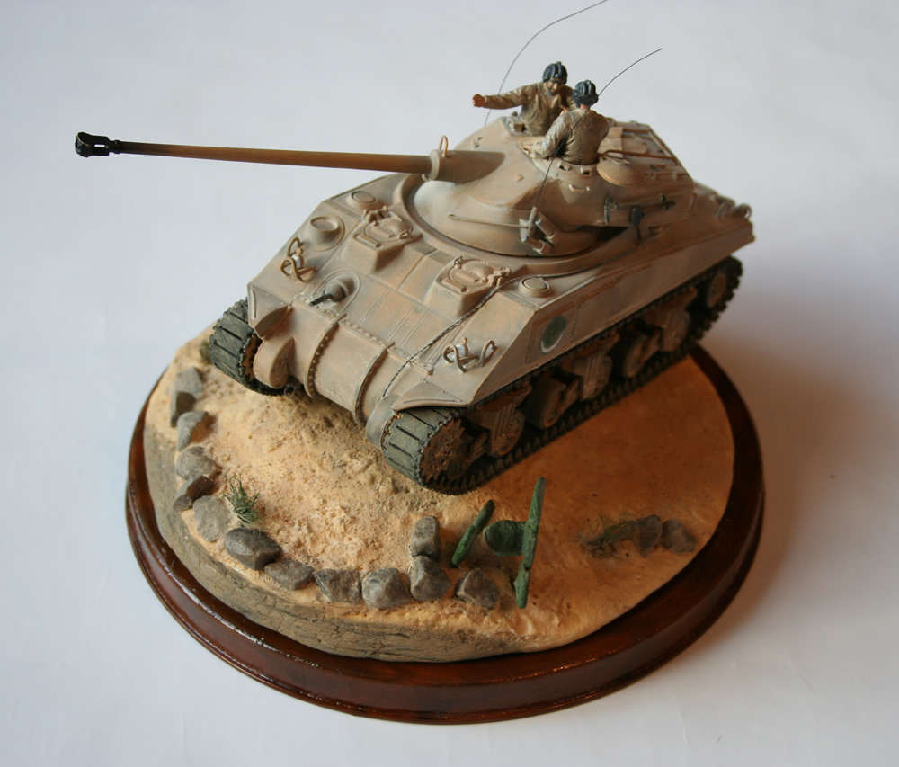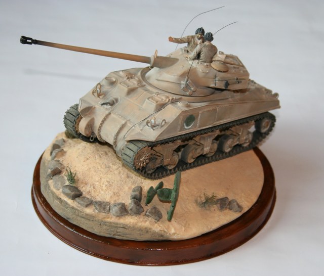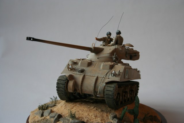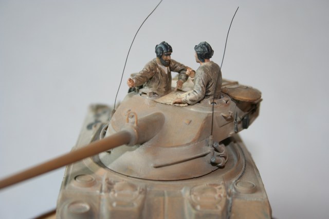 Корпус танка M4A4 взят от gragon'а(пришлось долго искать эту модель), а башня от французской фирмы Heller. Собиралась конверсия достаточно легко, правда пришлось повозиться с башней, уж больно она непокорна и плохо стыкуема. Модель покрашена тамиевским акрилом, фильтрована маслом и пигментами.