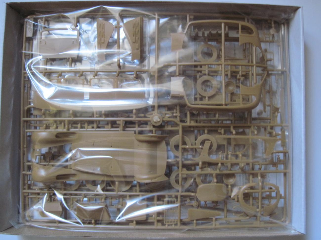 Итак, коробка классического для ICM красного цвета, без упаковки, видимо производитель экономит на полиэтилене или заботится об экологии. С другой стороны - можно беспрепятственно осмотреть содержимое коробки прямо в магазине. Внутри крошечный лист с декалями, две инструкции и 5 литников. Литники таки в пакетах. При беглом осмотре не обнаружено облоя и утяжин, нет белых разводов на пластике(на Опеле их было достаточно много), есть следы толкателей(довольно много), но надеюсь они все попадут на внутренние поверхности. Хотя, шпаклевать не в первой, в случае чего. Остекление на отдельной плате и в отдельном пакетике, на что стоит обратить внимание - фигурка лебедя с капота - находится именно на этой плате и она разбита на три детали! Крылья клеятся отдельно! Опять ICM занимается ненужным ультра-гипер членением деталей. Дана довольно подробная деталировка двигателя (хотя не знаю, насколько верная), сходная с Опелем схема соединения рамы крест-накрест, те же наборные покрышки из 5(!!!) деталей. Сходу приметил на литниках несколько особо тонких и хрупких деталей, которые гарантированно сломаются при отделении от литника. С другой стороны, есть некоторый прогресс, по сравнению с Опелем - выхлопная труба наконец то дана единой деталью(у Опеля была разбита аж на три куска), так же парни из ICM отказались от абсолютно непотребной(в Опеле) детализации руля (отдельно обод и отдельно крестовина) и дали его монолитом. В Опеле обод конечно же сломался, пришлось делать из проволки. Так же еще одно отличие - кузов дан двумя половинками.