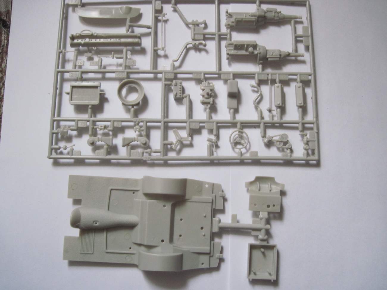 Инструкция с крупными четкими рисунками, проблем вызывать не должна. Все детали упакованы в пакеты. Отдельно упаковано остекление, отдельно хромированные детали. Кстати у хромированных литников облезли края и показали истинную суть модельного хрома. Все остальные детали в одном большом пакете. При осмотре не обнаружено никаких браков литья, сильно мелких деталей тоже нет. Покрышки исполнены из резины.