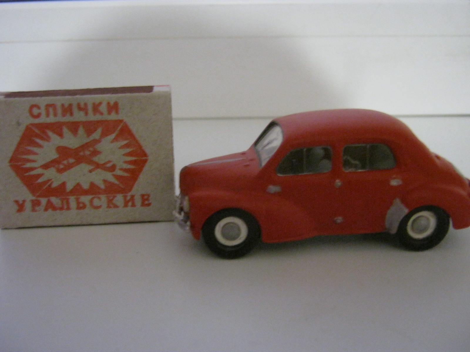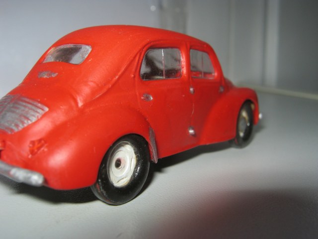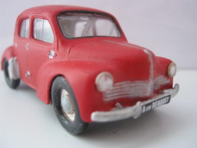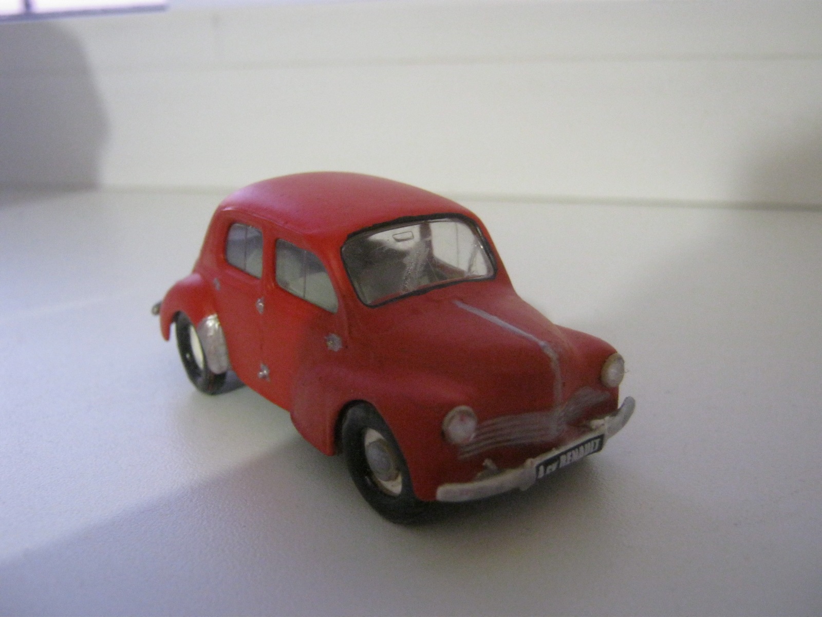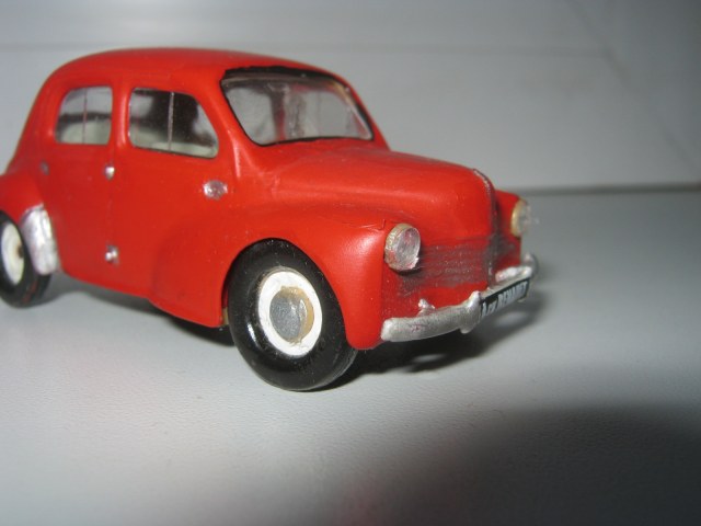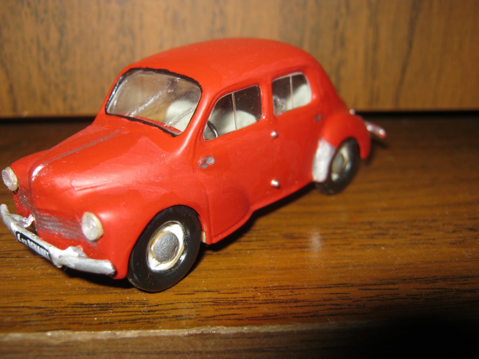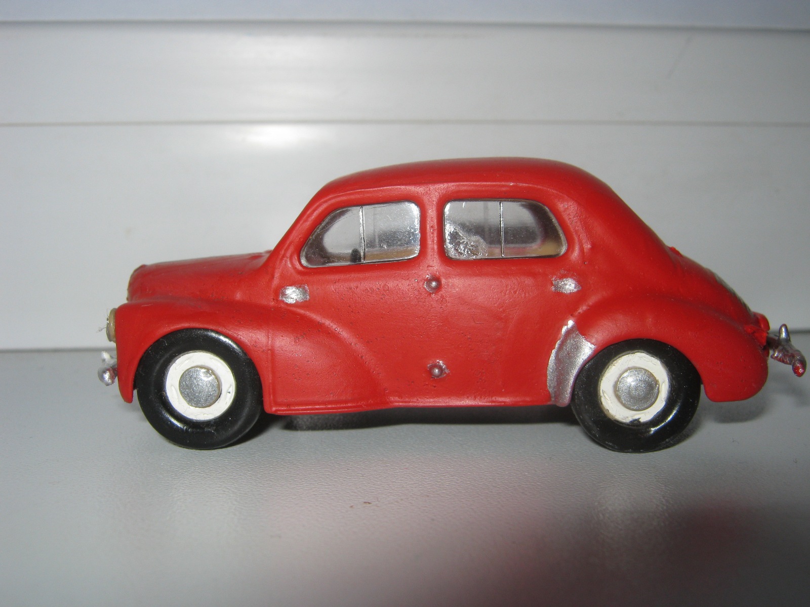 Здраствуйте! Я представляю вам французкий автоиобиль Рено 4 cv. Это был удачный экономичный автомобиль выпускавшийся с 1947г по 1961г. Автомобиль собирался довольно легко, но возникла не большая проблема с фарами пришлось добавить фальгу для большей яркости. В покраске модели возникла проблема с молдингом, так как модель маленькая.
