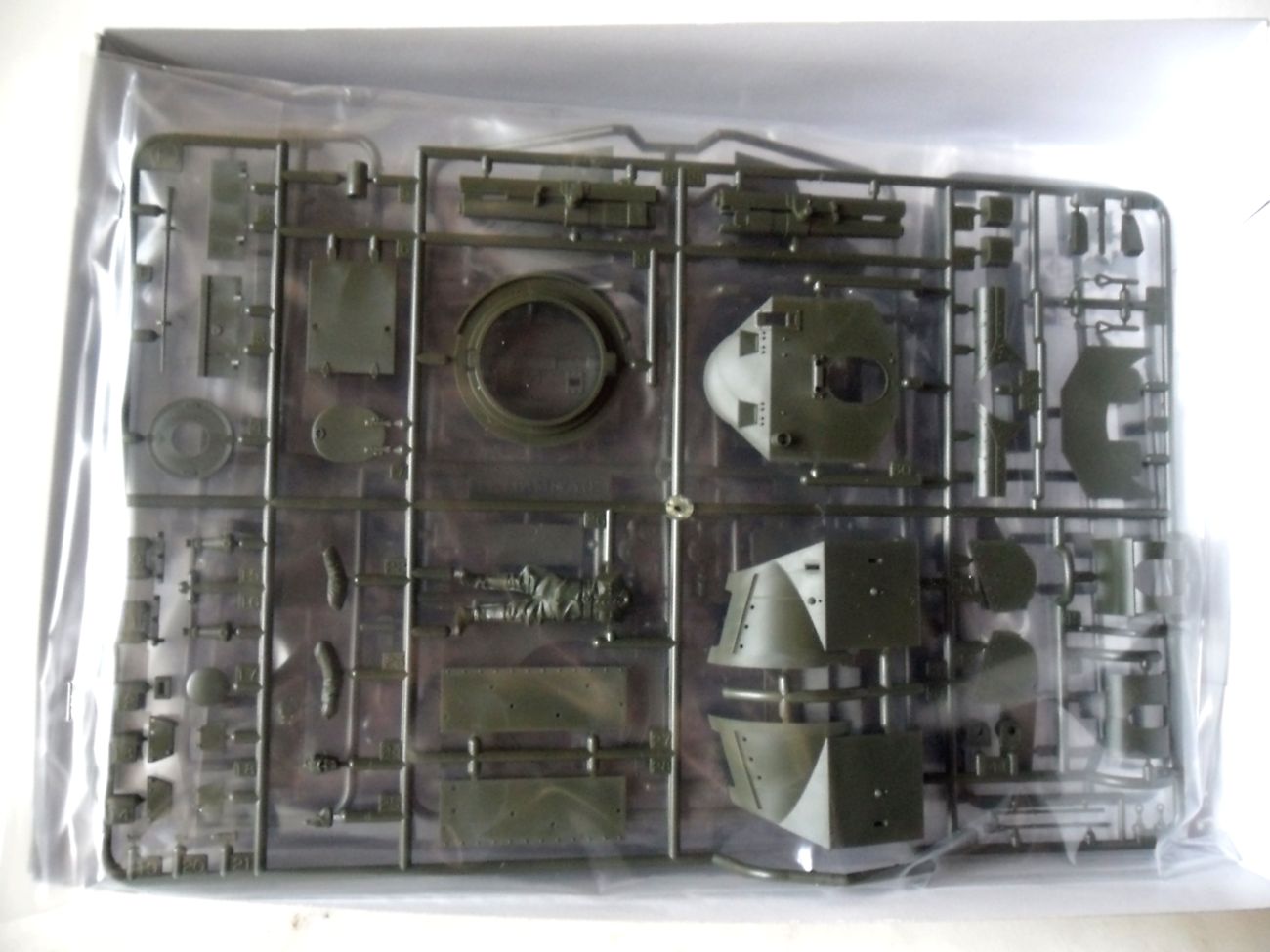 В красочной коробке стандартного для "Тамии" оформления находится инструкция, 8 литников с деталями корпуса, башни, ходовой, обвеса и т.д., один литник с прозрачными деталями фар и смотровых приборов, небольшая платка фототравленных решеток, набор резиновых втулок для ходовой, небольшая декаль и веревочка, изображающая трос. На одном из литников ткже находится фигурка финского танкиста.