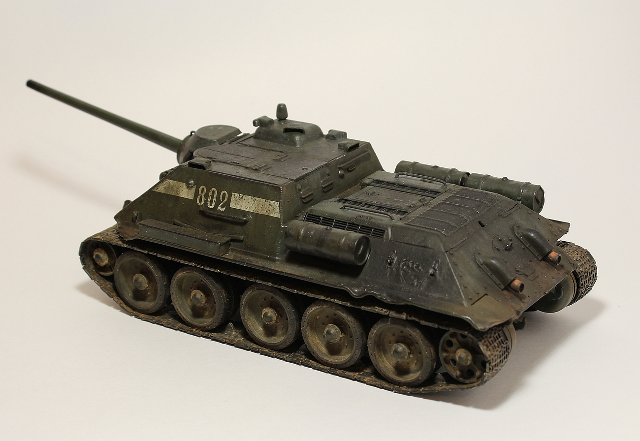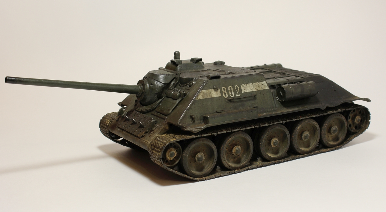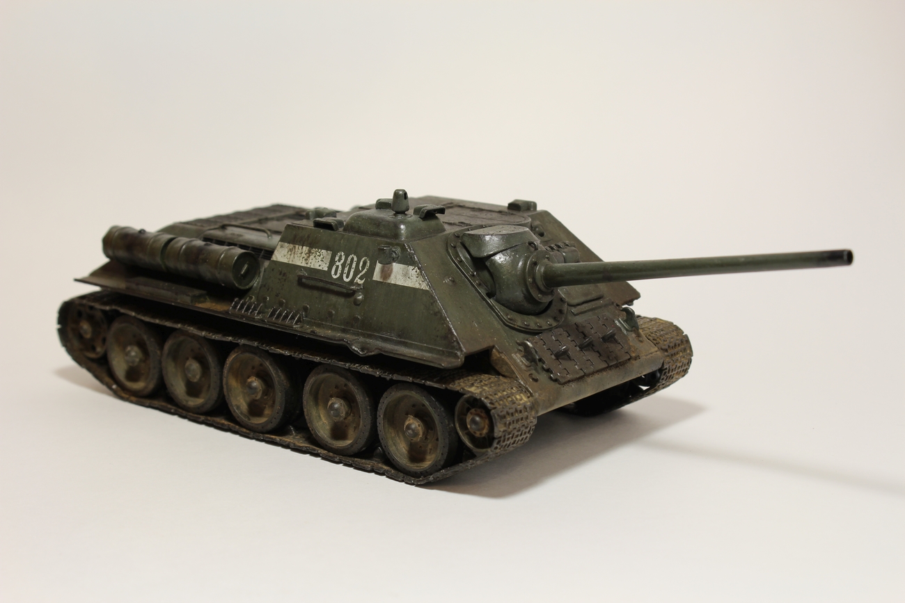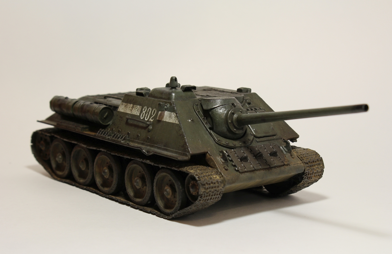 Представляю на ваш суд свою вторую модель. СУ-85 от Тамии, попытка сделать более-менее достоверный прототип борта 802, 1-го механизированного корпуса, 1822-го самоходного артиллерийского полка, апрель 1945 года. Собирал в целом изкоробку, добавил от себя лишь поручни из медной проволоки. Опять же повторюсь - попытка сделать модель по фото.