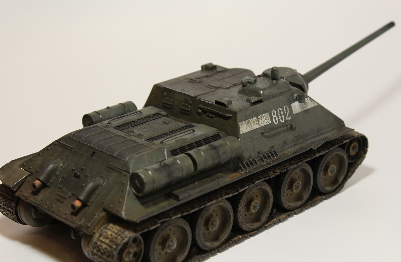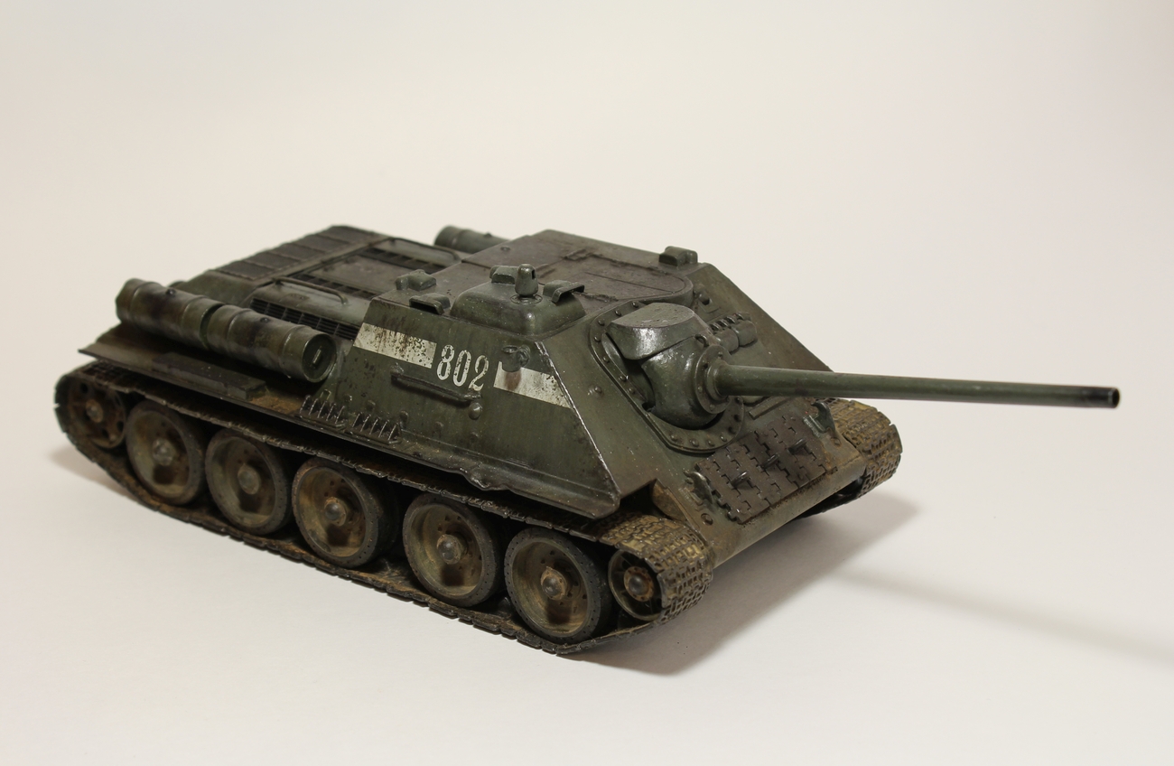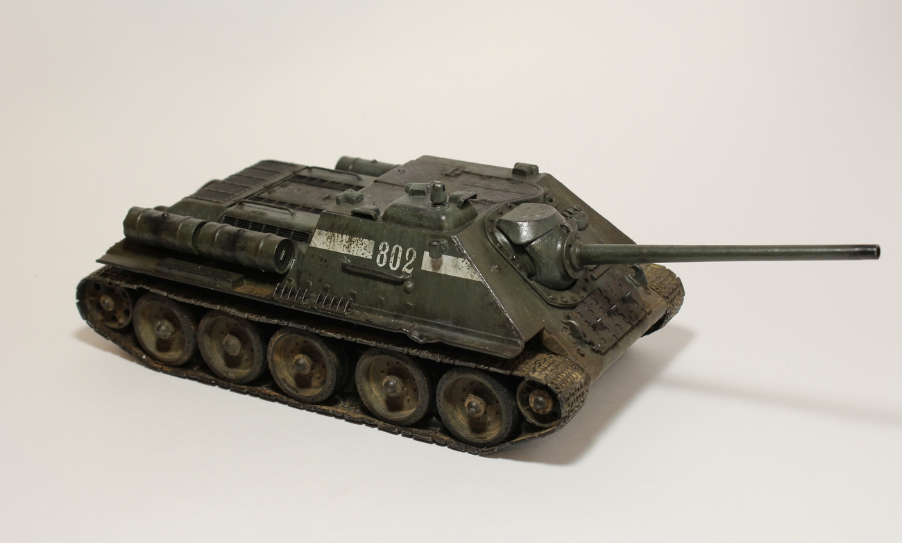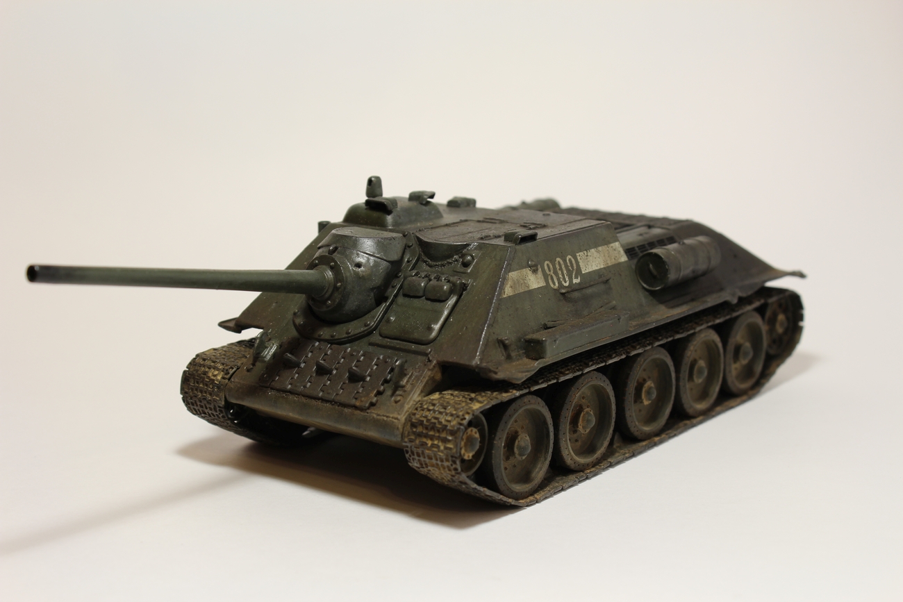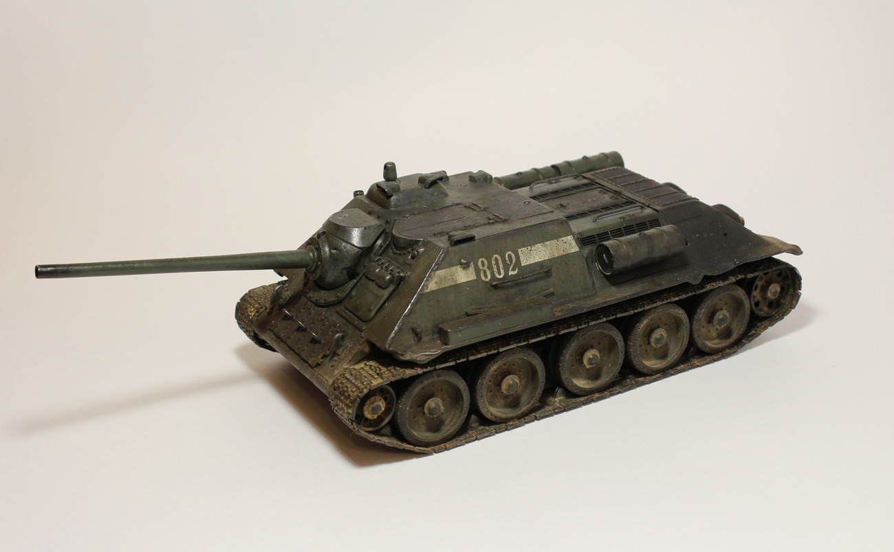 Представляю на ваш суд свою вторую модель. СУ-85 от Тамии, попытка сделать более-менее достоверный прототип борта 802, 1-го механизированного корпуса, 1822-го самоходного артиллерийского полка, апрель 1945 года. Собирал в целом изкоробку, добавил от себя лишь поручни из медной проволоки. Опять же повторюсь - попытка сделать модель по фото.