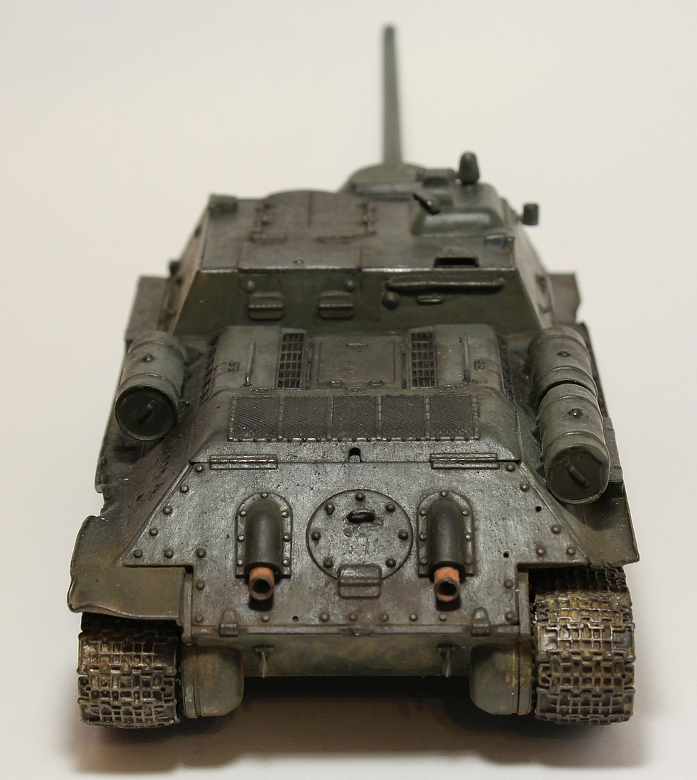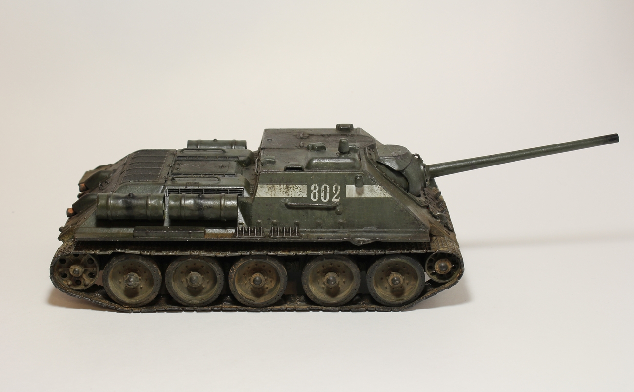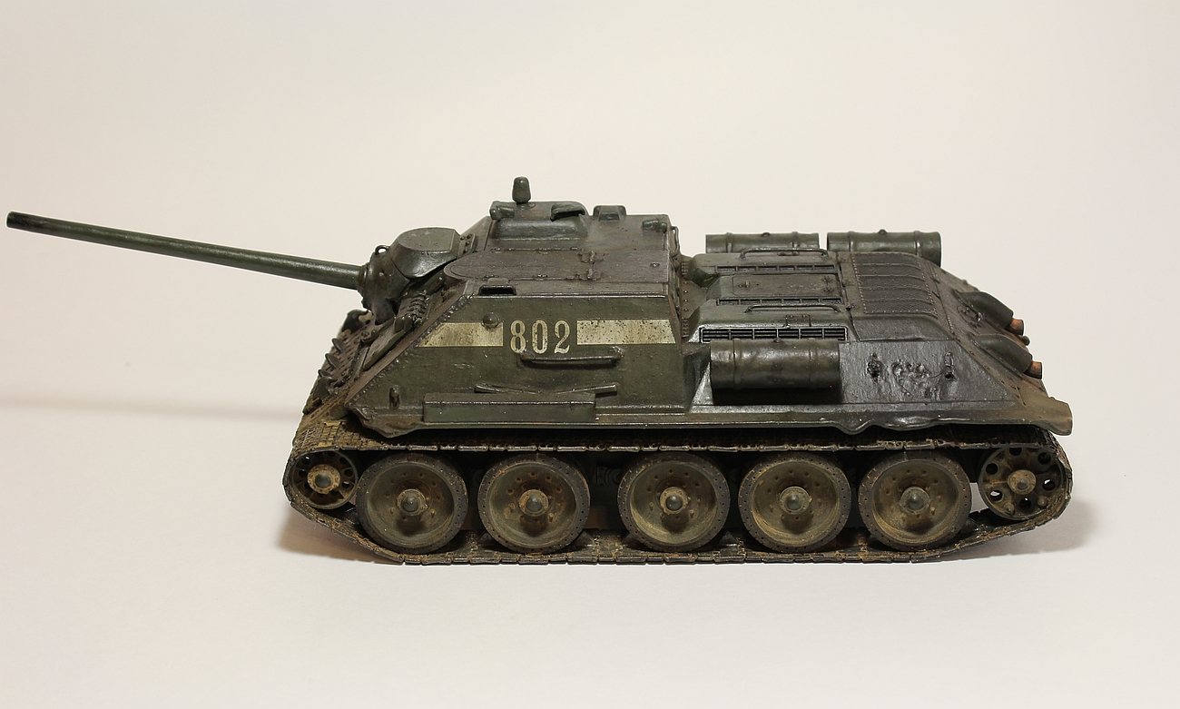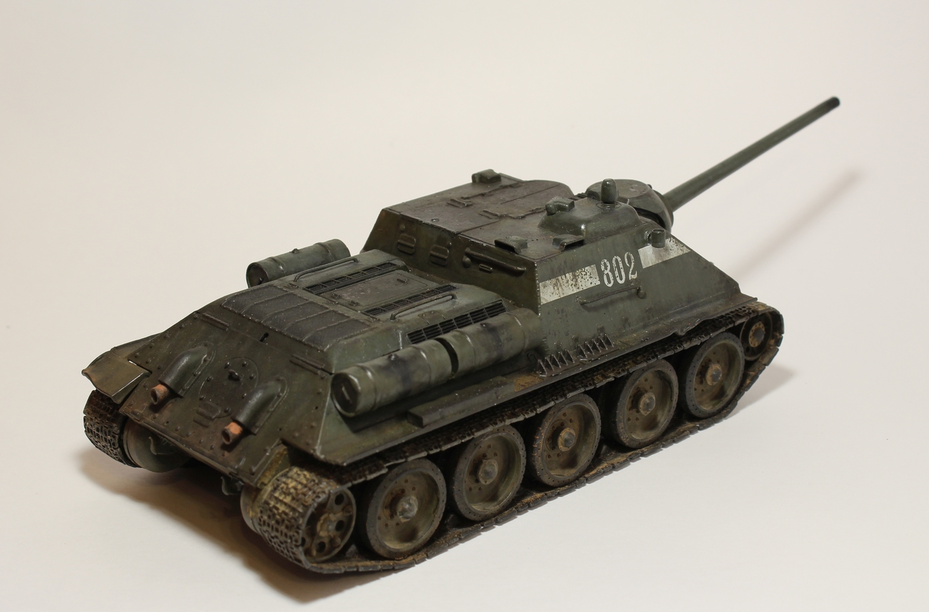 Представляю на ваш суд свою вторую модель. СУ-85 от Тамии, попытка сделать более-менее достоверный прототип борта 802, 1-го механизированного корпуса, 1822-го самоходного артиллерийского полка, апрель 1945 года. Собирал в целом изкоробку, добавил от себя лишь поручни из медной проволоки. Опять же повторюсь - попытка сделать модель по фото.