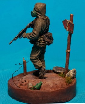 Банка консервная и бутылка, шли в комплекте с фигуркой S.T.A.L.K.E.R. Новичок, но не пригодились там и поэтому нашли свое применение в этой работе. Камни настоящие прикреплены к подставке с купленными и немного подкрашенными пучками травы.