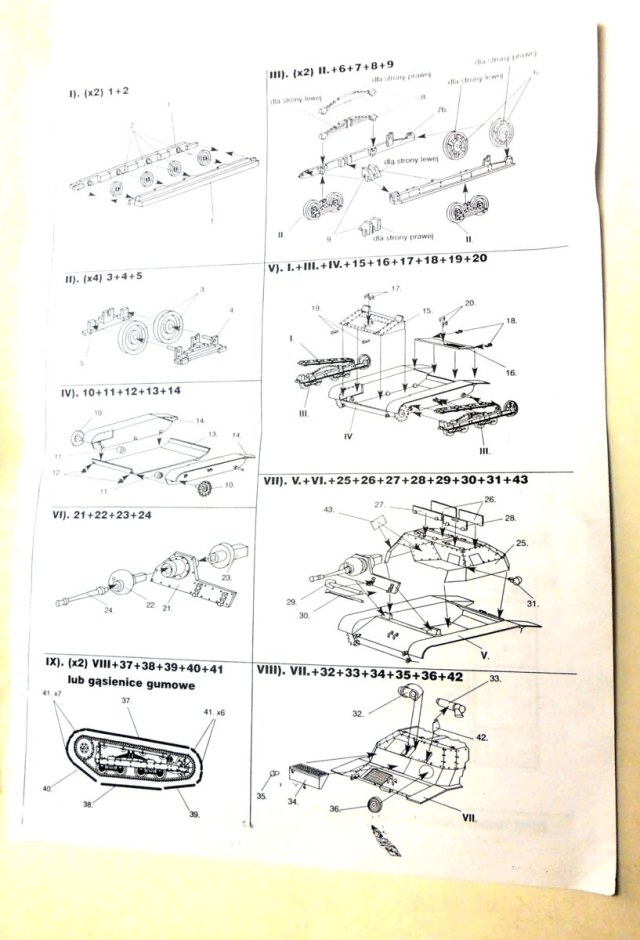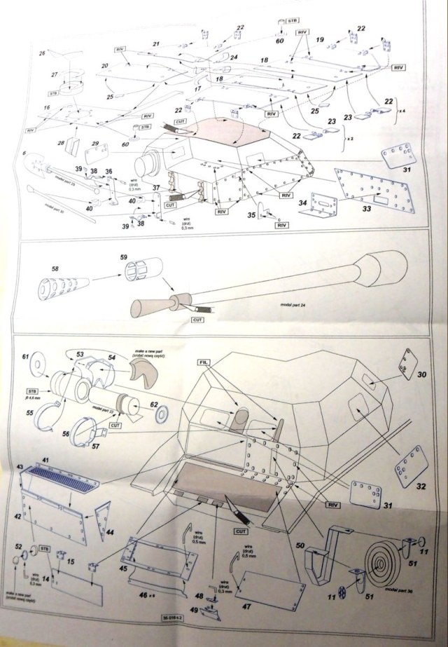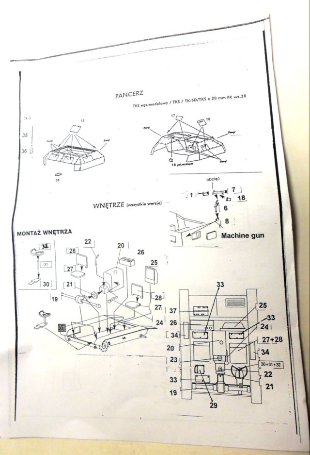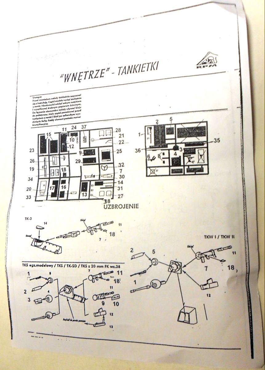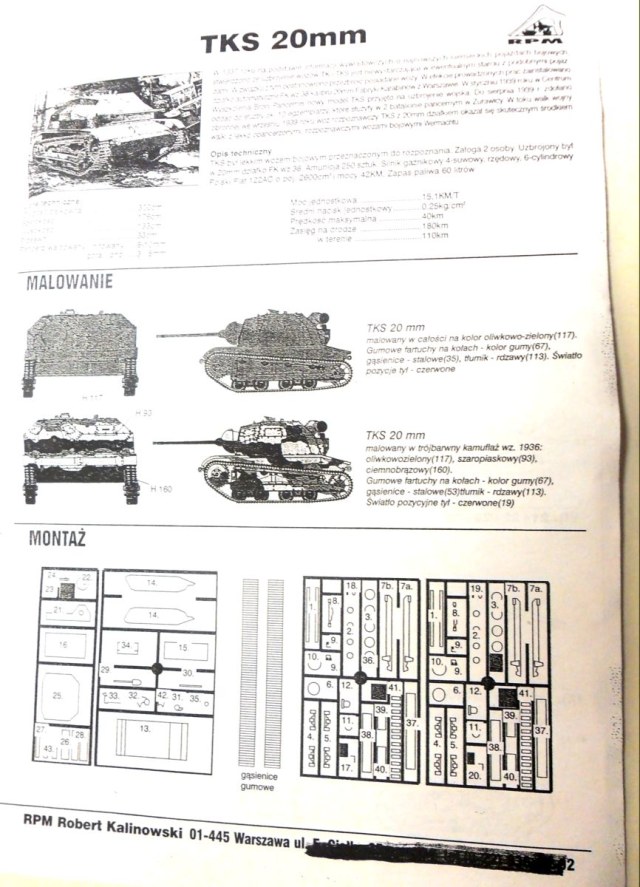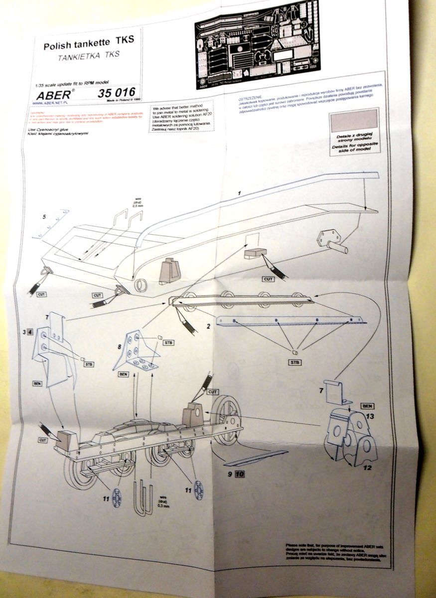 Инструкция довольно убога, напечатана на двух листах размером в половину стандартного. Разобраться довольно трудно, т.к. инструкция, такое впечатление, идет одна на все виды польских танкеток.