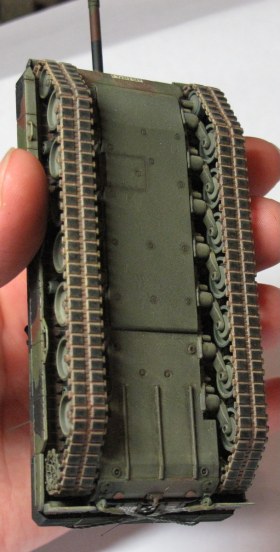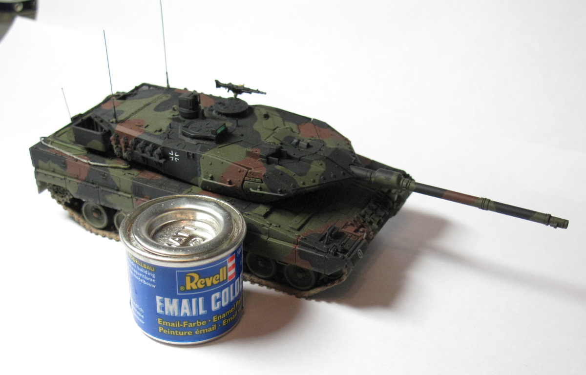 Для основных цветов камуфляжа использовал краски Revell - те что были даны в инструкции. При сравнении с фотографиями, эти цвета близки к оригиналу. Пачкать модель сильно не стал – только ходовую часть. Сначала запачкал еще и бортовые экраны, но потом грязь почти полностью убрал, оставил чуть-чуть в самом низу - c грязными бортами, на мой взгляд, не смотрится.