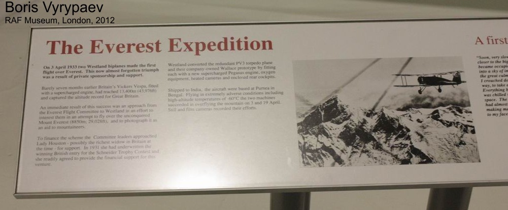 Эта машина, известная как Хаустон Уоллэс, с гражданским обозначением G-ACBR в апреле 1933 г. совершила первые полеты над самой высокой горой мира - Джомолунгмой (Эверестом). В ходе первого полета 3 апреля облачность не дала сделать снимок вершины. Зато 19 апреля экипаж вернулся с несколькими отснятыми пленками. Конечно, этот полет имел больше спортивное, чем практическое значение. Куда больше пользы принесла систематическая съемка прилегающих горных районов, позволившая составить их топографическую карту. В паре с PV.6 работал другой опытный вариант "Уопити" - PV.3, создававшийся первоначально как палубный торпедоносец.