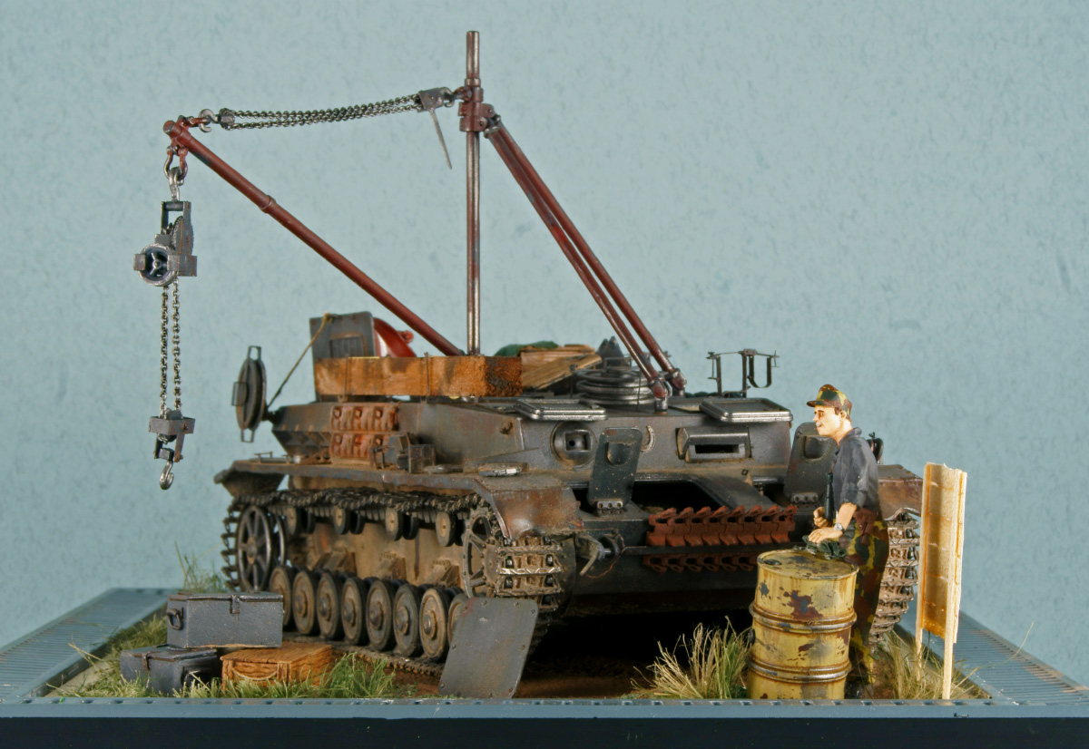 Поздравляю с окончанием стройки! Приятная машина получилась, особенно понравился антураж вокруг БРЭМа, библия, ящики, баллоны, все классно.Только немного поправлю, красных баллонов с бытовым пропаном у гансов не было, для газосварки применялись синие и белые (черные) кислород и ацетилен. Единственное, не хватает ручек закрывания на откинутых люках. И сразу вопрос, почему БРЭМ в панцергрее? Машины стали выпускаться только в 44 году, серого окраса уже не было.