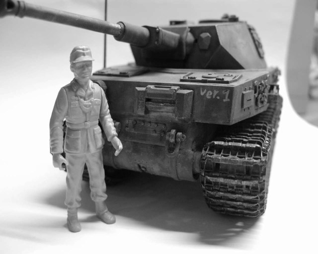Ванна корпуса взята от трумпеторовского H35. Ходовые тележки от звездовского "ферди". Башня и часть подбаненной коробки опять же от Pz.IV звезды. Ведущая металлическая звездочка от хетцера. Старые траки с поломанными зубьями от пантеры мастер клаб (другого не было) на защелках. Торсионы от евергрина. Ходовая часть рабочая и подвижная. Использовался листовой пластик разной толщины. Заклепки и болты от мастер клаб.