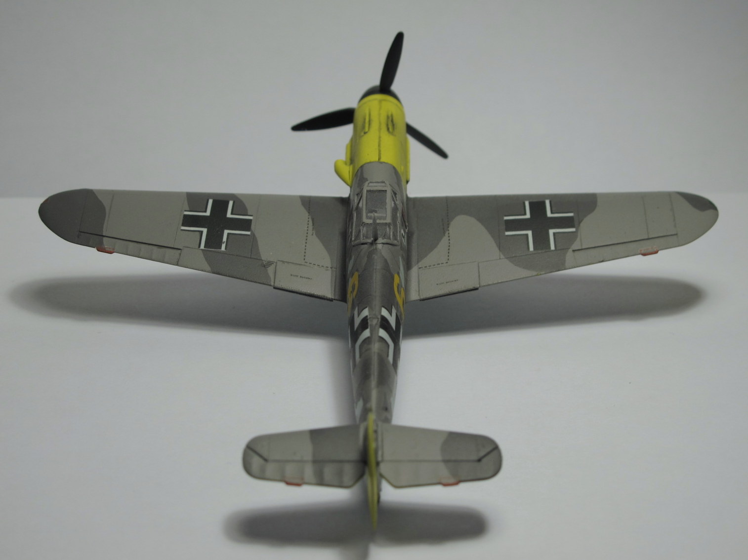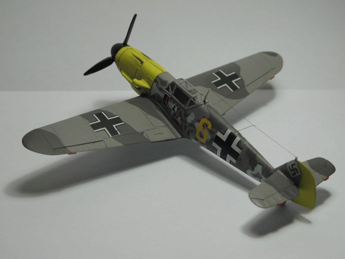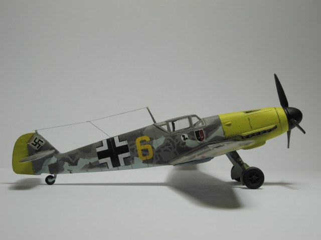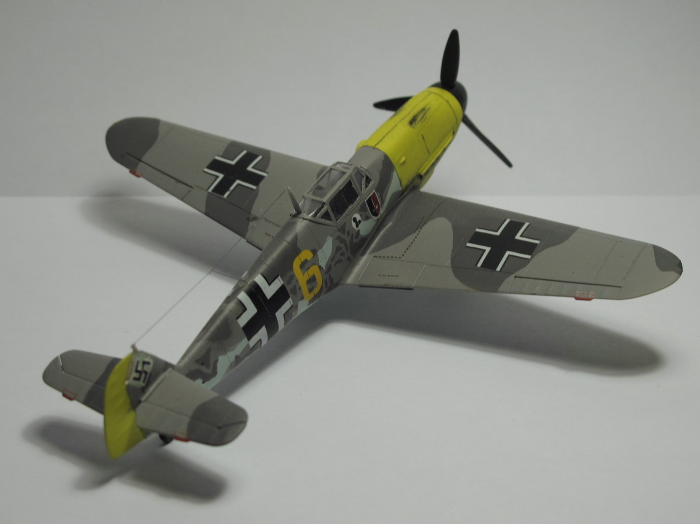 Камуфляж как раз нормальный,только Вы его неправильно сделали,в инструкции показано примерное расположение пятен на бортах фюзеляжа,сами пятна должны быть с сильно размытыми краями,их нужно было красить аэрографом без масок,а так действительно странновато смотрится.И кстати у Акана два жёлтых РЛМ(РЛМ27 и РЛМ 04),Вы похоже красили 27,а шестёрка на декали 04.Ближнюю к законцовке линию расшивки зря сделали,ёё на F не было.И на фотографиях и профилях жёлтая 5 показан его Г2