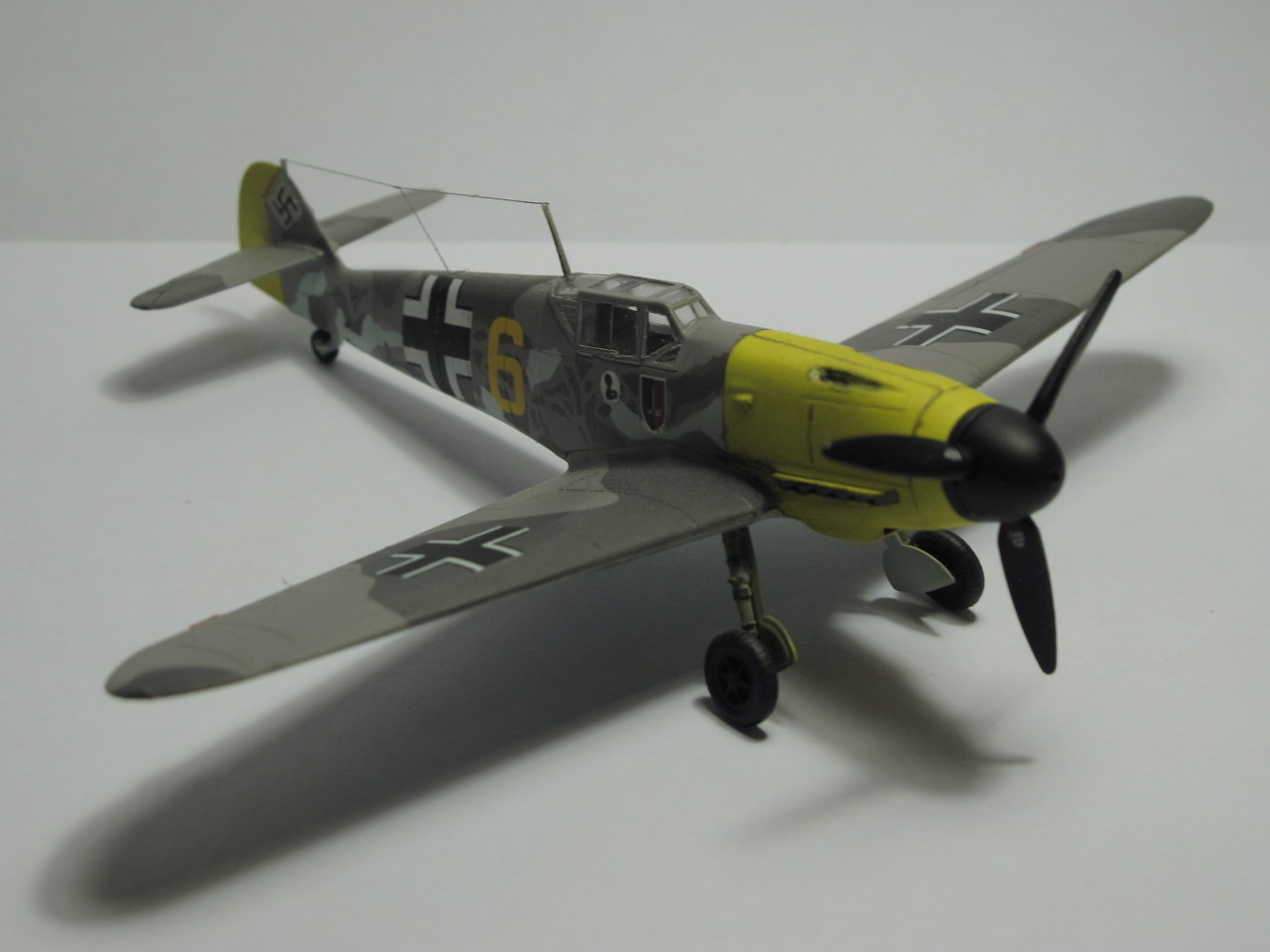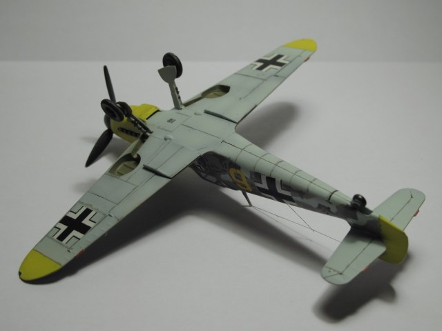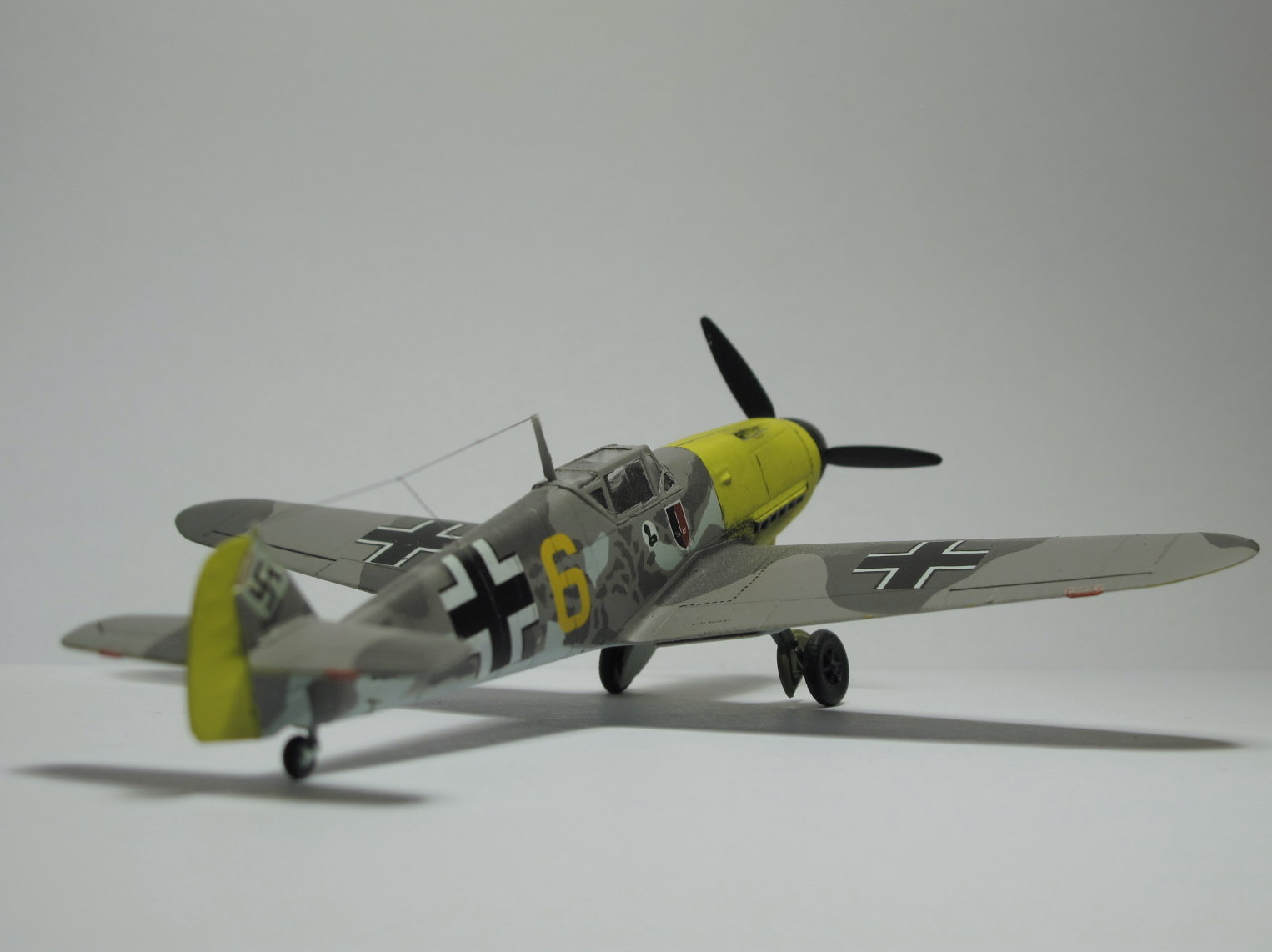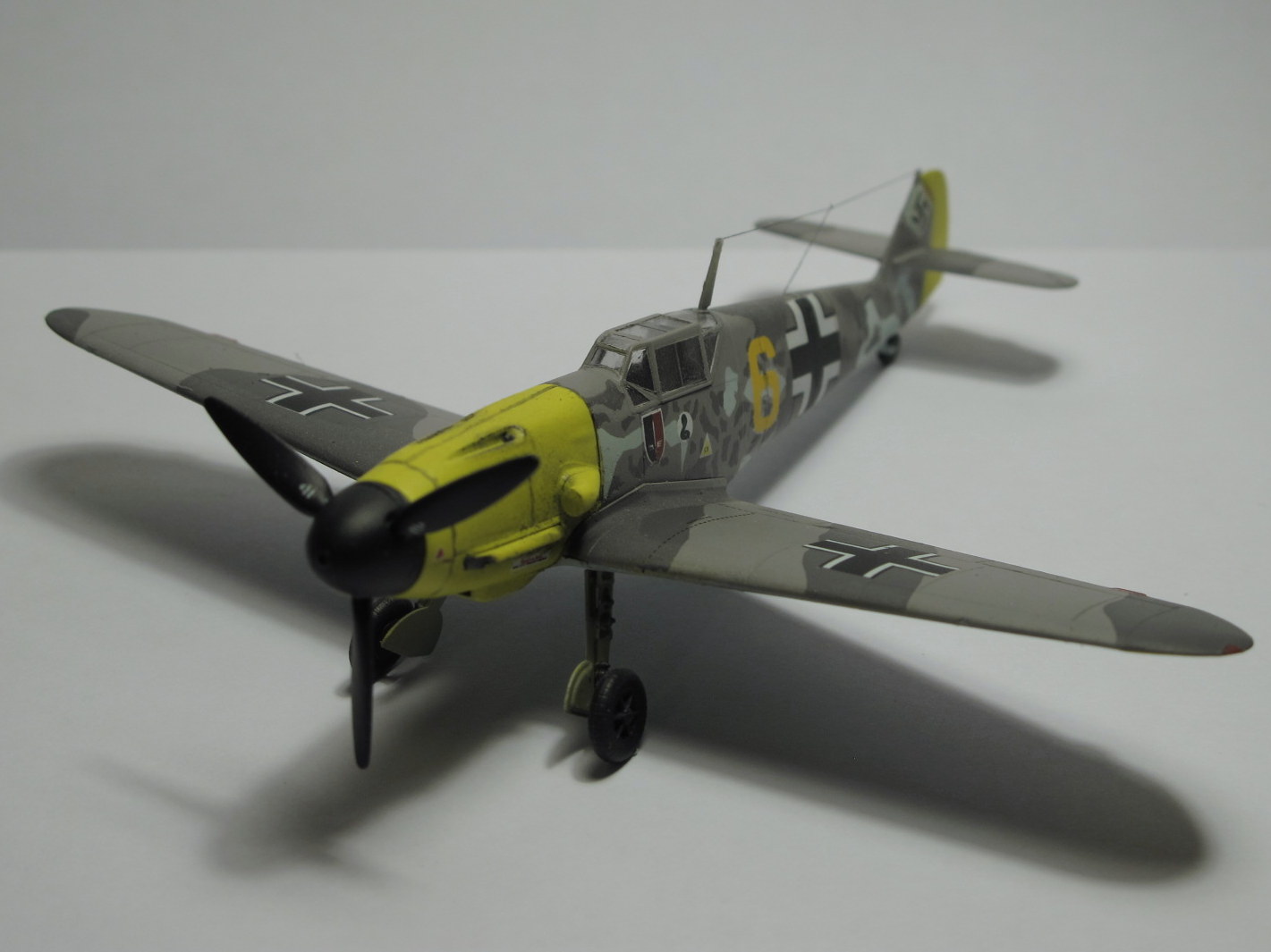 Камуфляж как раз нормальный,только Вы его неправильно сделали,в инструкции показано примерное расположение пятен на бортах фюзеляжа,сами пятна должны быть с сильно размытыми краями,их нужно было красить аэрографом без масок,а так действительно странновато смотрится.И кстати у Акана два жёлтых РЛМ(РЛМ27 и РЛМ 04),Вы похоже красили 27,а шестёрка на декали 04.Ближнюю к законцовке линию расшивки зря сделали,ёё на F не было.И на фотографиях и профилях жёлтая 5 показан его Г2