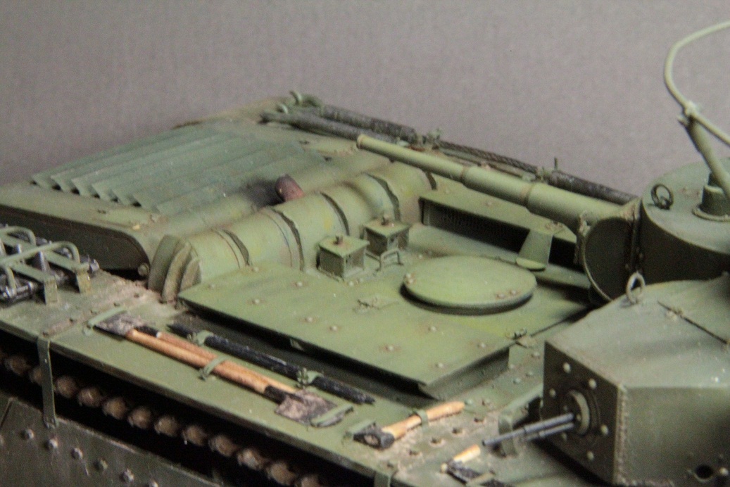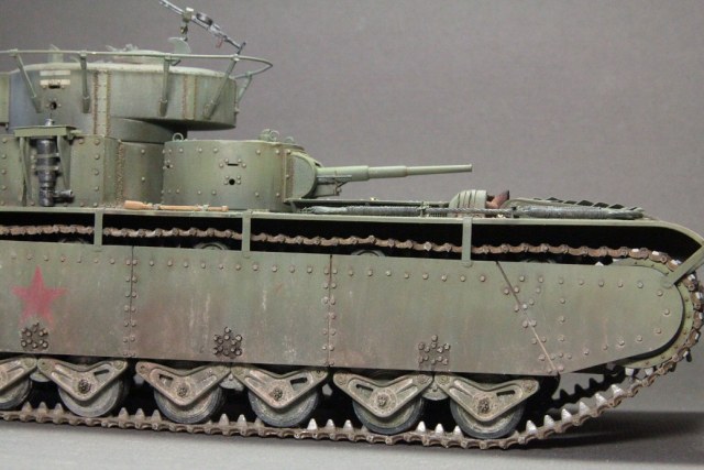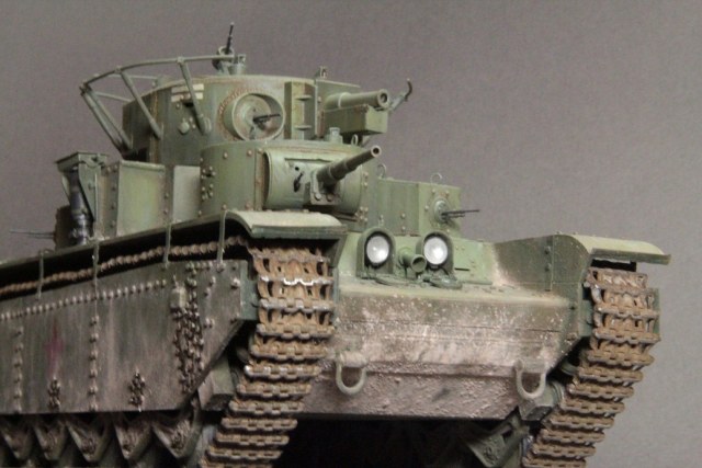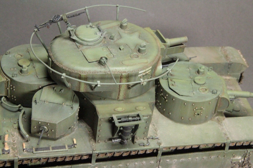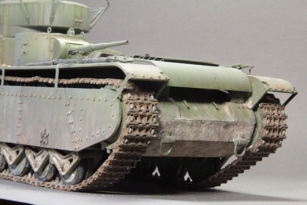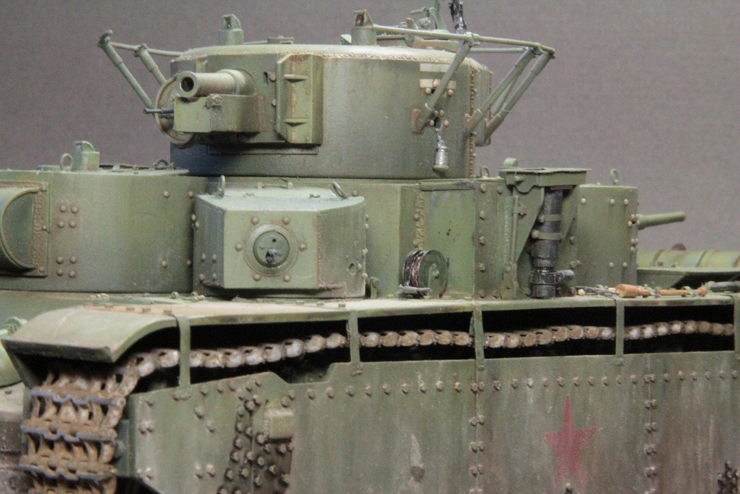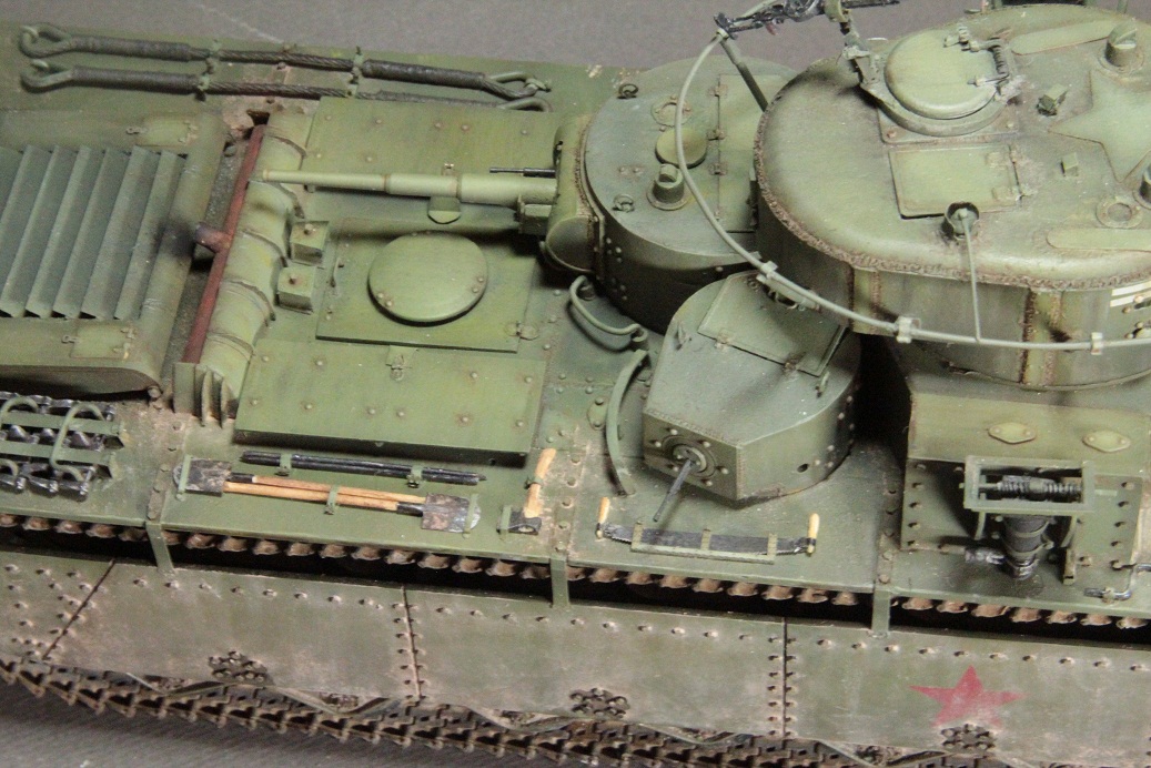 Ни фига себе "искаропка"! Переделано практически все, что надо переделывать. Если клепка чуток и переразмерена, то на модели такого размера это оправданно, иначе масштабная клепка просто будет сливаться с поверхностью... Окраска, наоборот, мне понравилась - вс довольно реалистично, без всяких "художественно-попугайских" эффектов. Ведь реальная машина - это все зеленое и грязно-пыльное, без всяких тонировок, масляных точек и сухой кисти. Единственно, кое-где, на мой взгляд, сварные швы толстовато выглядят... Но тем не менее отличная работа над очень непростой и объмной моделью (сам все не рушусь Т-35 начать).