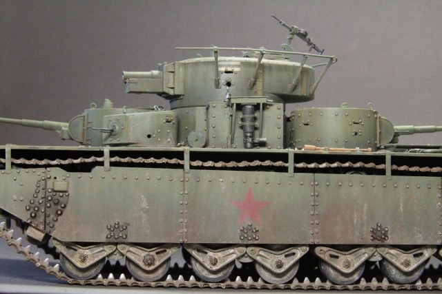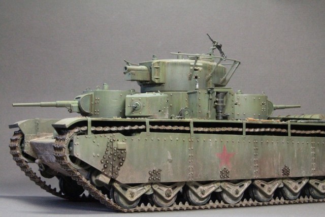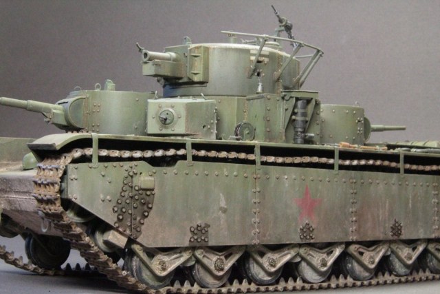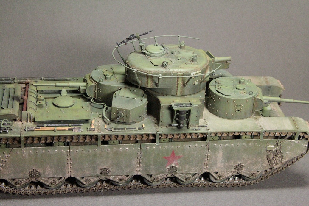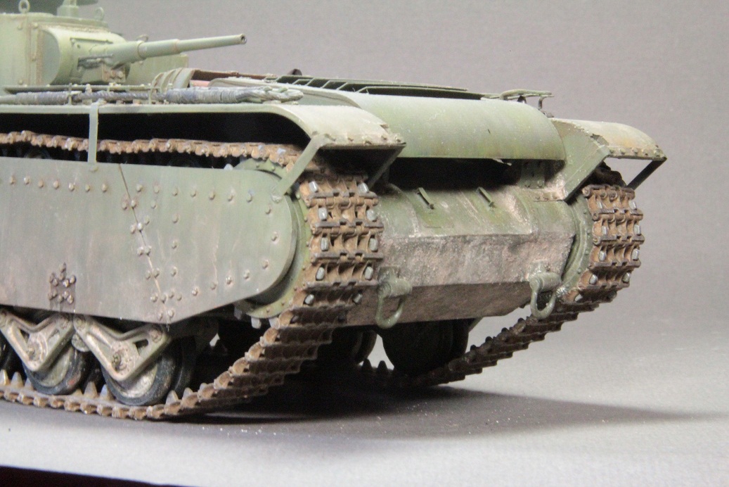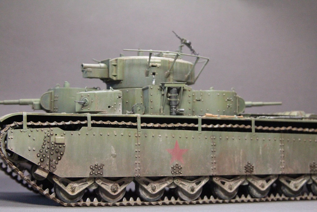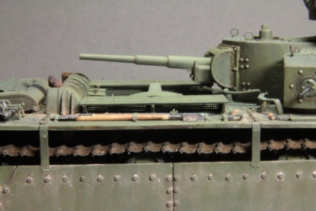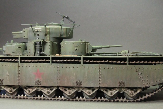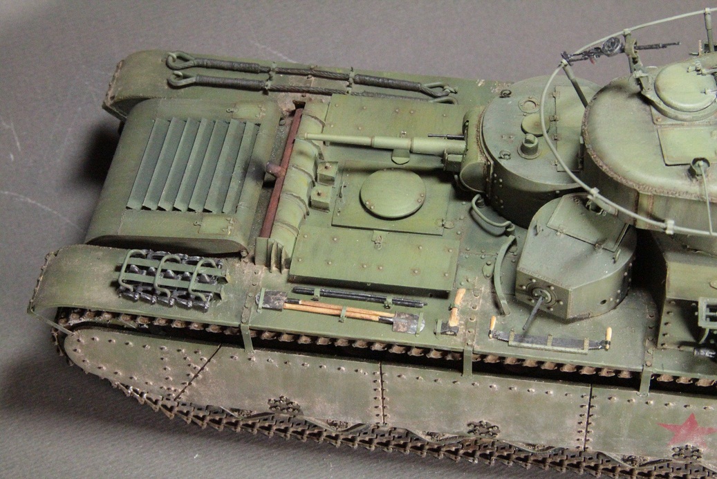 Ни фига себе "искаропка"! Переделано практически все, что надо переделывать. Если клепка чуток и переразмерена, то на модели такого размера это оправданно, иначе масштабная клепка просто будет сливаться с поверхностью... Окраска, наоборот, мне понравилась - вс довольно реалистично, без всяких "художественно-попугайских" эффектов. Ведь реальная машина - это все зеленое и грязно-пыльное, без всяких тонировок, масляных точек и сухой кисти. Единственно, кое-где, на мой взгляд, сварные швы толстовато выглядят... Но тем не менее отличная работа над очень непростой и объмной моделью (сам все не рушусь Т-35 начать).