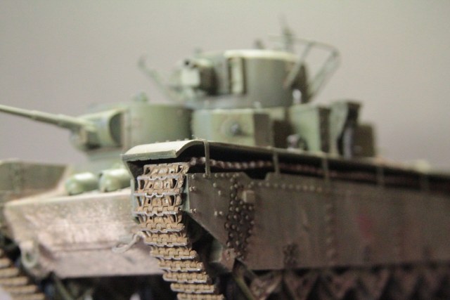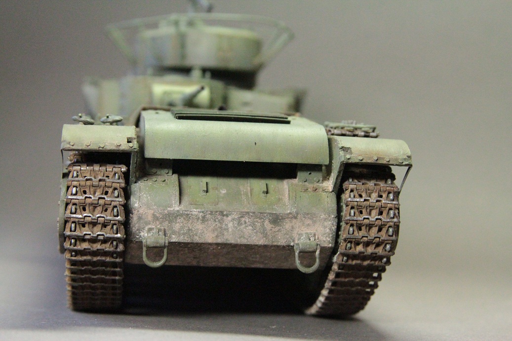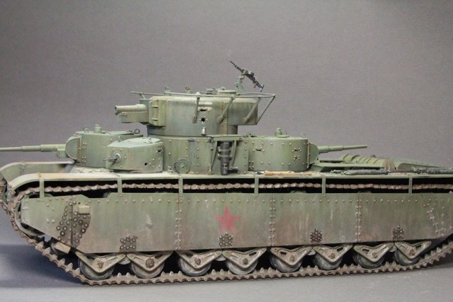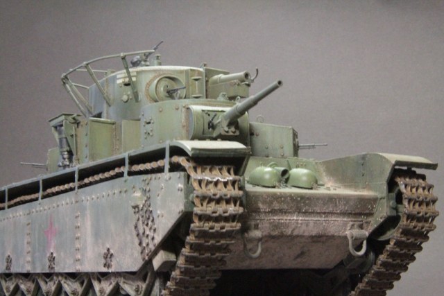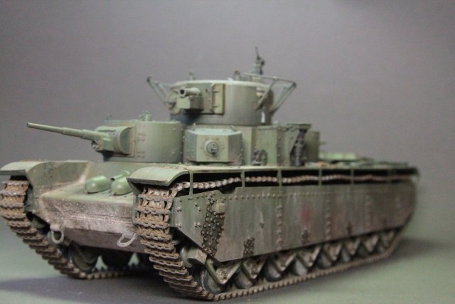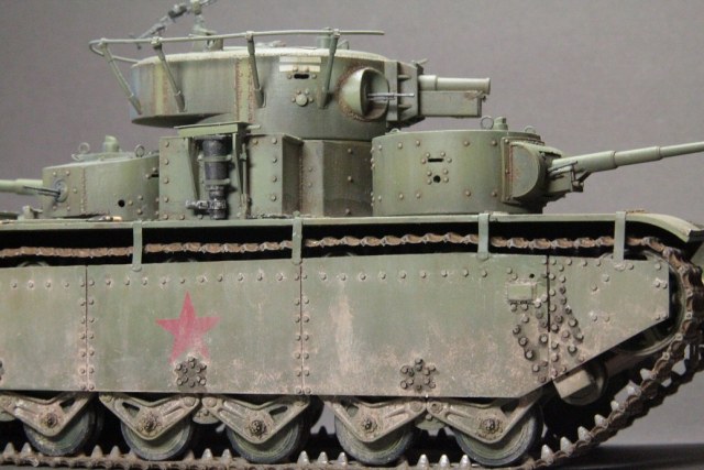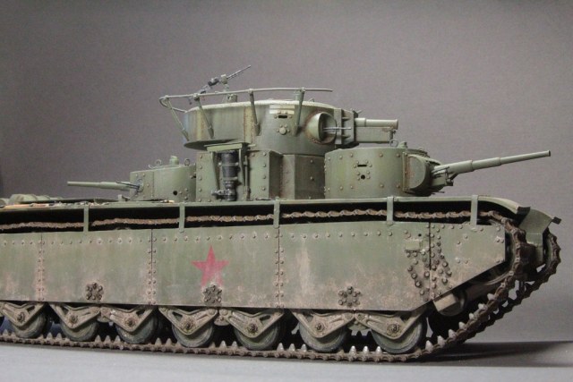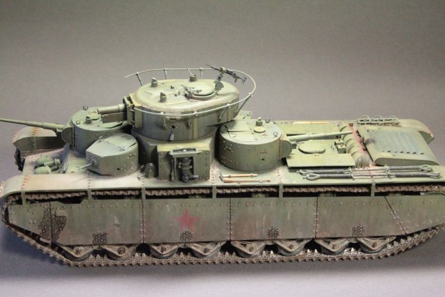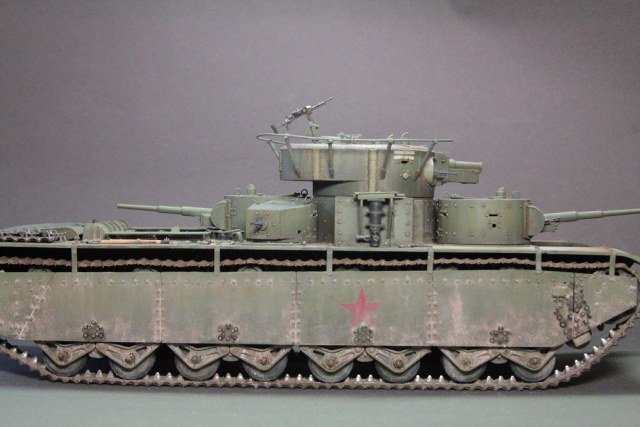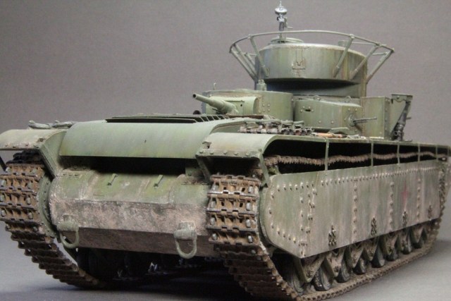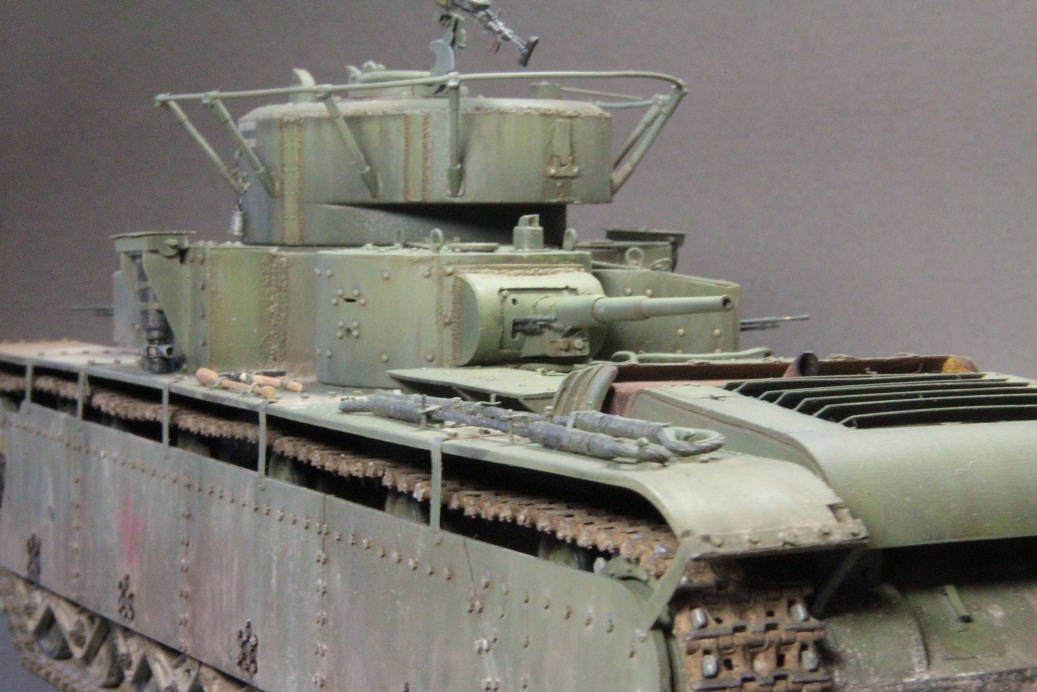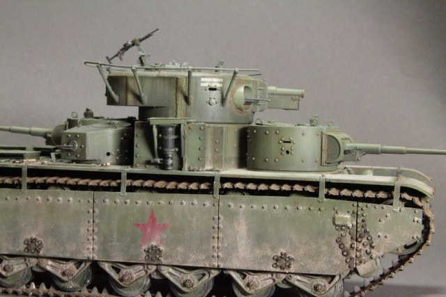 Ни фига себе "искаропка"! Переделано практически все, что надо переделывать. Если клепка чуток и переразмерена, то на модели такого размера это оправданно, иначе масштабная клепка просто будет сливаться с поверхностью... Окраска, наоборот, мне понравилась - вс довольно реалистично, без всяких "художественно-попугайских" эффектов. Ведь реальная машина - это все зеленое и грязно-пыльное, без всяких тонировок, масляных точек и сухой кисти. Единственно, кое-где, на мой взгляд, сварные швы толстовато выглядят... Но тем не менее отличная работа над очень непростой и объмной моделью (сам все не рушусь Т-35 начать).
