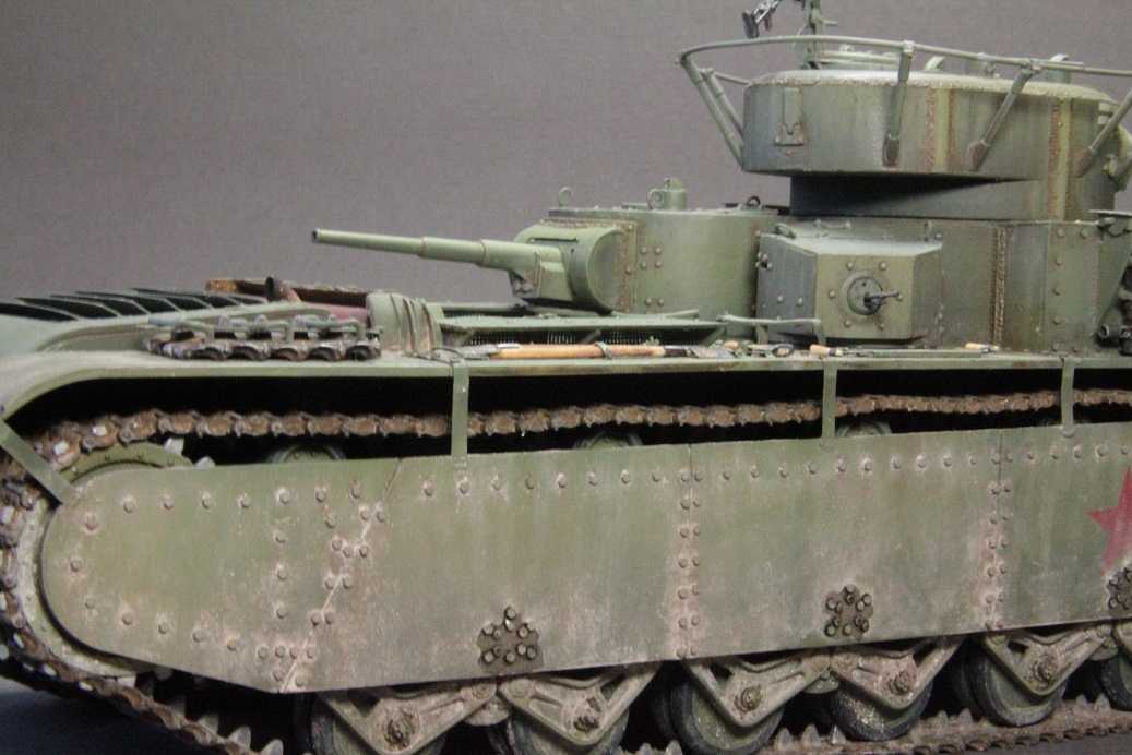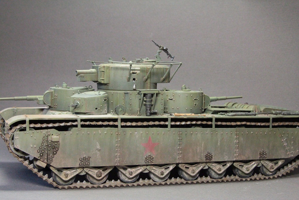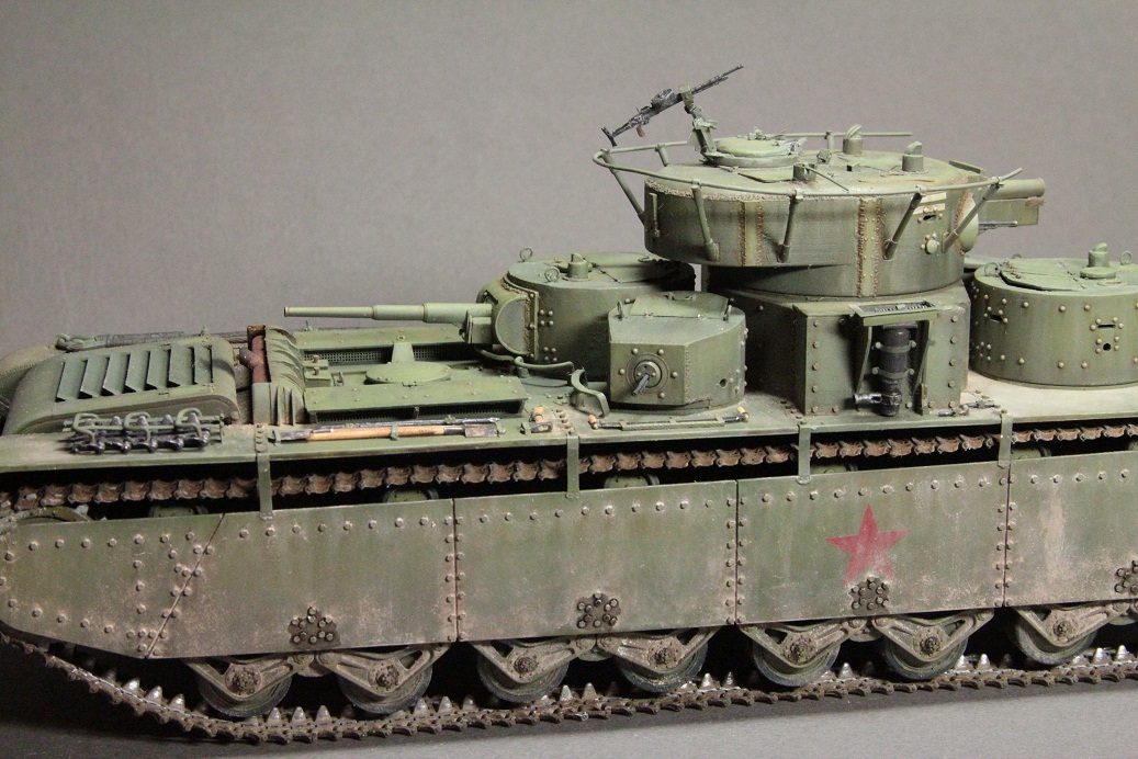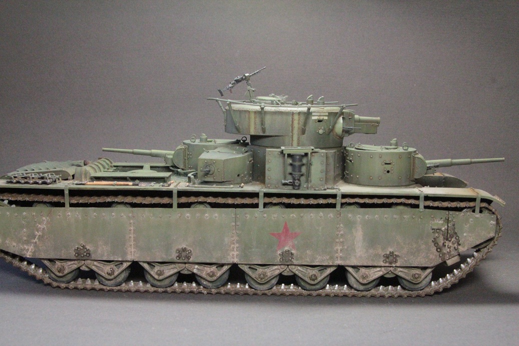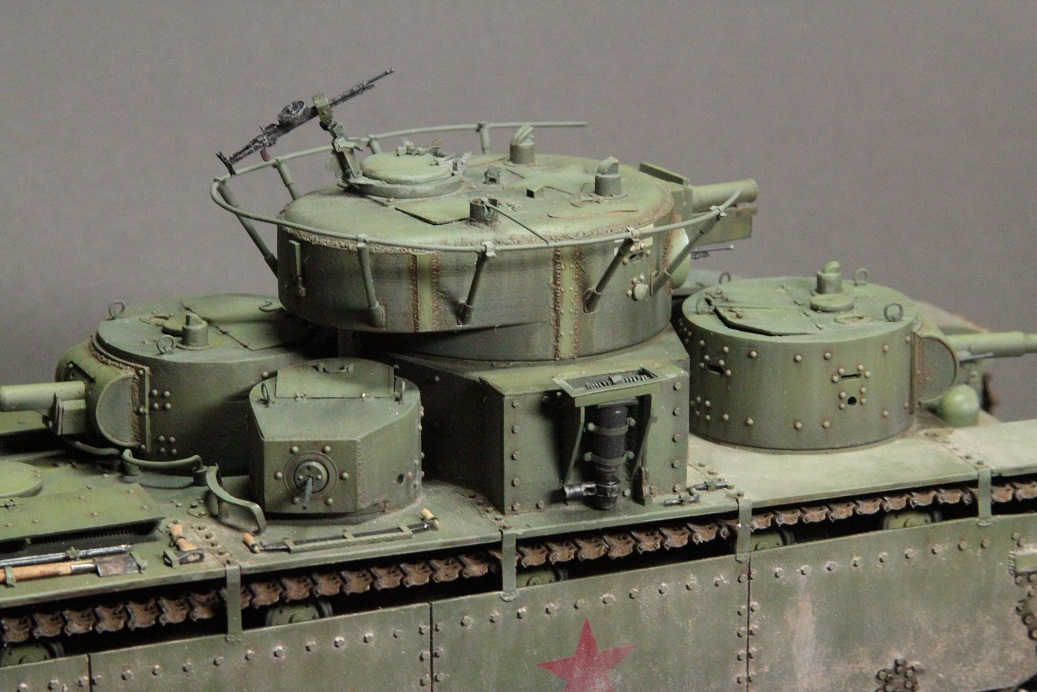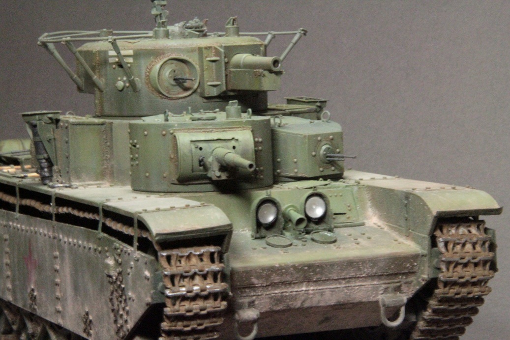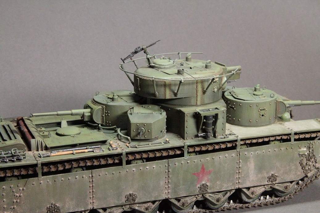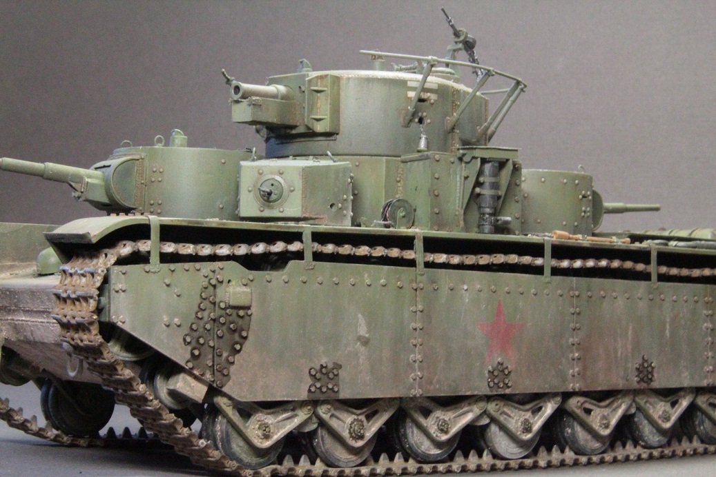 На этот раз это Т-35 от фирмы ICMо качестве набора говорить не буду это давно всем известно, но я попытался собрать, что, то похожее на танк 36го года. В работе были использованы стволы пулемёты модел поинт ,фототравление эдуард, траки фриул, зглушки пистолетных портов вояджер, клепки мастерклаб, красил тамией, пылил мигом и wilder, смывка тамия, эффекты АК.