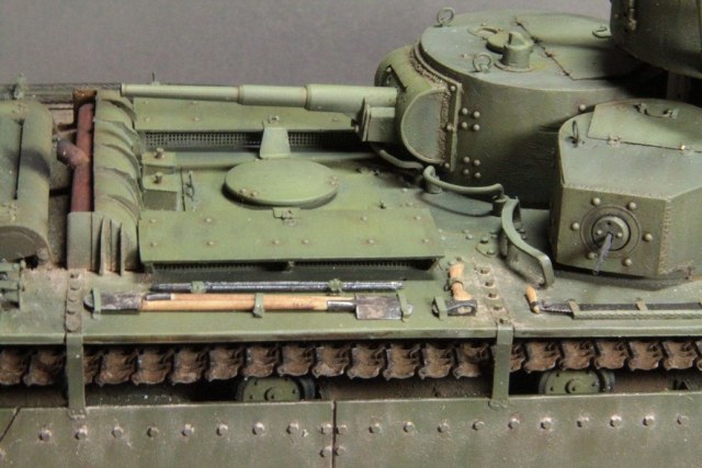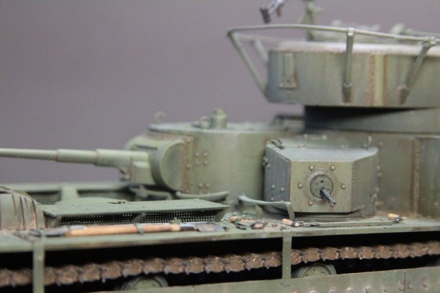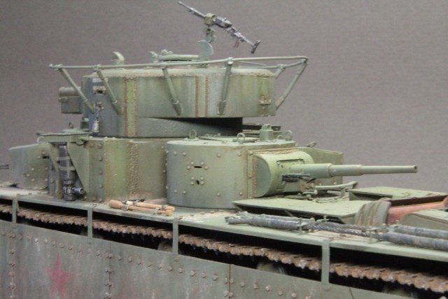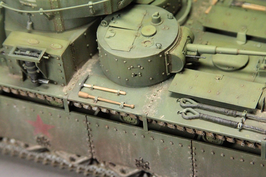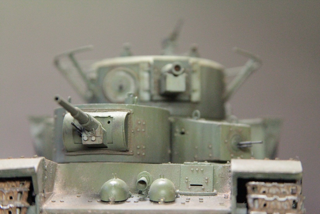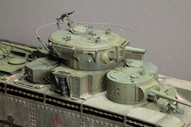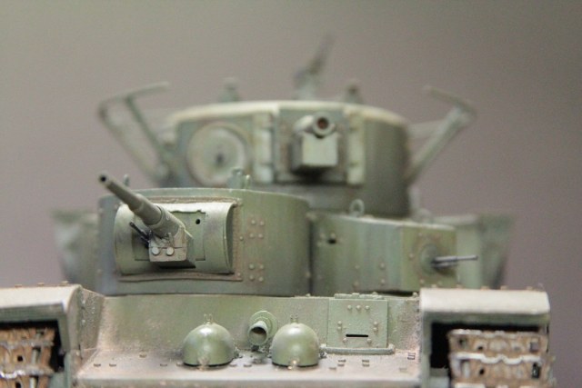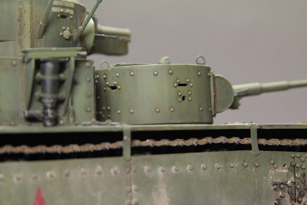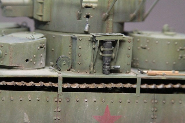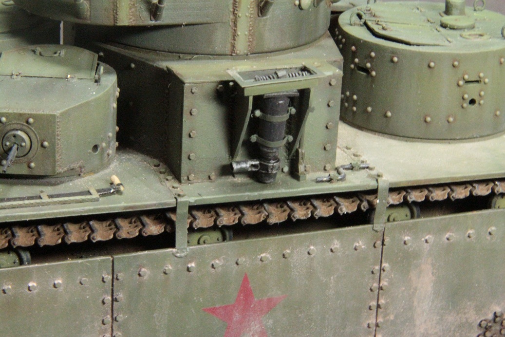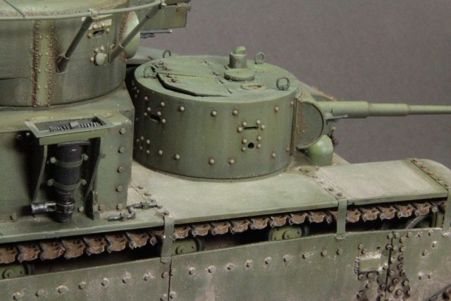 -главная башня: переделаны перископы(не совсем копийно), доработаны все люки, убрана пулемётное гнездо и поставлена заглушка , на маске орудия добавлены не достающие клепки и барашки, заменён ствол, изготовлены крепления для поручневой антенны и сама антенна , поставлены заглушки пистолетных портов (вояджер), заменена клёпка, и добавлена сварка.