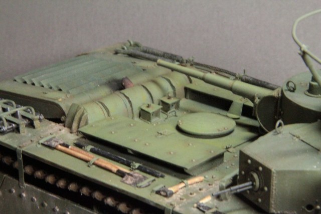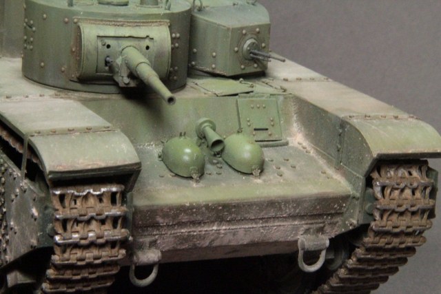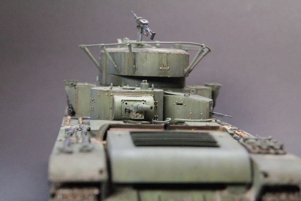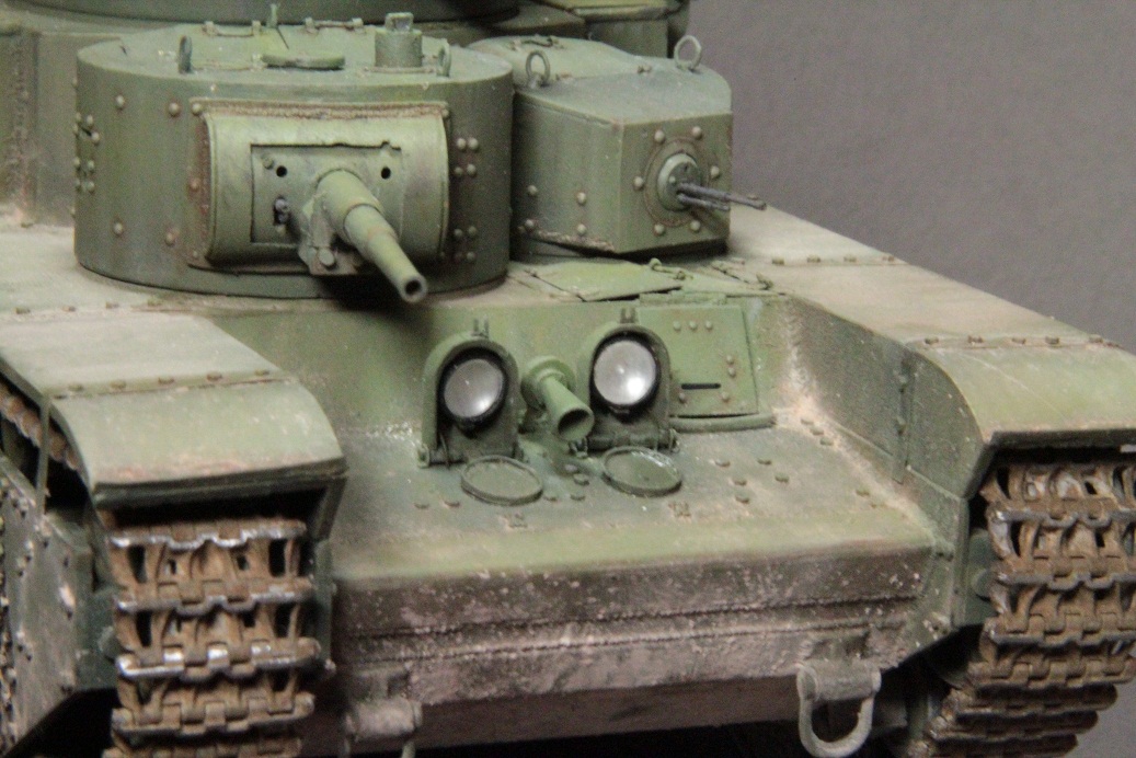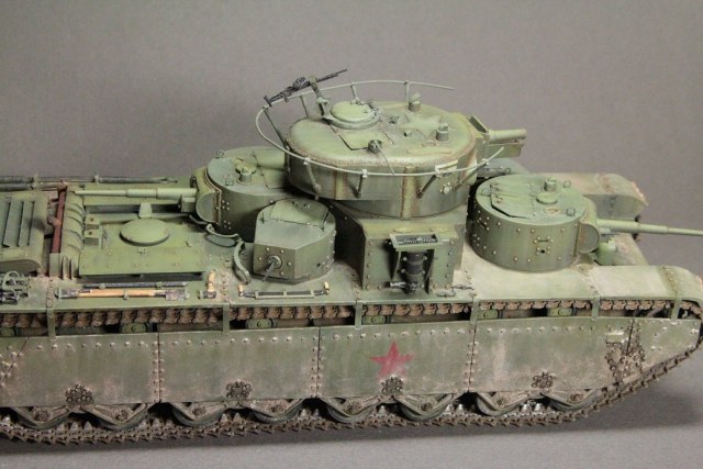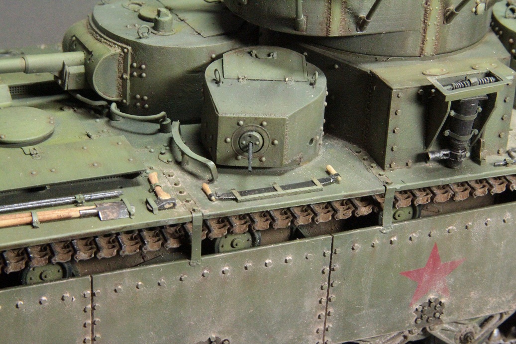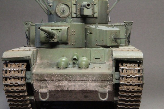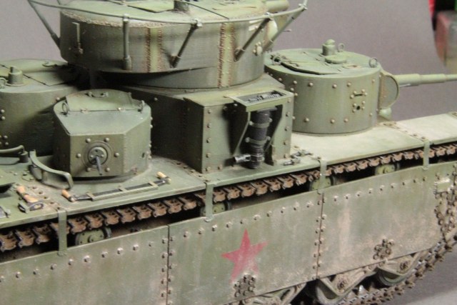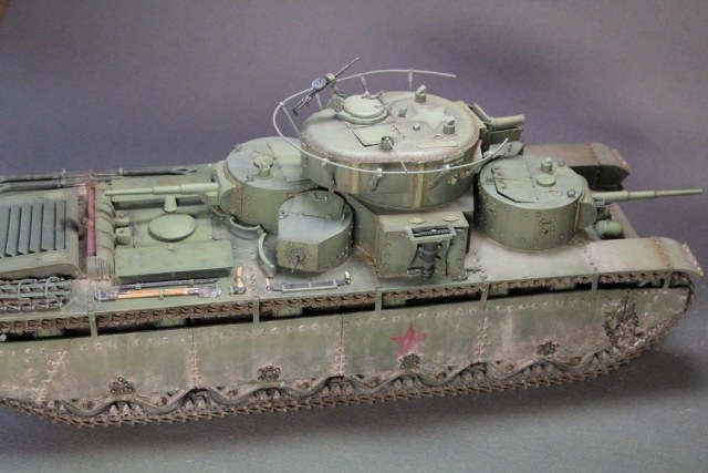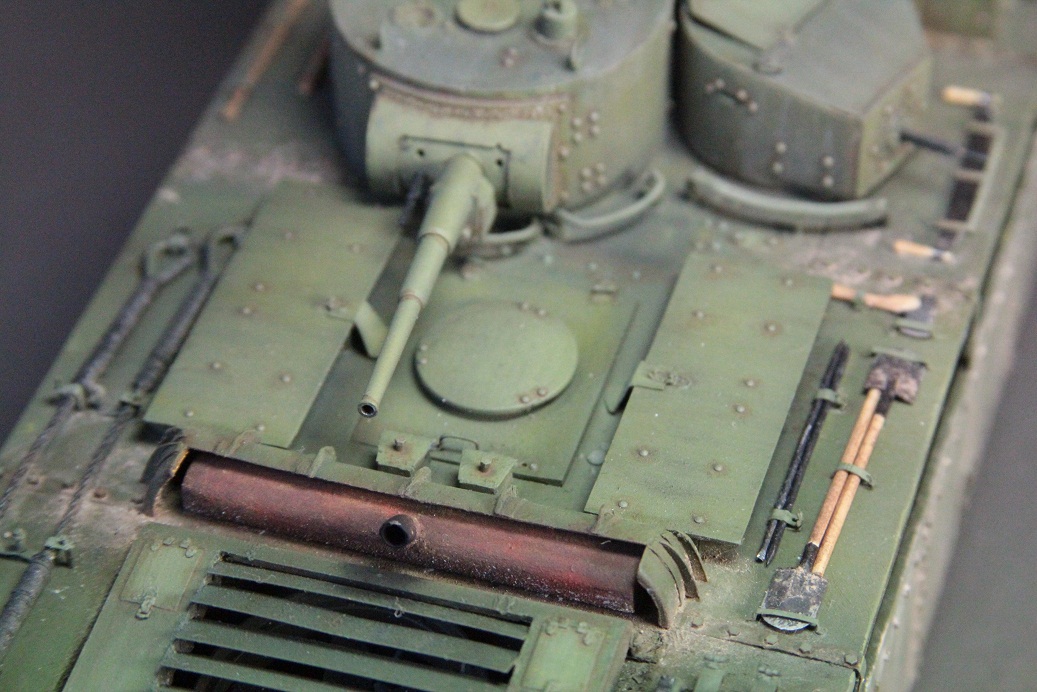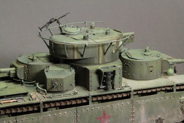 -главная башня: переделаны перископы(не совсем копийно), доработаны все люки, убрана пулемётное гнездо и поставлена заглушка , на маске орудия добавлены не достающие клепки и барашки, заменён ствол, изготовлены крепления для поручневой антенны и сама антенна , поставлены заглушки пистолетных портов (вояджер), заменена клёпка, и добавлена сварка.