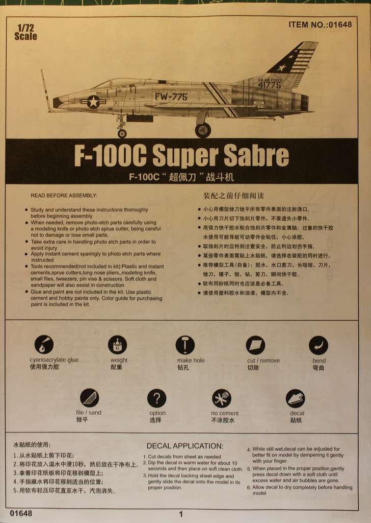 Модель супер сейбра от трумпетера, впервые держу в руках пластик этого производителя и впечатления самые положительные. утяжин, недоливов, облоя не обнаружено вообще , даже самые маленькие детальки отлиты очень хорошо и без смещений, видимо мне наконец повезло и это отливки из ранних серий, хотя судить не берусь может и все экземпляры этого производителя именно такого качества. в наборе 164 детали. подробности инструкции и вариантов оформления видно на фото, к сожалению по нюансам мат части или косякам данного набора ничего сказать пока не могу. надеюсь обзор будет кому-нибудь полезен.