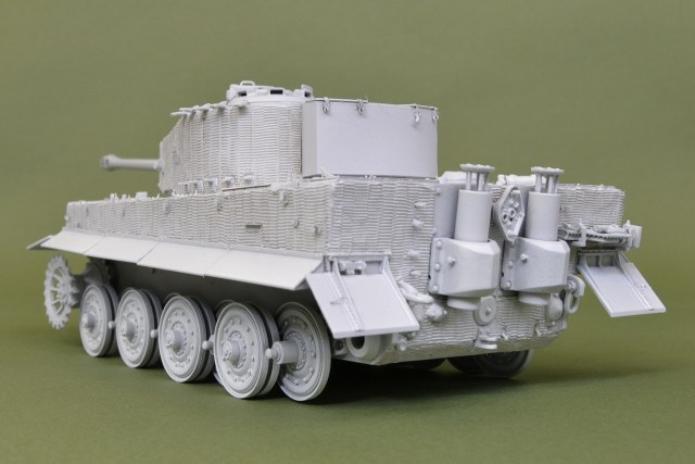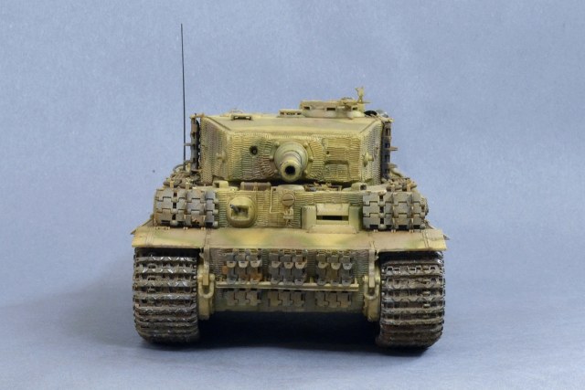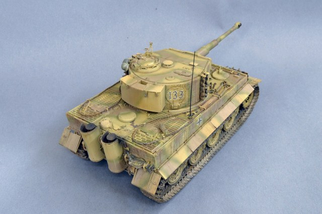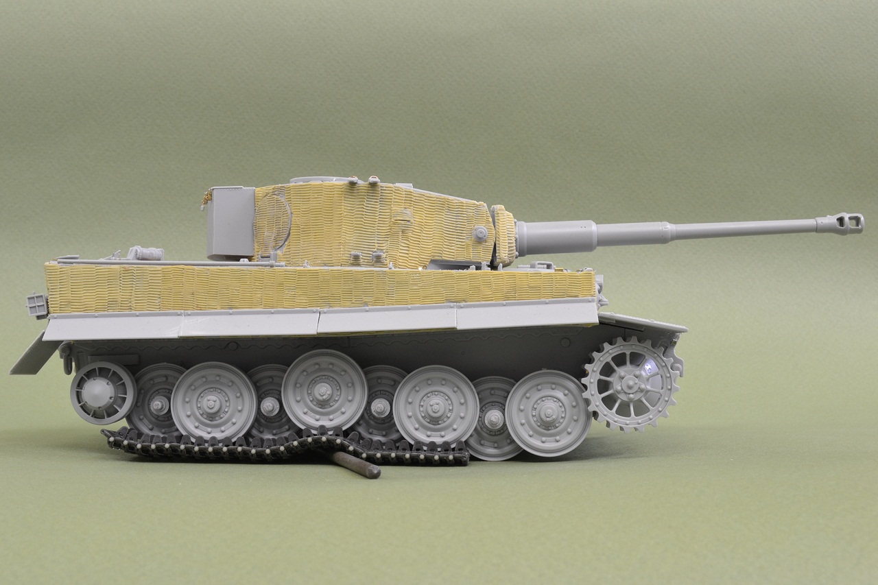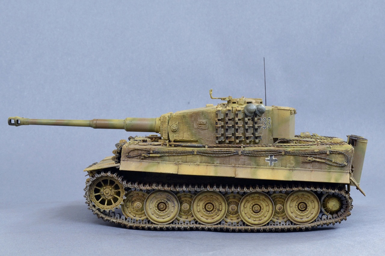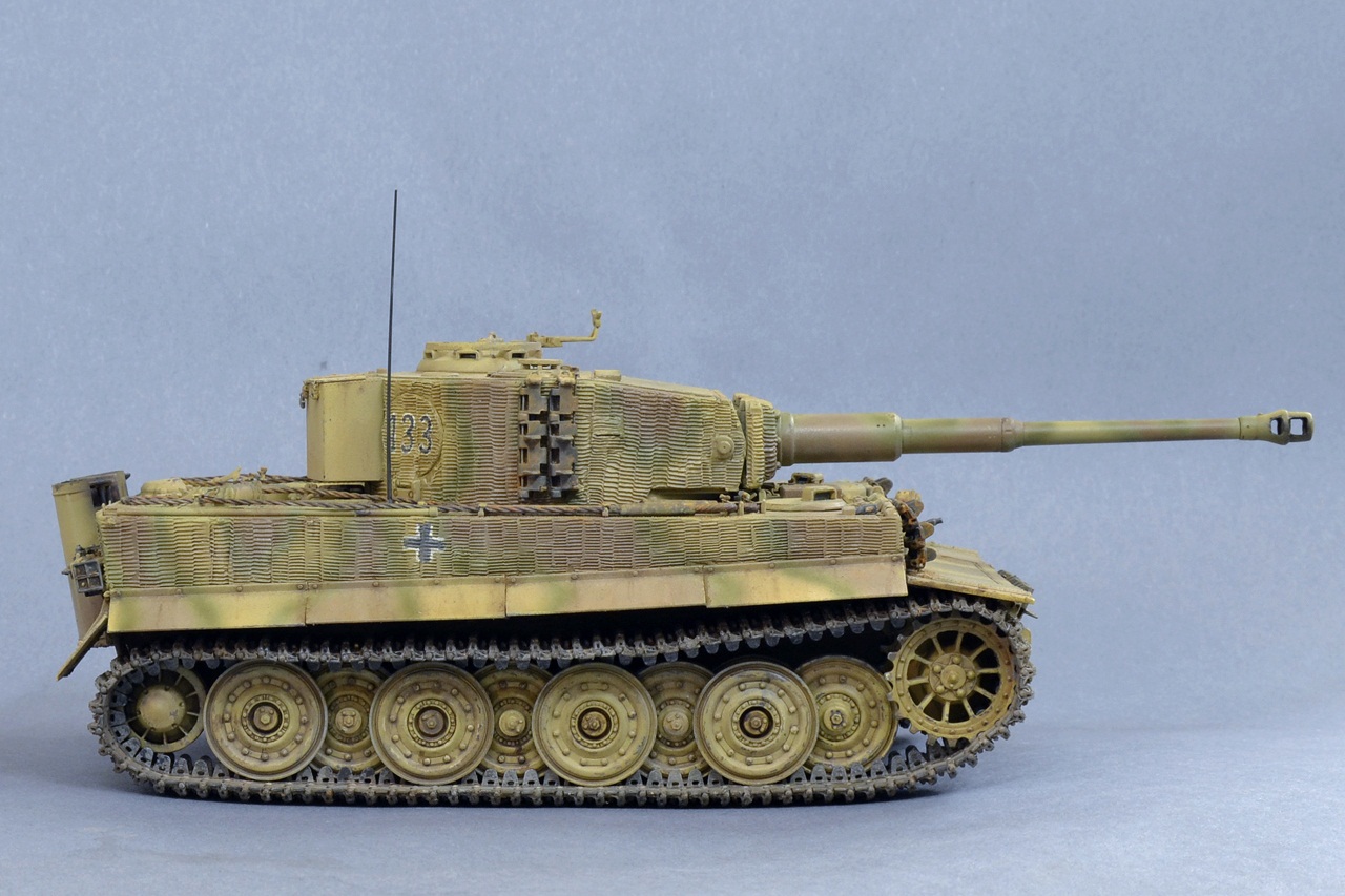 Летом 44 года пришли последние серийные тигры в только что созданный 510 тяжёлый танковый батальон.Я попробывал сделать машину из 3 взвода 1 роты этого батальона, взял кит от Dragon`a № 6406, накатал циммерит из двукомпонентной шпатлёвки от Тамии накатчиками от Моделкастен, соорудил оригинальное крепление запасных траков, характерное для 1 роты, сделал крепления передних брызговиков, на надмотрной плите наставил петель для крепежа брезента, траки Мастерклаб, подвеску сохранил рабочую, правда веса самой модели не хватило, пришлось внутрь вклеить свинцовые грузики, изменил крой переднего среза крыши башни. И вот что получилось.