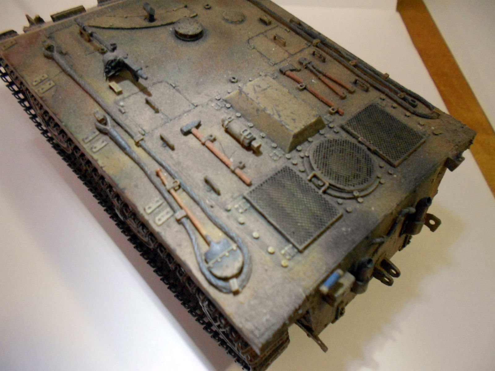 щель между лобовыми листами, чтоб у мехвода ноги не потели? буксировочные тросы лучше заменить, катки металиком натереть надо. зачем грязь на корпусе зачем сухой кистью натерли?