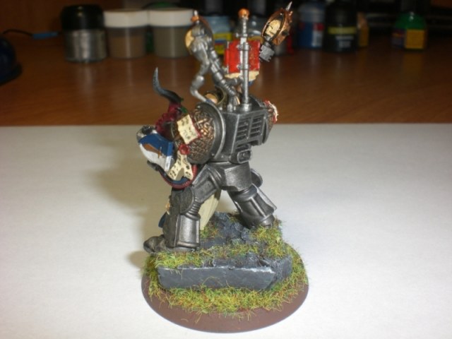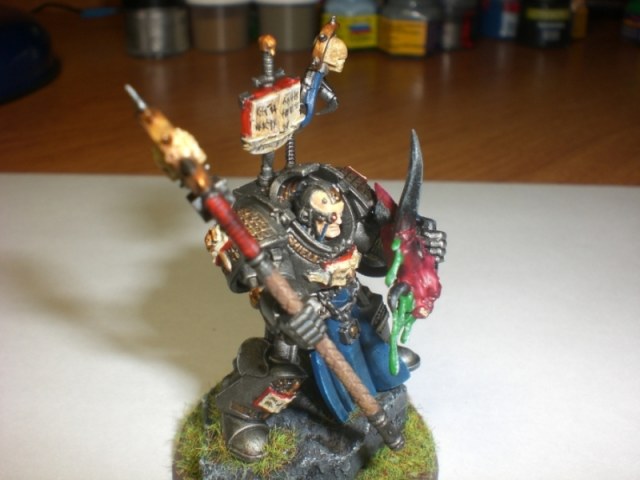 Первоначально предполагал, что он будет держать её ровно и слизь будет естественно стекать, но в ходе сборки( просто я крашу отдельно) получилось что голова демона боком, и слизь неестественно течёт в бок градусов на 30 )) Пришлось сгибать её, имитируя, будто бы библиарий мотает отрубленной головой, и первоначально вытекающая ровно слизь, поменяла направление.......фуф, сам запутался пока объяснял))