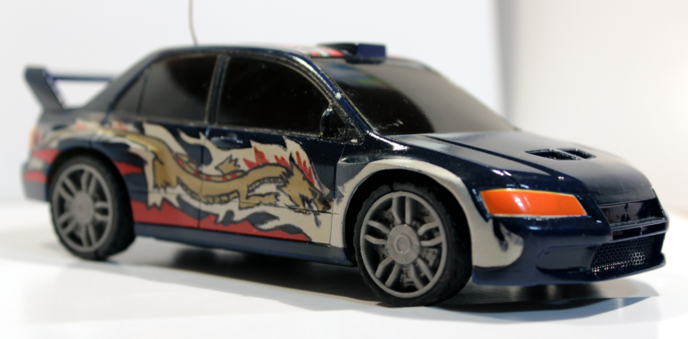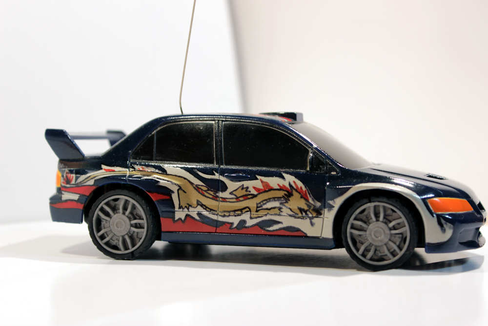 Взяли в руки наждачку и ободрали полностью все наклейки с кузова машины. Клей противный, долго отмывался. Затем грунтовка, покраска несколькими слоями Angel CF-8, добавил лак Angel К-84, немного темнее стала. Аэрография из NFS. Наносил трафаретами, черный контур маркером, но немного потек при нанесении поверх заключительного слоя лака Tamya. Вот собственно. Теперь у младшей дочери свой болид по квартире носится.