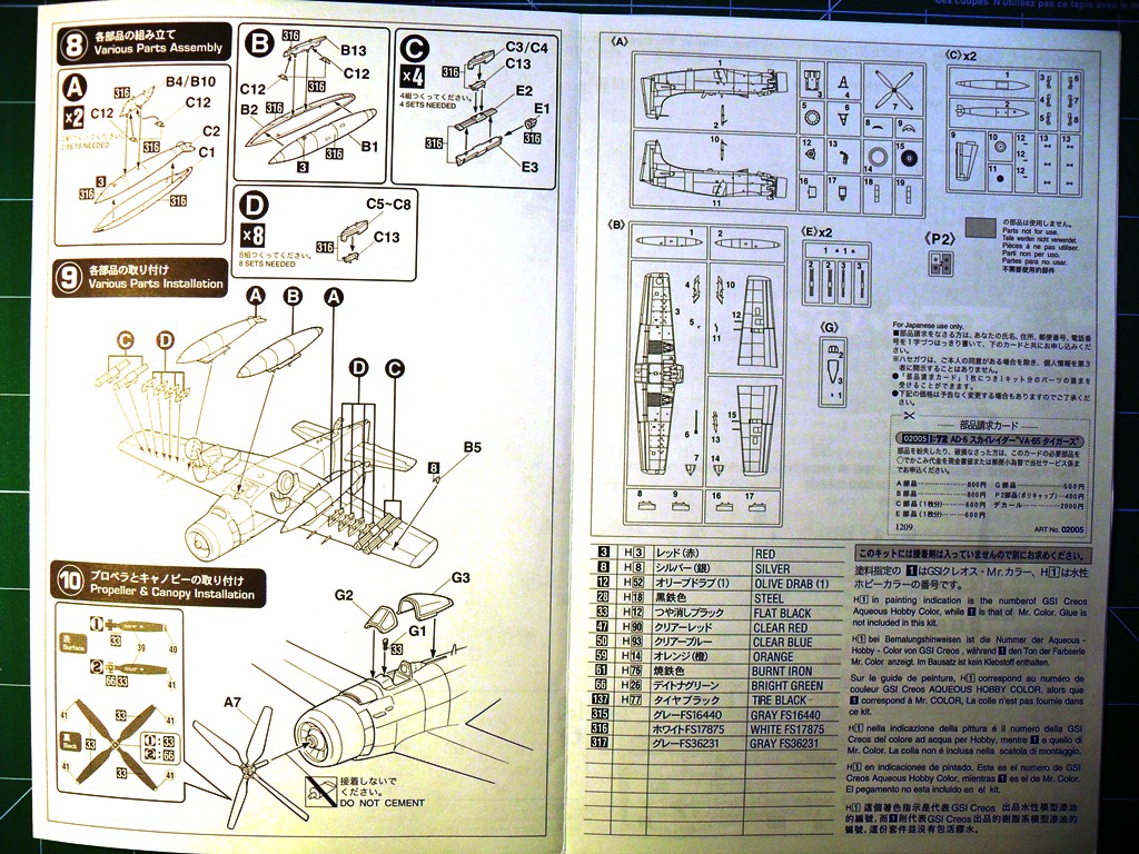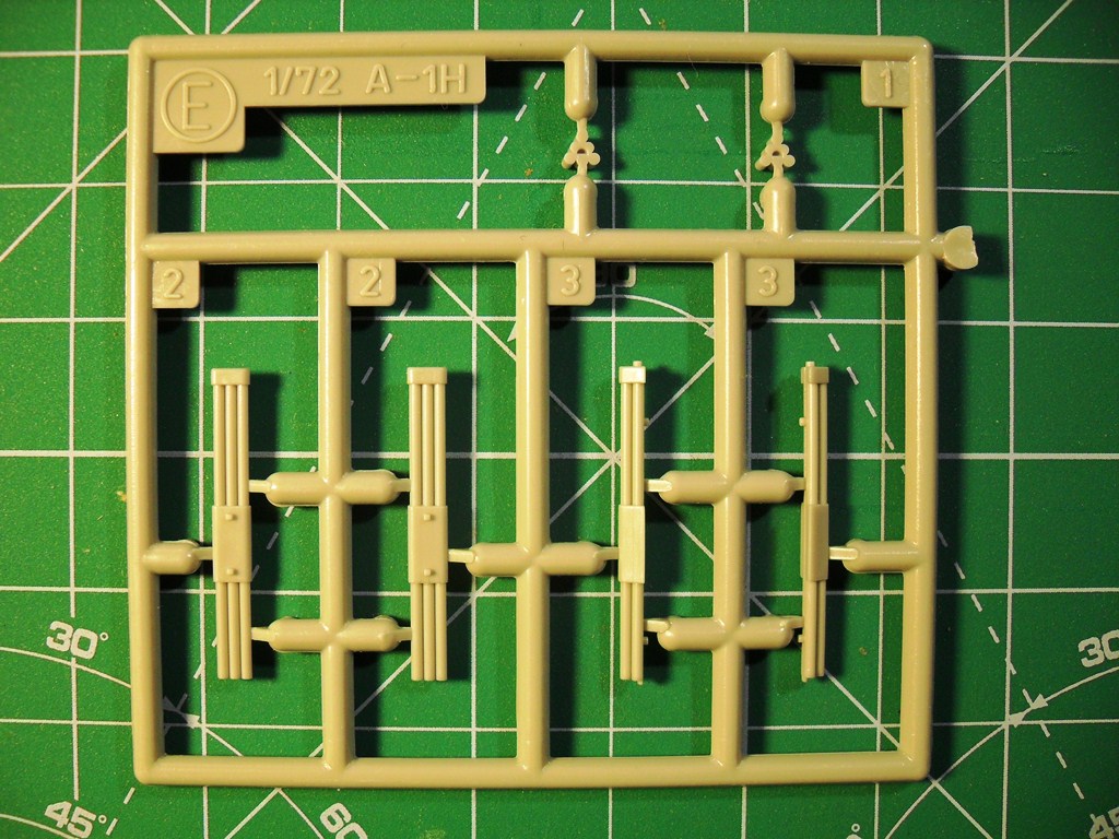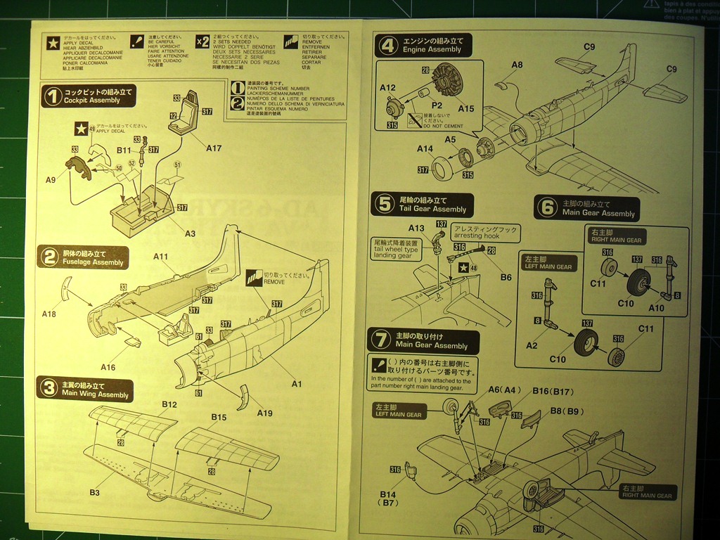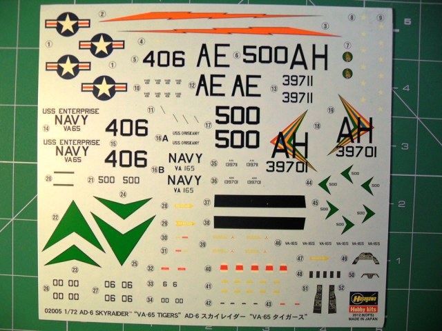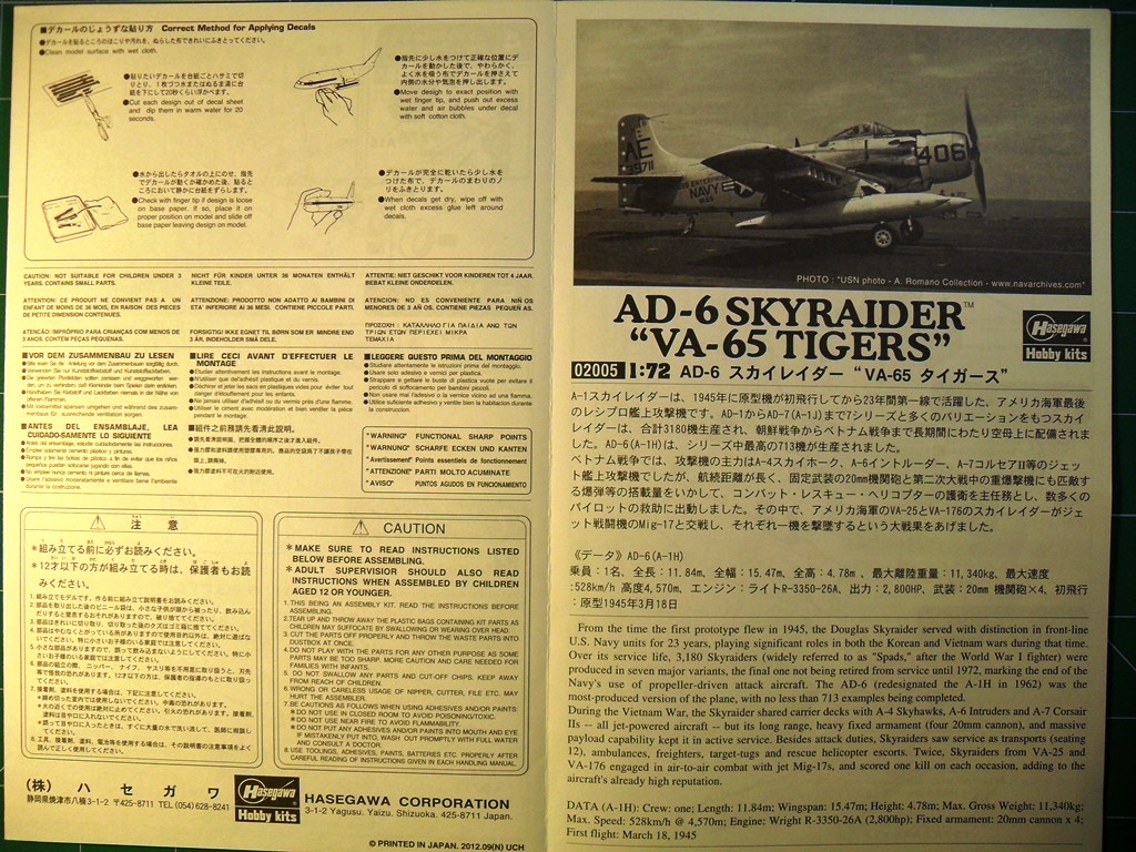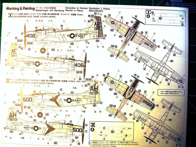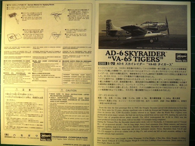 Палубный штурмовик ВМФ США Дуглас АD-6 дальнейшее развитие самолета А-1.Применялся в войне во Вьетнаме для непосредственной поддержки морской пехоты США в условиях джунглей и точечных ударов по пехоте противника при бое столкновении в непосредственной близости от своих позиций.Модель будет интересна любителям палубной авиации США.Коробка выполнена из твердого картона.На лицевой стороне изображен самолет перед взлетом.Инструкция показывает основные этапы сборки подробно.Схеме окраски и нанесения декалей на два варианта.Цвета краски даны в привязке к Mr.Color.Детали модели даны на семи литниках,один прозрачный с остеклением фонаря кабина.Пластик основных деталей светло-серый,не слоится,хорошо обрабатывается режущим инструментом и наждачной бумагой,после обработки хорошо полируется.Кабина пилота дана упрощенно, декалями обозначены приборная доска и боковые пульты управления,кресло пилота очень упрощено.Двигатель почти не детализирован, отдельно дан картер.Так как жалюзи даны в закрытом виде двигателя практически видно не будет.Основные колеса шасси даны двумя деталями стойки ровные без смещений пресформы,хвостовая опора отлита в одну деталь.Выхлопные патрубки отлиты в одну деталь с фюзеляжем.Вооружение представлено четырьмя базуками.Имеются три подвесных бака.Неплохо сделаны пилоны подвески боевой нагрузки.Облоя и утяжин практически нет,следов толкателей на наружних поверхностях не наблюдается.Модель для своего возраста очень хорошая.