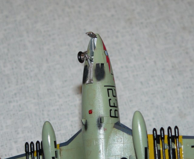 Сборка трудностей не вызвала, за исключением заделки стыка хвостовой части фюзеляжа (получалась небольшая ступенька) и стыков на бортах кабины. При сборке допустил промах, когда собрал фюзеляж, прикинул центр тяжести, и подумал, что груз в нос не нужен. Но после установки шасси оказалось, что груз был как раз таки очень и нужен))) К этому времени модель была собрана, окрашена и обдекалена, по этому, вскрывать фюзеляж не было возможности. По этому пришлось ложить грузы в баки, и сверлить отверстие за спинкой кресла пилота, сыпать туда дробь, и заливать клеем (взял поливиниловый клей "Титан", не едкий к к пластику и краске, и прочный.) Результат меня удовлетворил.