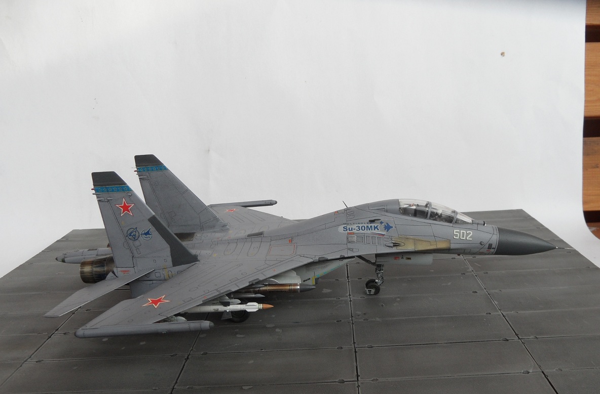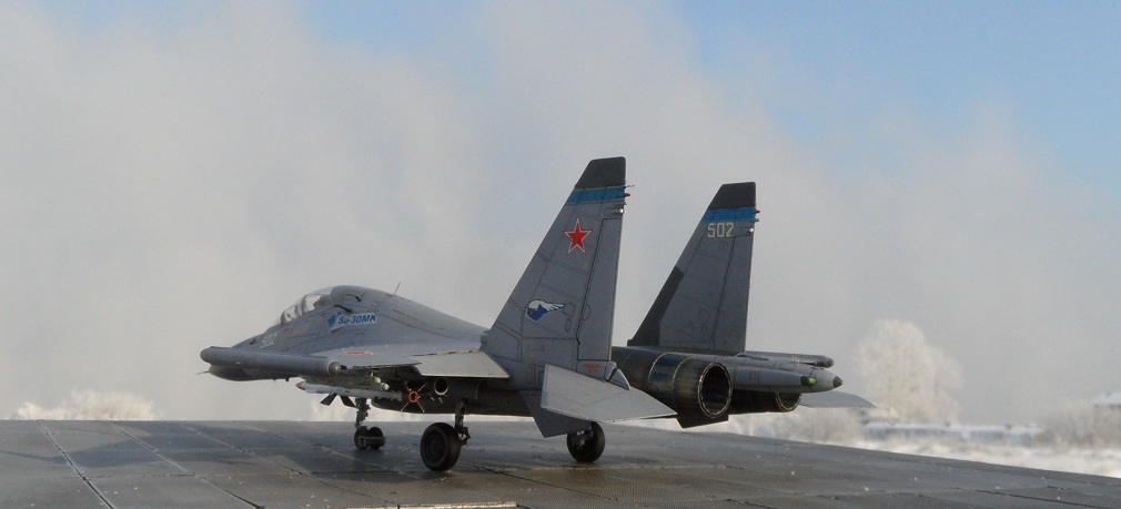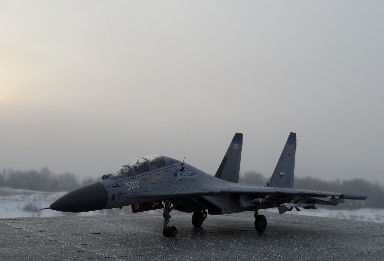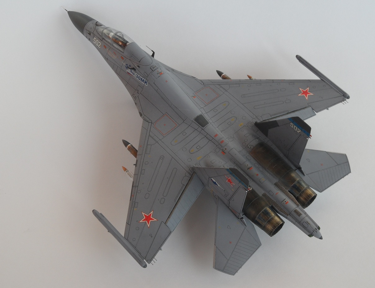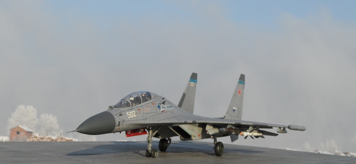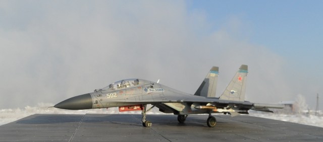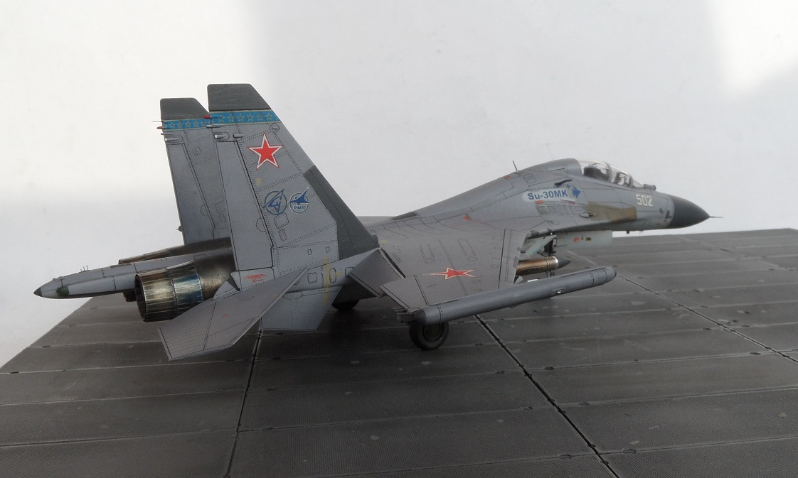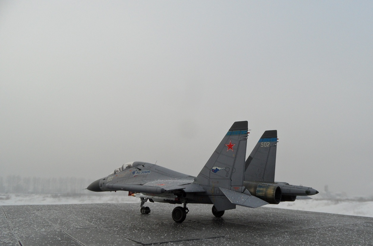 Всем привет! Представляю вашему вниманию очередную работу- Су 30мкк, построить сей самолет мечтал давно. По сборке набор несоставил трудностей, за исключением шва на стекле, и перехода на носовой части- стыковка пресс форм. В отношении матчасти проблемы имеются- весьма странно, ведь самолет то в китае известен до болтика. Самолет мне помог приобрести Владимир , за что ему ОГРОМНОЕ СПАСИБО! , иначе я бы его еще только начал строить. При постройке были доработаны и переделаны- стойки шасси, колеса экипаж, отпилены закрылки, доработал немного ниши шасси, пушка- игла шприца, использовано травление Дрим Моделс, ПВД-Дрим Моделс, сопла из металла-Дрим Моделс, кстати с соплами вышел косяк, потерял одну внутреннюю часть, пришлось делать залипуху из штатных сопел- тупо вставил их в металлические, так же испортил покрышки на задних колесах, пришлось штатные колеса просверлить и в них вставить экипажевские диски. Травление здорово преобразило модель и помогло в постройке, вообще от работы с Дрим Моделс только положительные эмоции))). Так же я заметил что почти все игнорируют маленькое отверстие по правому борту над воздухозаборником- оттуда выбрасываются гильзы от пушки ГШ, ну и еще по мелочам. В общем это все доработки- миллиметры неловил, помойму самолет похож на себя, потому меня он устроил на все сто. В кабине летчики из набора пилоты нато от Хасегавы. Ракеты повесил временные, раззорился на дрим моделовские- и на Су 27 сразу повешу). Думаю будут вопросы по декали- декаль бегемот мне досталась бракованной и потому я кое как перевел надпись Су 30 МКК синего цвета, церная просто неотклеилась от основы, обратите внимание- подложка белая, вся декаль переводилась с такой белой основой, часть вообще нехотела отклеиваться. Все почти пришлось резать по контуру, еще хорошо что у меня сохранилась старые остатки такой деки- кое что взял оттуда. Потому косяк. Модель окрашена из баллончика Мотип+ кисть Ревелл. Побежалость изобразил пигментами Тамия. Погода у нас нерадует- 30 и выше, потому фотосессия неслишком уж вышла- руки отмерзают за здравствуй), в общем то и все, приятного просмотра!