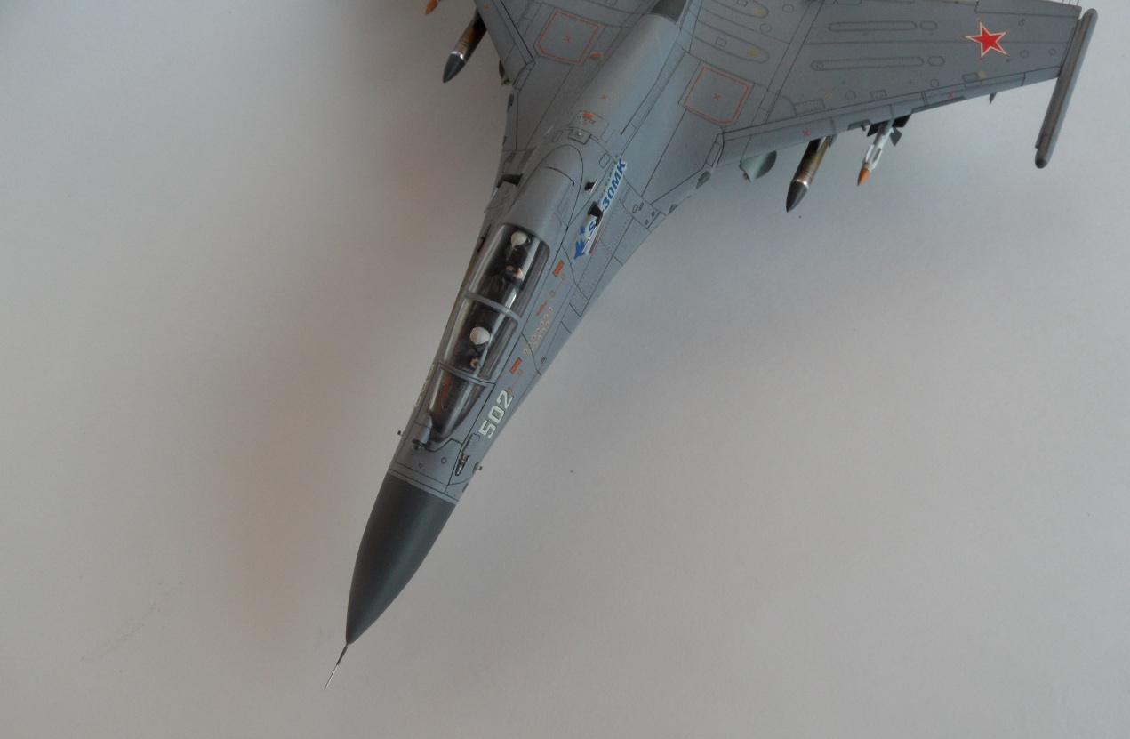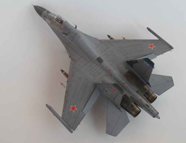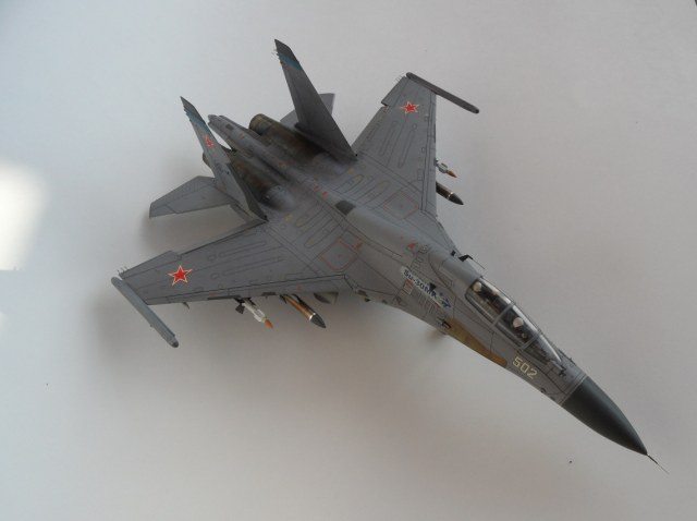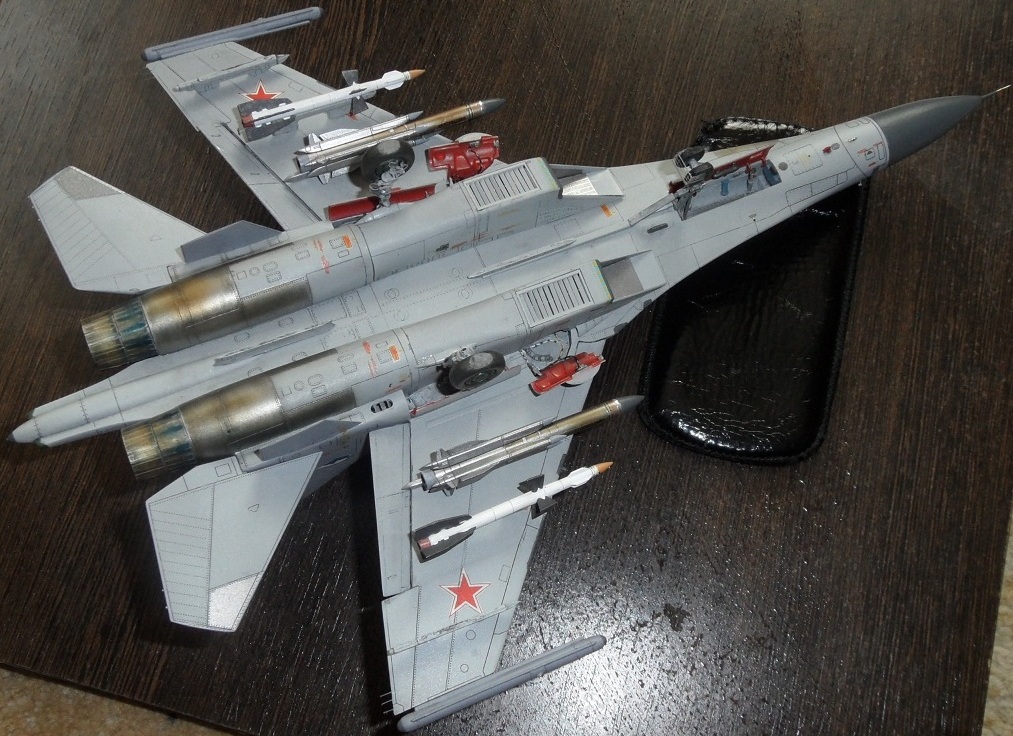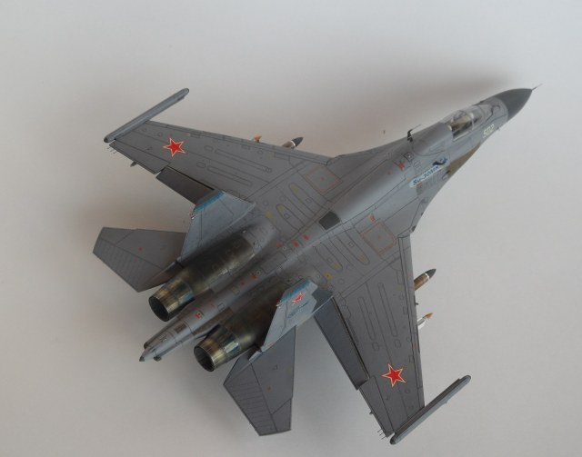 я конечно не профи. но это крик души! я хоть и начинающий моделист, но с детства люблю авиацию, и имею друзей техников, в том числе из липецкого центра, да и сам при каждой возможности посещаю краснодарское училище дабы взглянуть на чудесные руСкие аппараты. поэтому разглядывая эту модель меня не покидала мысль, что самолет на настоящий не похож. причем некоторые детали выглядят просто фантастически правдоподобно - я одни двигатели с соплами 5 минут рассматривал и задавался вопросом: как это покрашено?!! но расшивка... блин, ну я крашу еще как ламер, но настоящие самолеты я видел, в том числе Сухие. ну не бывает такого! даже на ремонтном заводе на самолетах стоящиих под открытым небом. или как некоторые делают прешейдинг на каждую полосочку... и в итоге идеально сделанная модель с великолепной детализацией и мелочевкой, говорящие о высочайших навыках мастера, превращается в обычную детскую игрушку излишней расшивкой. уже и статей с подкрепительными фотографиями массу написали, и все равно, чему бы грабли не учили, а сердце верит в чудеса!)) и я НЕ имею ввиду чудесный обгадинг многих моделей здесь, профессионально выполненный и без использования глубоких и сильно затемненных расшивок. мой непрофессиональный взгляд обывателя великолепный аппарат напрочь загублен ВАЩЕ НЕ реалистичной расшивкой. лучше бы излишние масляные пятна были направленные вниз)) чего тоже не бывает но не так портит))