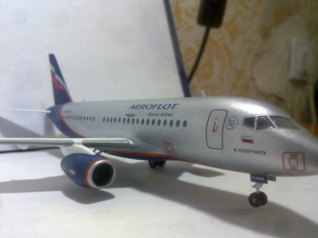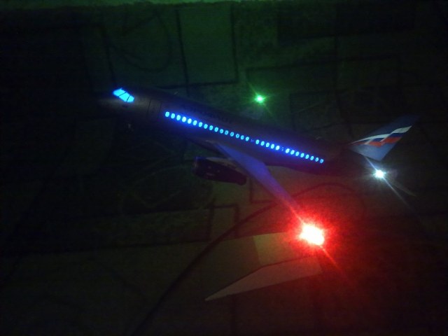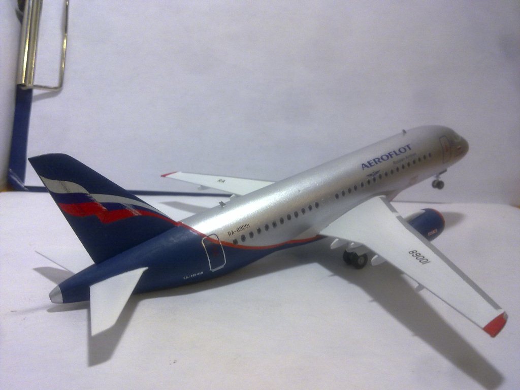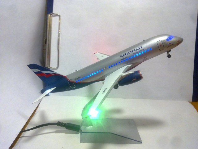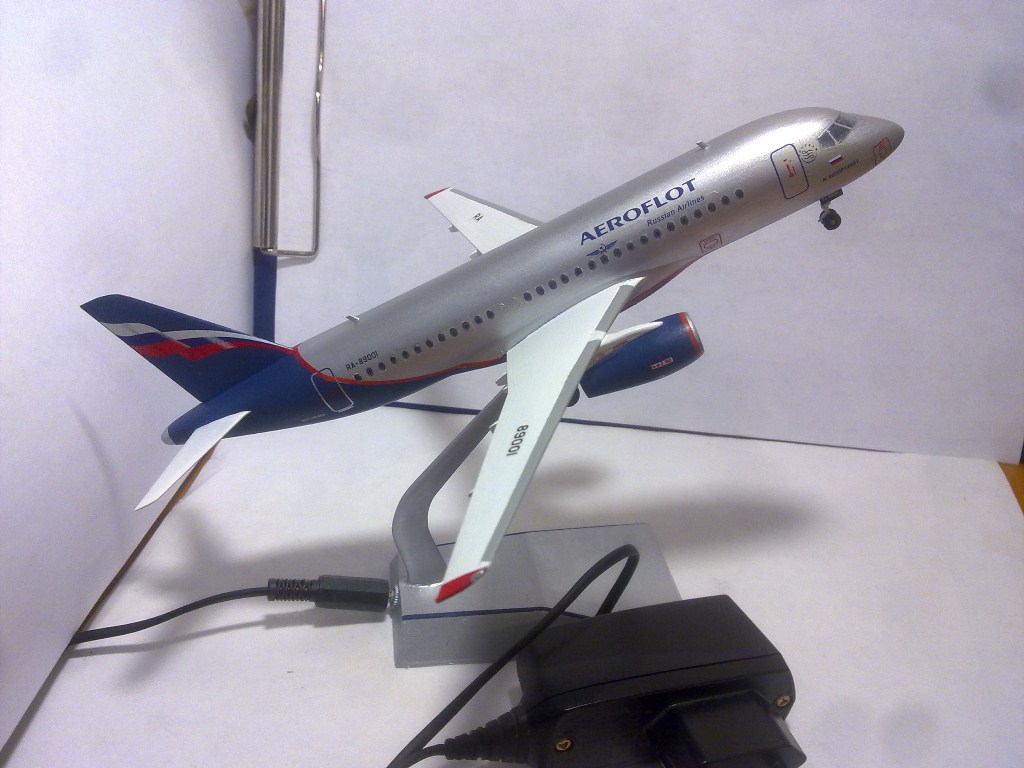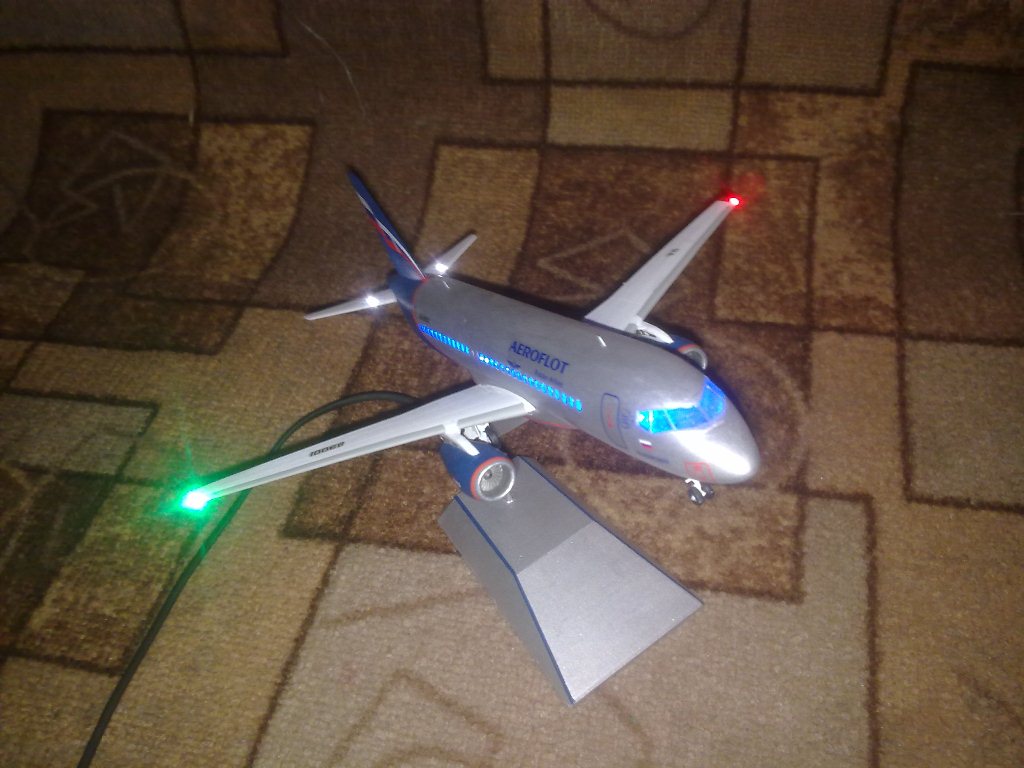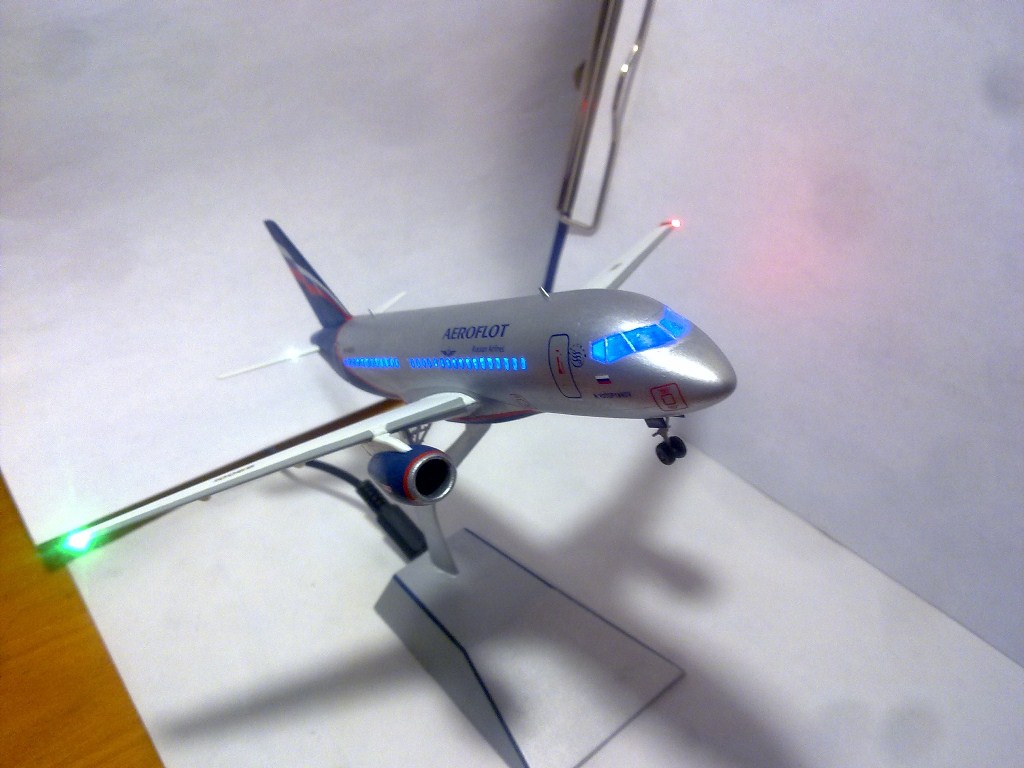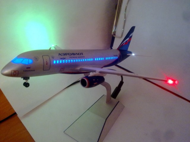 Решил выложить свою модель. Началось с того, что неожиданно увидел в модельном магазине SSJ-100. Ну уж очень захотелось собрать современный лайнер. Модель не первая, но впервые использовал шпатлевку и грунтовку. Все мечтаю об аэрографе, но пока не могу себе позволить. Поэтому красил кистями и краской TAMYA. Смотря на свои модели ночью, очень хотелось их как-нибудь оживить. И поэтому решил сделать с подсветкой(а-ля ночник)). Во время сборки использовал smd-светодиоды, по размеру они очень хорошо подошли к модели, даже удивился когда смог их поставить в стабилизатор и БАНО. Провод использовал из-под шлейфа IDE(жесткий диск). Хотел еще сделать стробоскопные огни, но подумал, что ночью будут мигать и отвлекать внимание. Модель несложная, всего 47 деталей, стыковка проблем не вызвала. Сразу замечу, не получилось полностью скрыть шов стекло-фюзеляж. Еще опыта надо бы.В общем жду критики, советов. Спасибо всем)