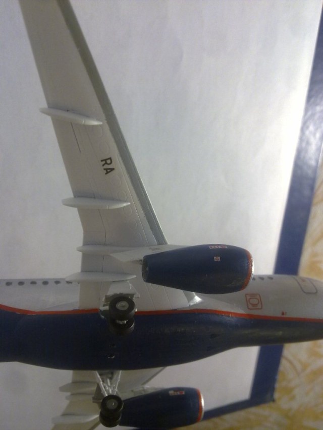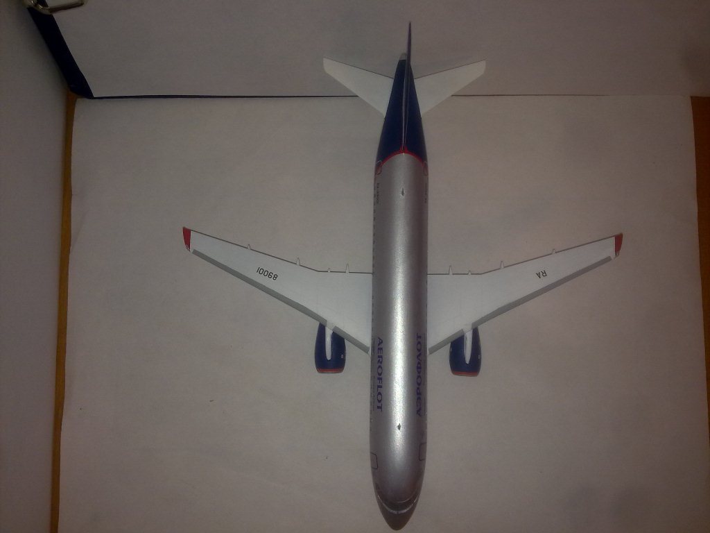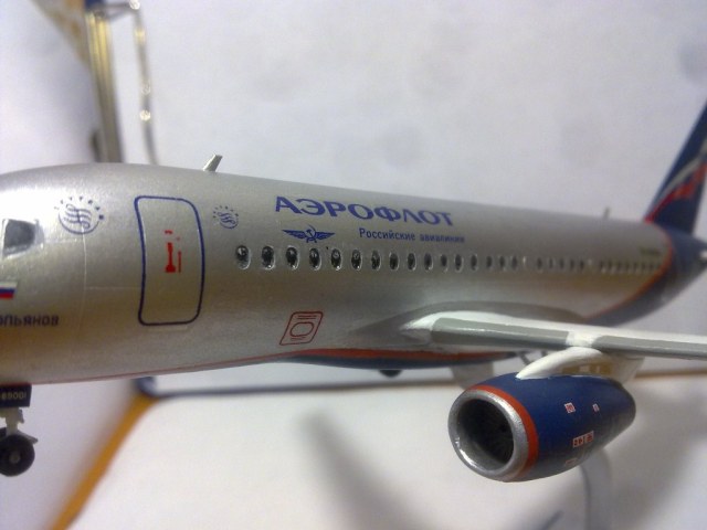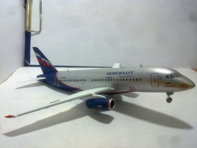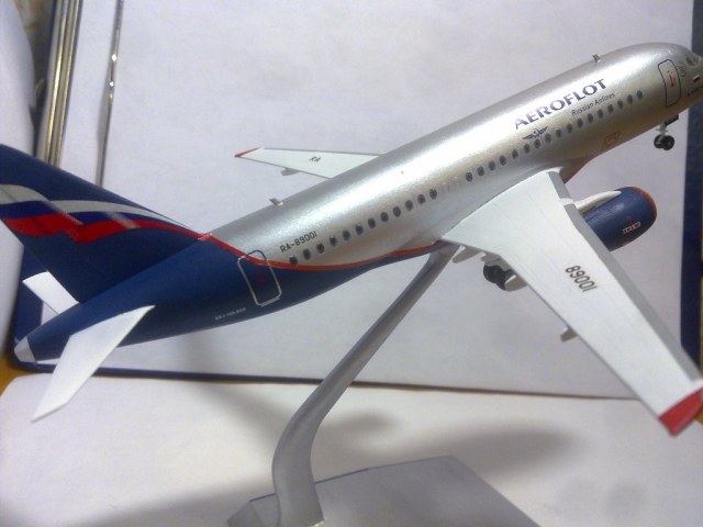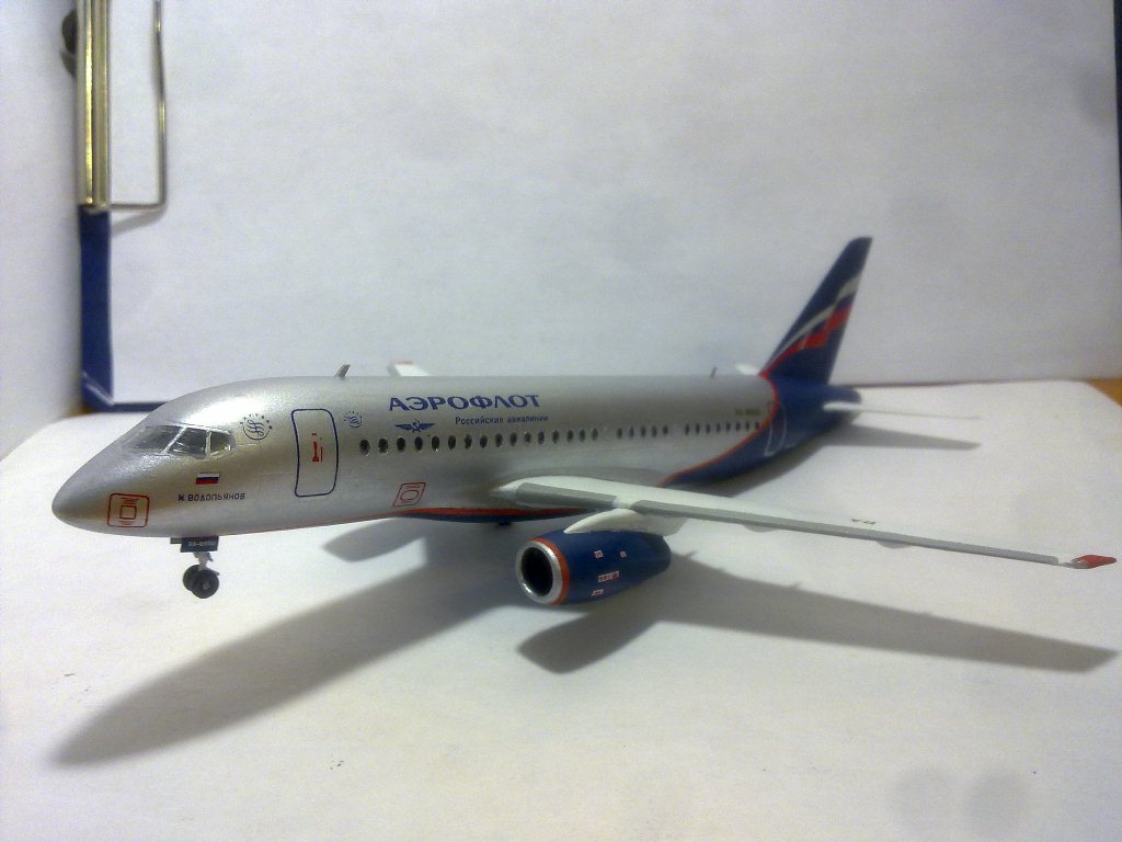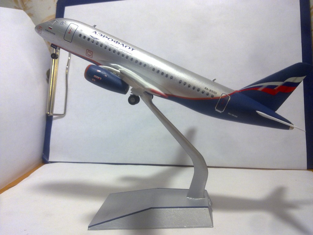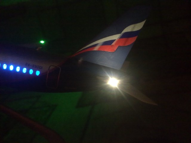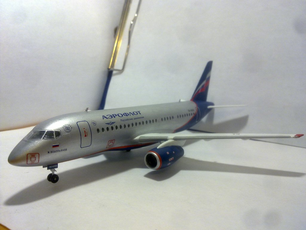 Решил выложить свою модель. Началось с того, что неожиданно увидел в модельном магазине SSJ-100. Ну уж очень захотелось собрать современный лайнер. Модель не первая, но впервые использовал шпатлевку и грунтовку. Все мечтаю об аэрографе, но пока не могу себе позволить. Поэтому красил кистями и краской TAMYA. Смотря на свои модели ночью, очень хотелось их как-нибудь оживить. И поэтому решил сделать с подсветкой(а-ля ночник)). Во время сборки использовал smd-светодиоды, по размеру они очень хорошо подошли к модели, даже удивился когда смог их поставить в стабилизатор и БАНО. Провод использовал из-под шлейфа IDE(жесткий диск). Хотел еще сделать стробоскопные огни, но подумал, что ночью будут мигать и отвлекать внимание. Модель несложная, всего 47 деталей, стыковка проблем не вызвала. Сразу замечу, не получилось полностью скрыть шов стекло-фюзеляж. Еще опыта надо бы.В общем жду критики, советов. Спасибо всем)