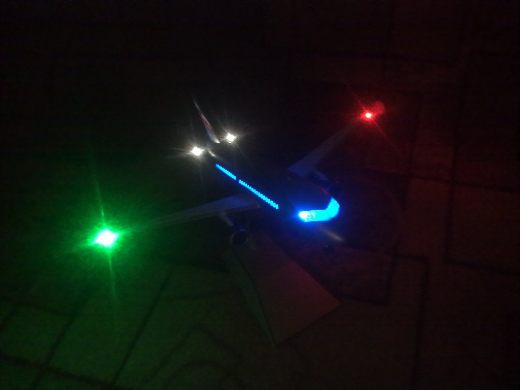 Приятный самолёт, судя по зажиму планшета на заднем плане, - совсем небольшой. Освещение - спорный момент. Слишком яркое, и в салоне не должно быть таким синим. Опять же белые огни на горизонтальных стабилизаторах скрытые, их самих почти не видно, и светят они направленным лучом на киль, на лого компании, разве нет? Красная линия между серебристым и синим декальная или крашеная?
