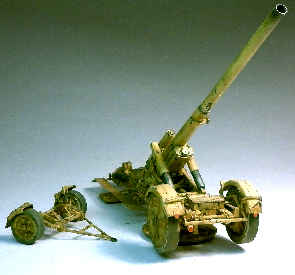 Обработке подверглась каждая деталь модели. Склеивание элементов и сборка узлов проходила при тщательной подгонке и корректировке деталей. Грубо сделанные крылья лафета и передка орудия заменены на самодельные.