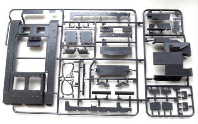 В традиционной "тамиевской" коробке находятся аккуратно упакованные: 4 литника (2 с деталями корпуса, интерьера, вооружения; 2 с деталями ходовой), ванна корпуса, небольшая плата фототравления (решетки и защитные щитки фар) и алюминиевый ствол орудия, а также инструкция на 8 листах, сложенных "гармошкой" и двойной лист с цветными изображениями образцов окраски и маркировки и довольно богатая декаль. Ну и виниловые гусеницы...
