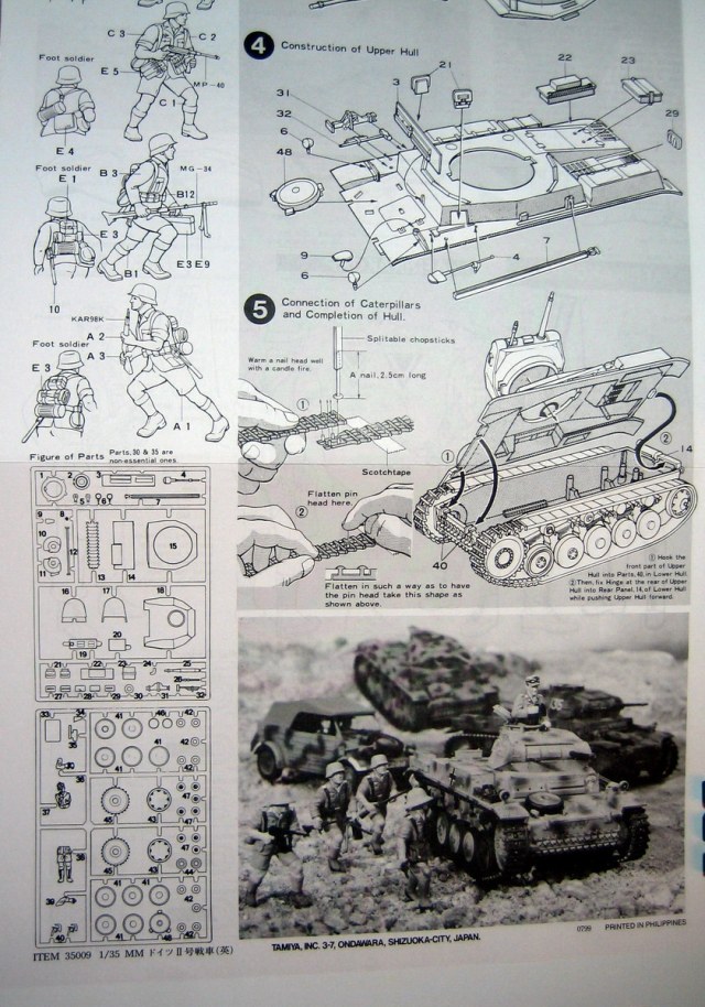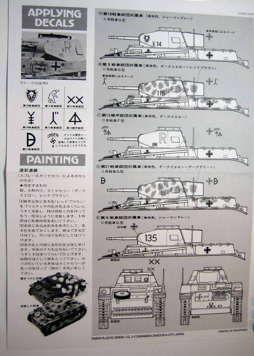 Для начала хочу остановиться на модификации. Тамия обозвала этот набор как Pz.Kpfw. II ausf.F/G. Тут именитая фирма явно заблуждается, т.к. модификация G к данному экземпляру не имеет вообще никакого отношения. Так что в коробке имеем комплект деталей для сборки модификации F, либо с забашенным ящиком, либо без.