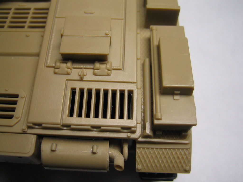 Ванна и верхняя часть корпуса даны отдельными деталями. В ванне имеется куча отверстий для установки моторчика, батареек и прочих элементов радиоуправления. В надгусеничных полках – ничем не обусловленные выемки, которые придется заделывать. Сами полки неимоверно толстенные, и их придется довольно сильно стачивать до масштабной толщины. Решетки МТО толстые и на вид дубовые.