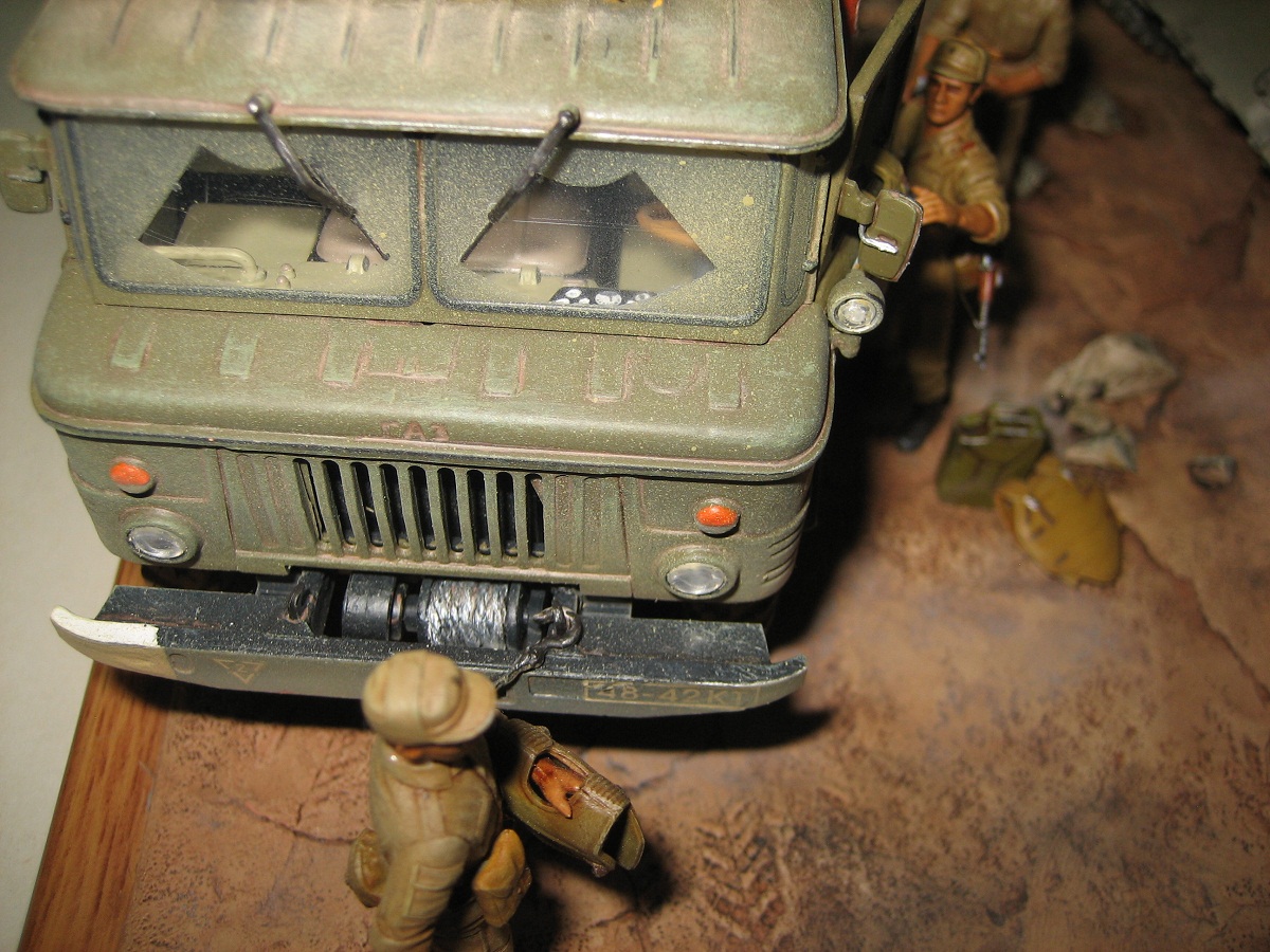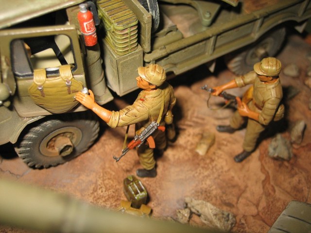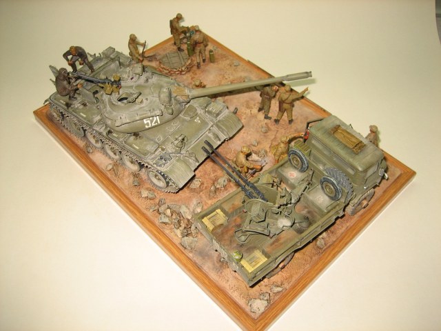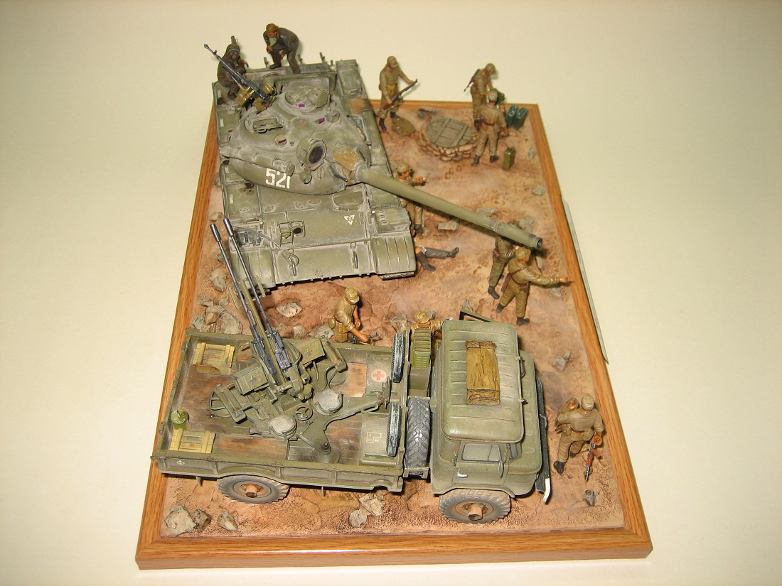 Привет коллеги Коропчане. Новая диорамка на ваш суд. Были у меня 2 модельки, делал в начале своей карьеры моделиста, 2 года назад. Т-55 от Скифа и Шишига от ВЭ. Собраны были из коробки, все знают эти дрова. Ну так вот, решил я дать им вторую жизнь:). Прикупил 3 набора от ICM - советских солдат, и селся за перепил. Шишига: изменил-колёса, от Оружейника, добавил ящики, канистры, скатки и трос. Т-55 : по чертежам кажется снаружи изготовил всё. Доделал движок и ДШК, фары и кое-как улучшил вид гусениц, изготовил новые тросса. Перепилил солдафонов , чтоб у всех были разные позы. Подставка: фоторамка + гипс. Краски: Тамия и Хома, смывка-масло ну и пастель. Всем приятного просмотра.