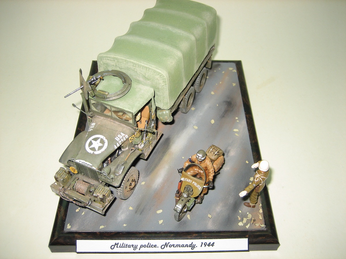 Привет всем. Маленькая виньетка от меня. Грузовичок был собран давно ( он у меня в личных моделях есть ), прикупил к нему Тамиевский наборчик военных полицаев ( моцик ещё куда нишло , а вот бойцы - дрова :) ). Соорудил незатейливый сюжетик, и на полочку ;). Подставка-фоторамка, асфальт-нождачка, листики, трама -из подручных материалов. Краски-Тамия. Всем приятного просмотра.