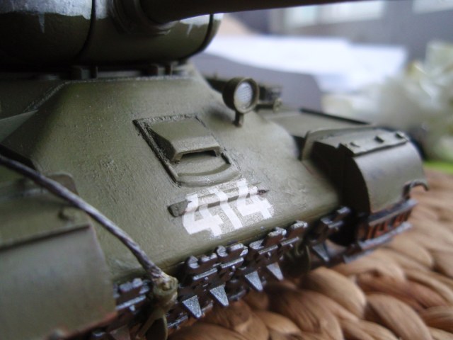 Была попытка покопаться в матчасти: отрезал передние крылья от надгусеничных полок, сделал новые из металической банки из под кокаколы, немного помял их для реализму. Из старых сделал накладки с заклёпками. Также поработал над смотровой щелью мехвода с помощью тянутого литника. Добавил кое-где сварные швы, сделал антену и трос. Трос делал из медного провода, законцовки тоже самодельные из проволоки и смолы. Пытался поправить пулемёт (поэтому он теперь кривой).