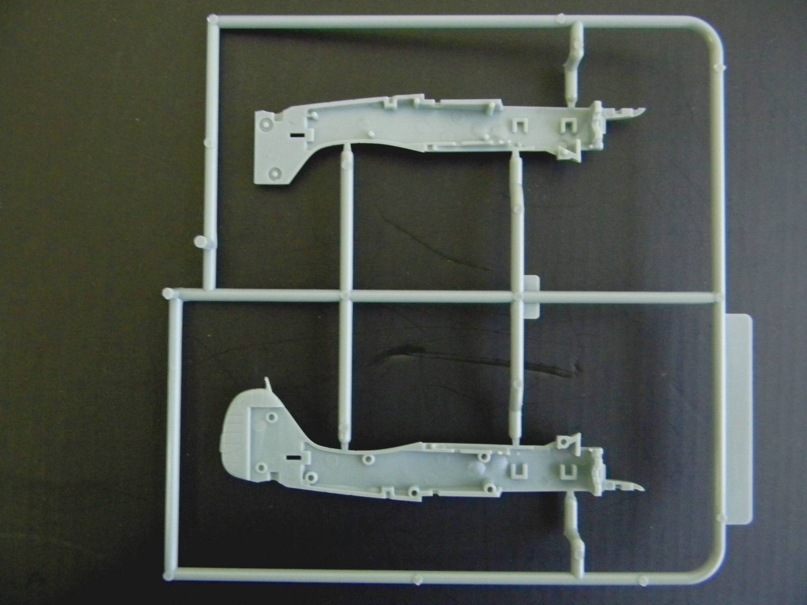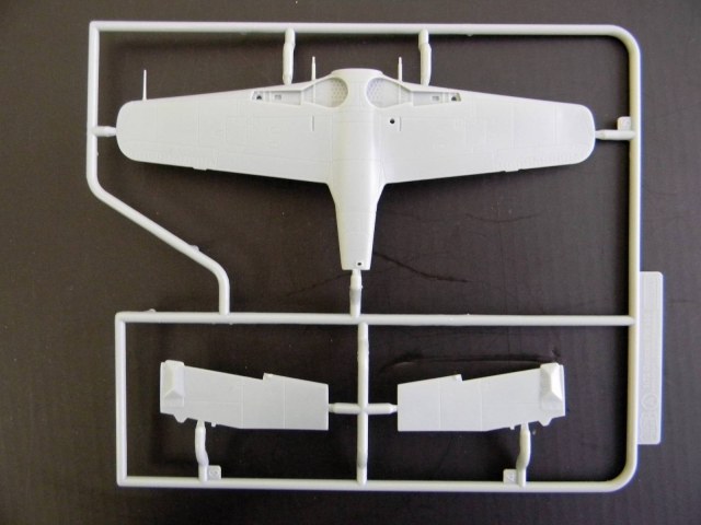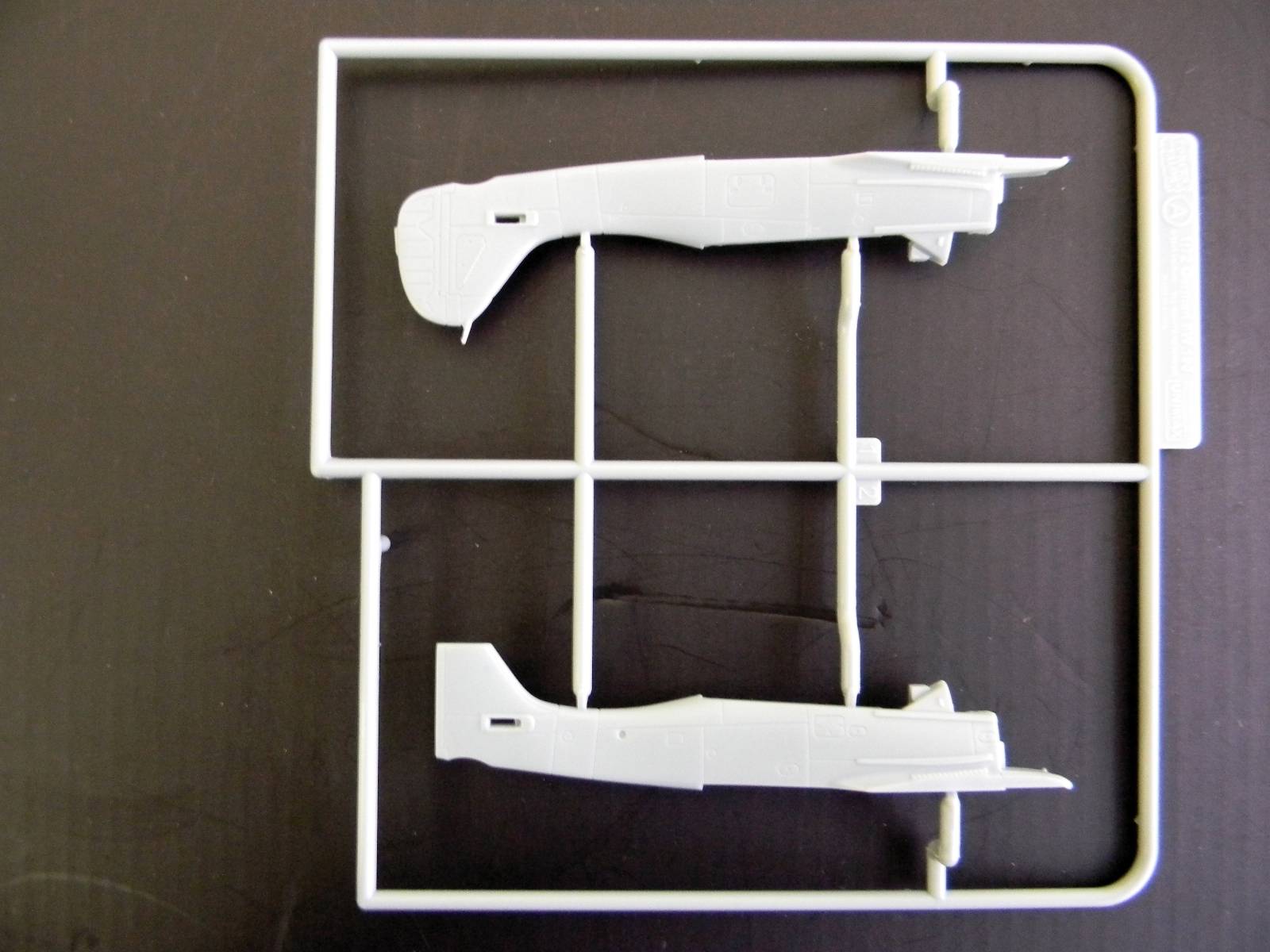 На этом, в общем-то, плюсы модели и заканчиваются. А дальше идут сплошные минусы. Поверхность пластика какая-то шершавая, даже бугристая; расшивка - мелкая, но широкая, провисы полотна на элеронах, стабилизаторе, киле даны также расшивкой. Очень странное членение верхней и нижней половинок крыла, не менее странной формы ниши шасси (мелкие, маленькие по размерам и овальные в районе колеса). Абсолютно неверная форма носовой части (и это не лечится), воздухозаборника компрессора. Совершенно невнятный кокпит, заголовника нет вообще.