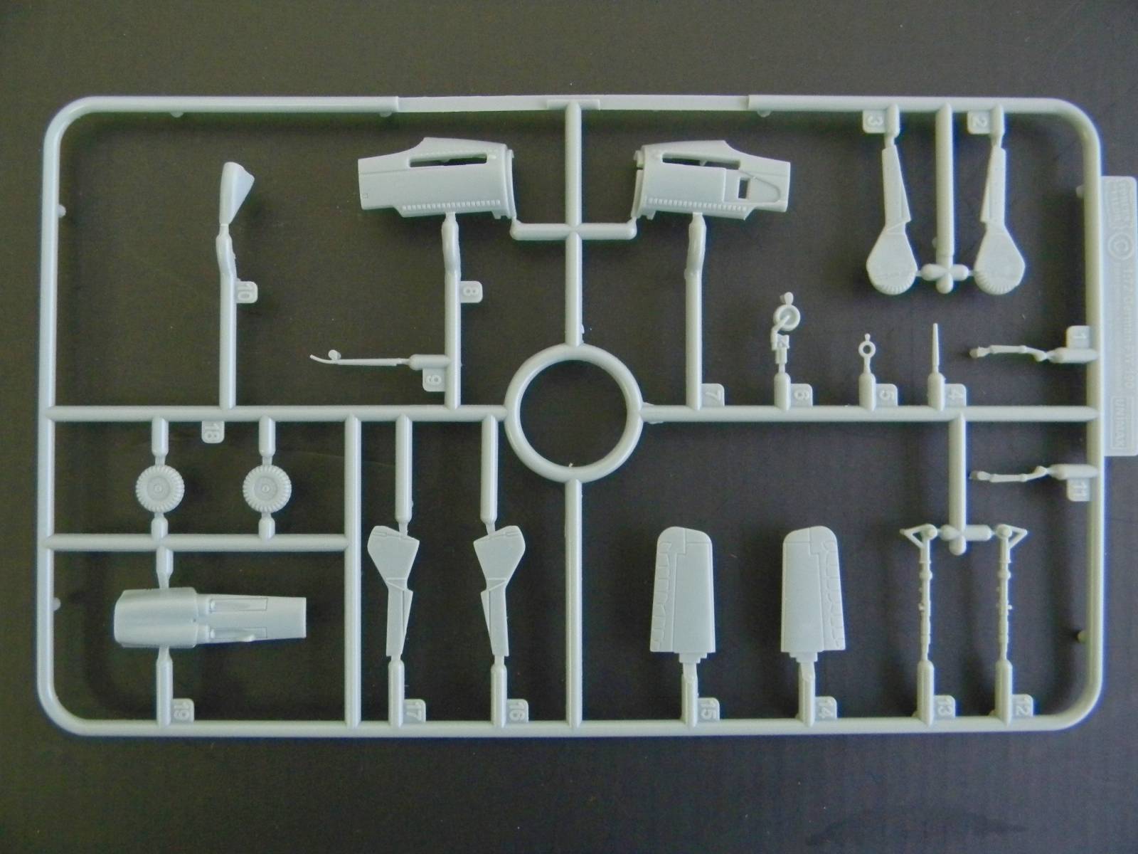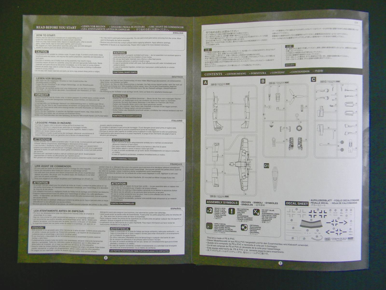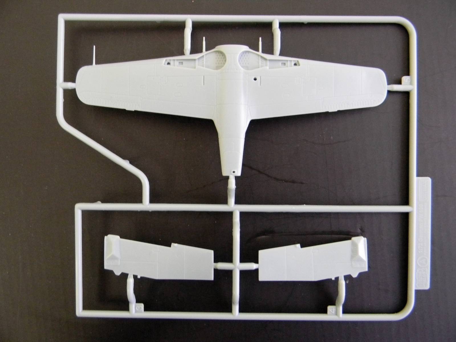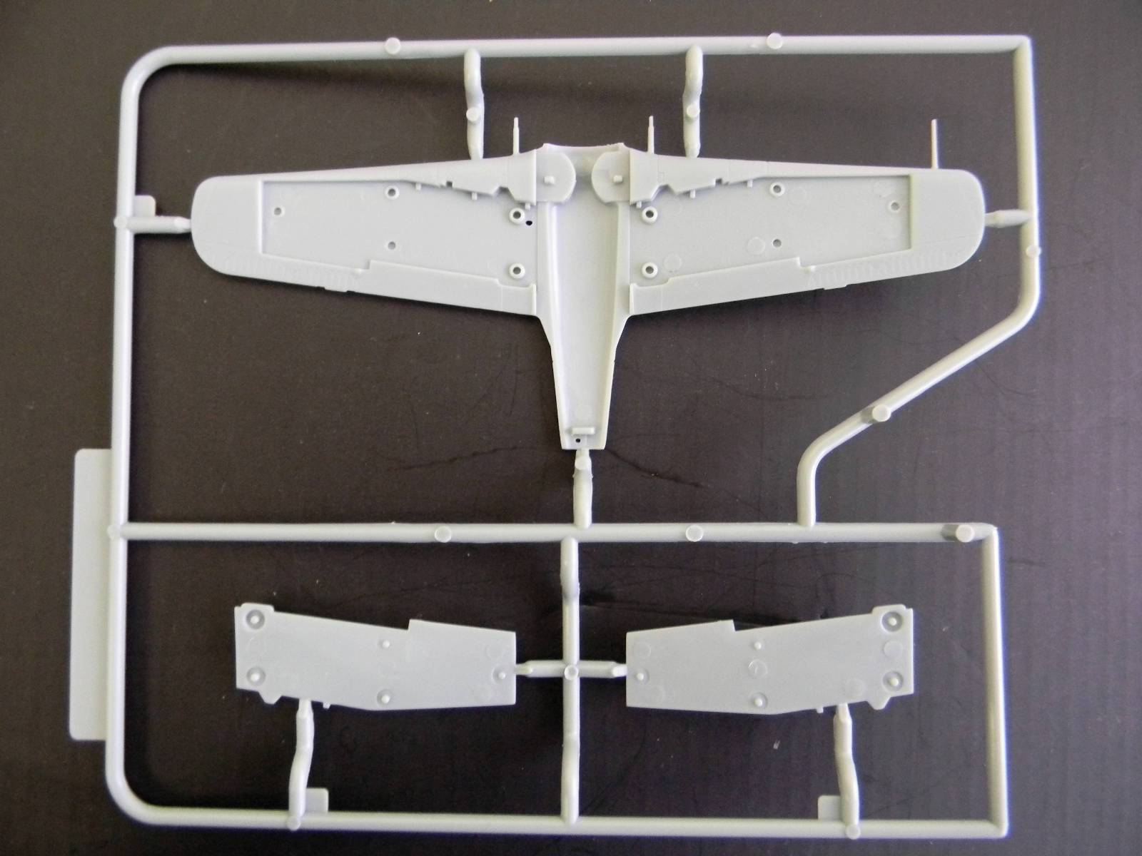 На коробке с верхней загрузкой на фоне грозового неба летит собранная и окрашенная модель сего самолета. Внутри коробки - 4 литника серой пластмассы (каждая в отдельном пакетике), фонарь (в пакетке), маленькая декаль не 1 вариант раскраски (опять же, в пакетике) и инструкция (без пакетика). По размерам (длина, размах крыла) модель неплохо вписывается в чертежи.