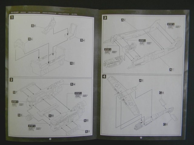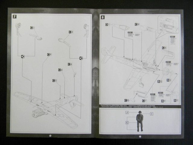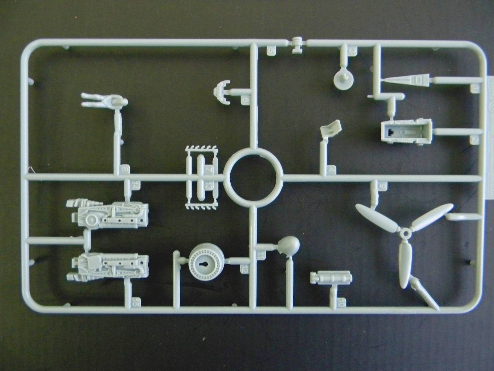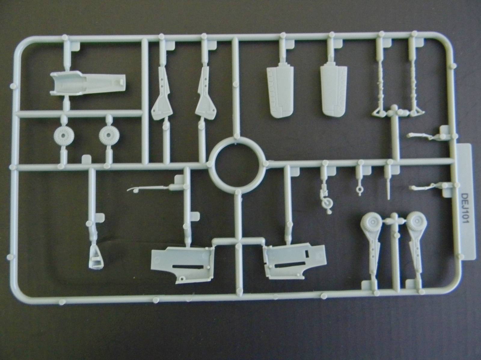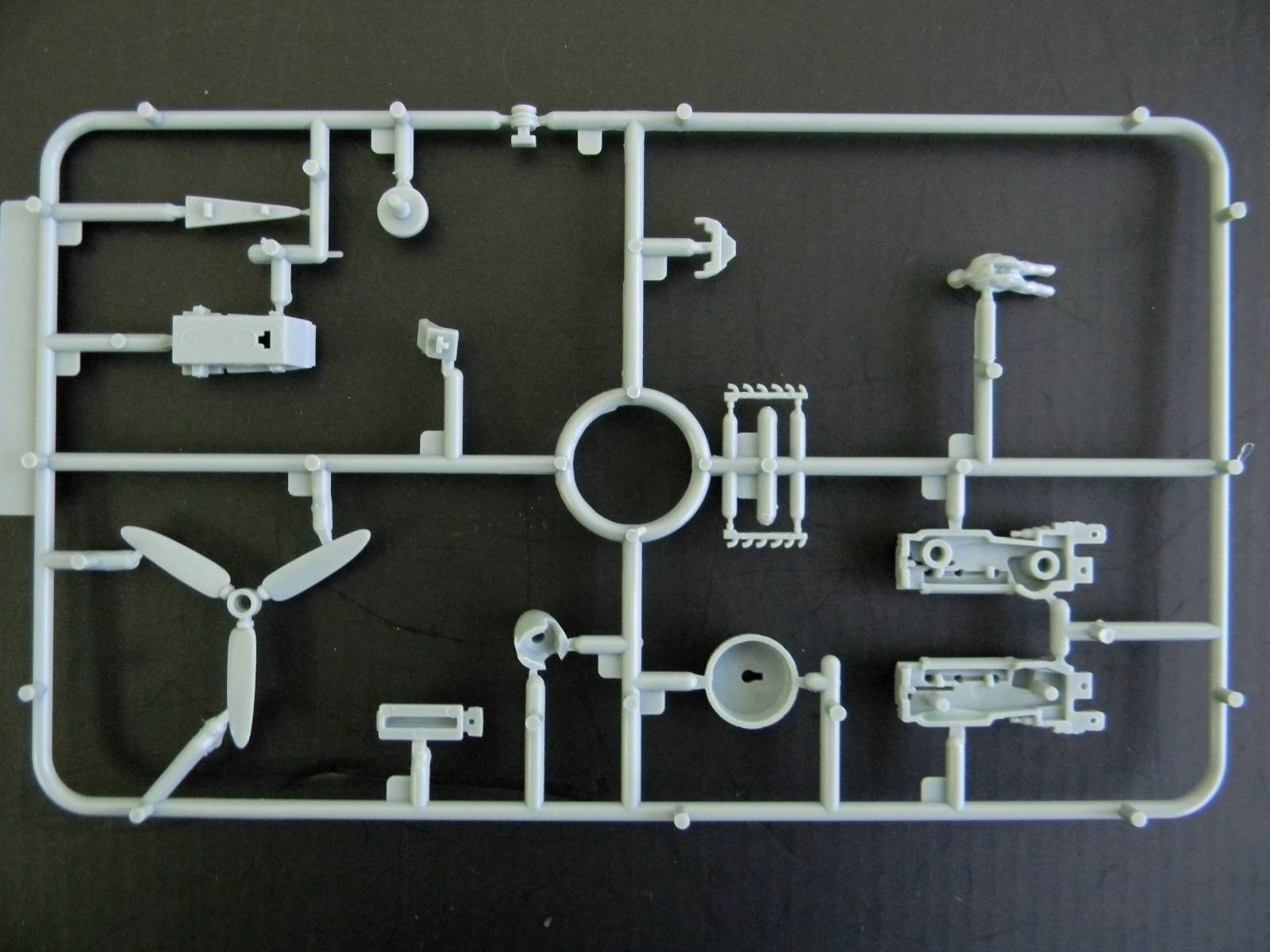 На коробке с верхней загрузкой на фоне грозового неба летит собранная и окрашенная модель сего самолета. Внутри коробки - 4 литника серой пластмассы (каждая в отдельном пакетике), фонарь (в пакетке), маленькая декаль не 1 вариант раскраски (опять же, в пакетике) и инструкция (без пакетика). По размерам (длина, размах крыла) модель неплохо вписывается в чертежи.