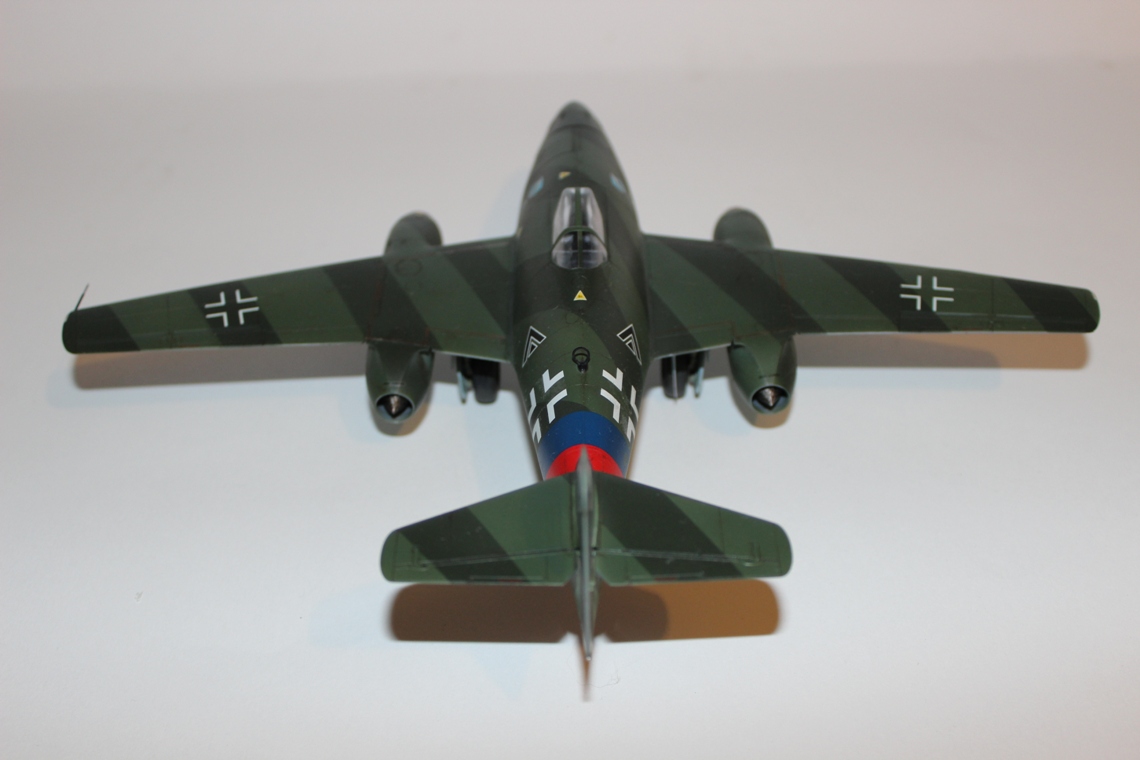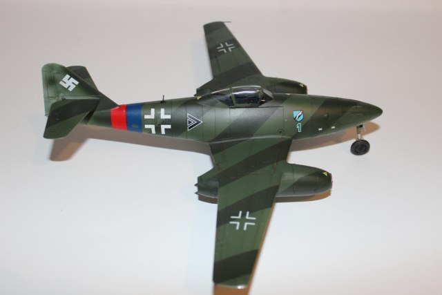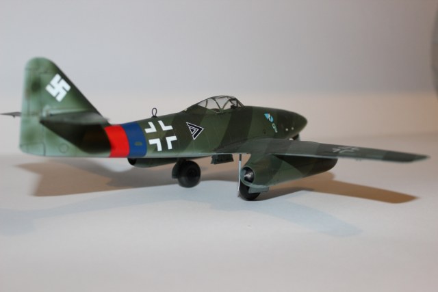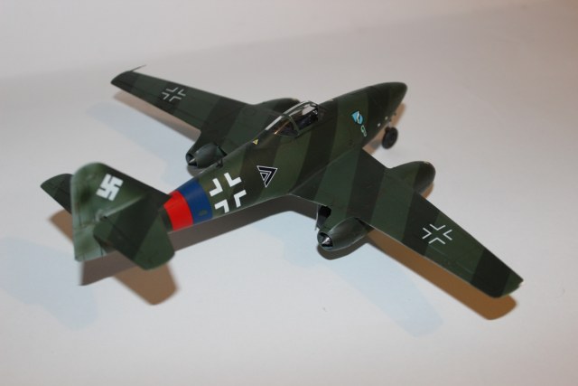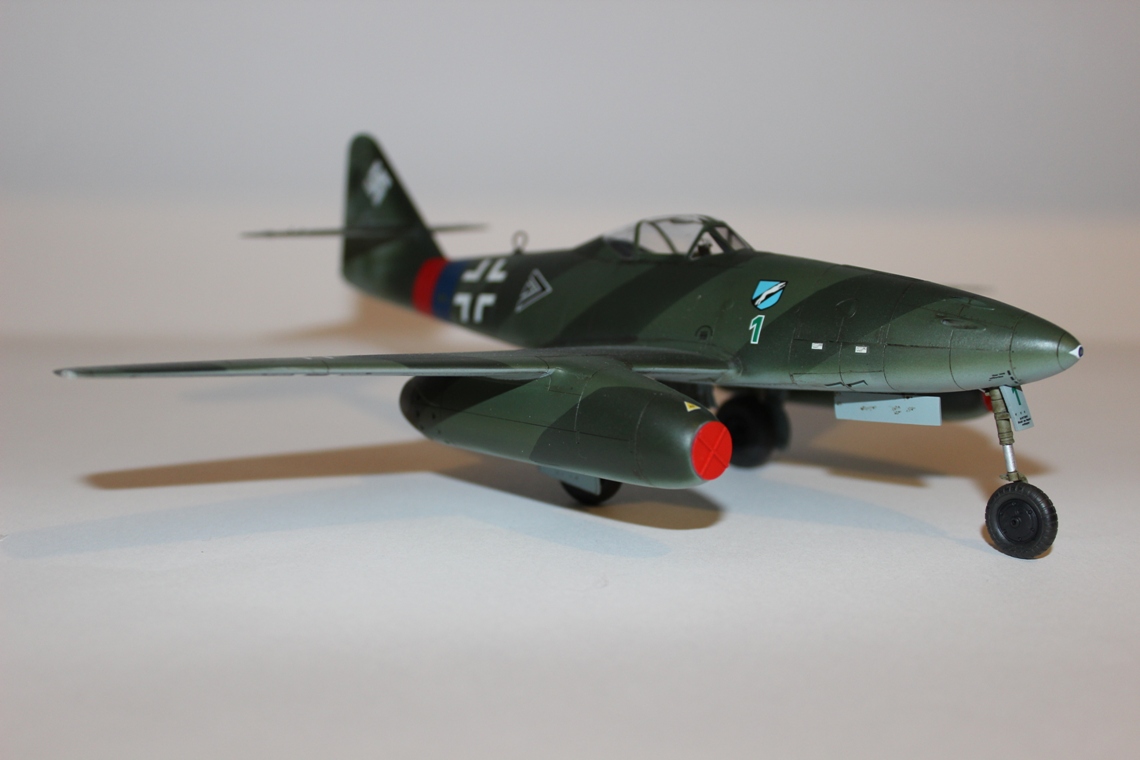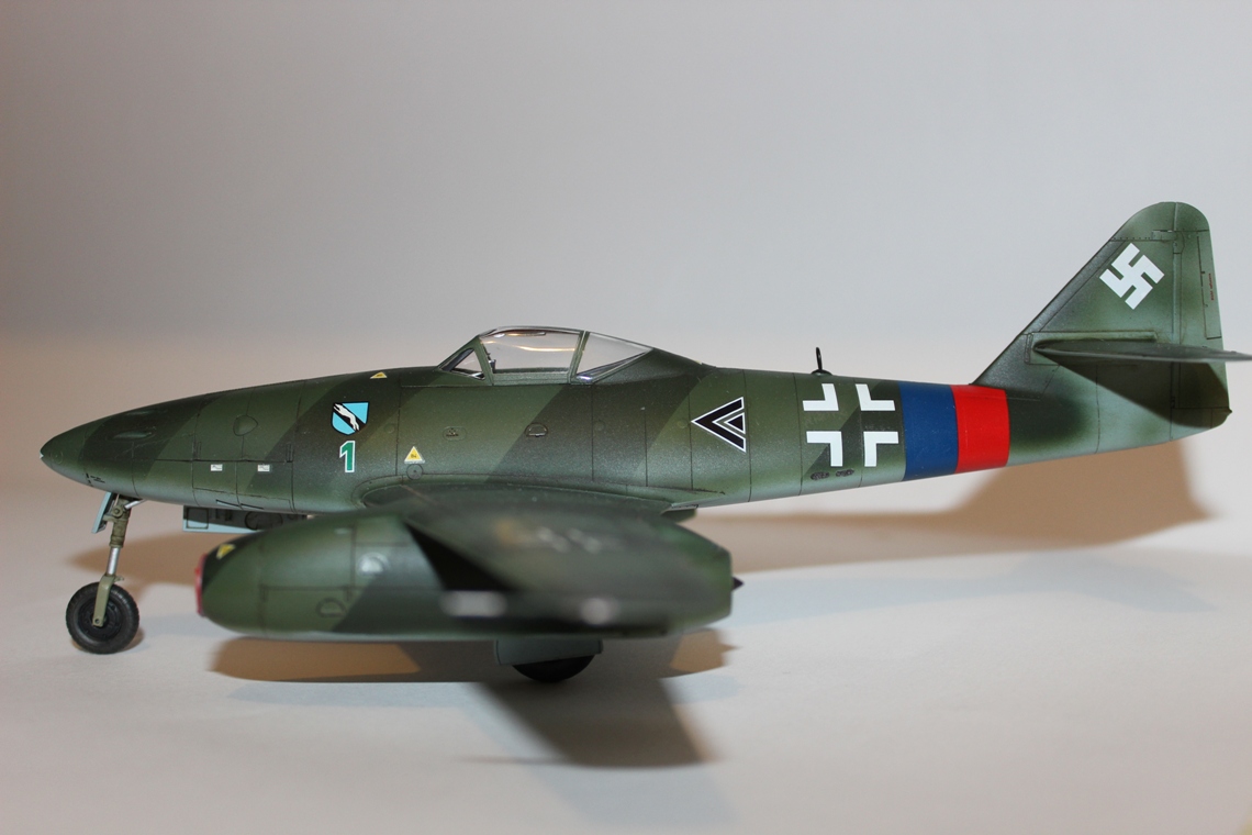 Из вариантов окраски, предлагаемых в инструкции, выбрал Ме-262 айора Рудольфа Зиннера. Во-первых, такого варианта камуфляжа Люфтваффе в моей маленькой коллекции еще нет, а во-вторых, данная схема показалась почему-то наиболее простой, что оказалось большой ошибкой. Накрасить параллельные полосы одинаковой толщины на фюзеляже крайне не просто, и в итоге у меня этого так и не получилось. Красил аэрографом в цвета RLM 82/83/84b из палитры водоразбавляемого АКАНа. Ниши шасси окрашены X-16 «Chrome Silver» от «TAMIYA»; кабина – RLM66; стойки шасси – RLM 02. Для выделения расшивки использовал художественную акварель цвета «умбра»+фэйри. Модель не пачкал и не сдирал. Сверху модель покрыта полуглянцевым лаком АКАН.