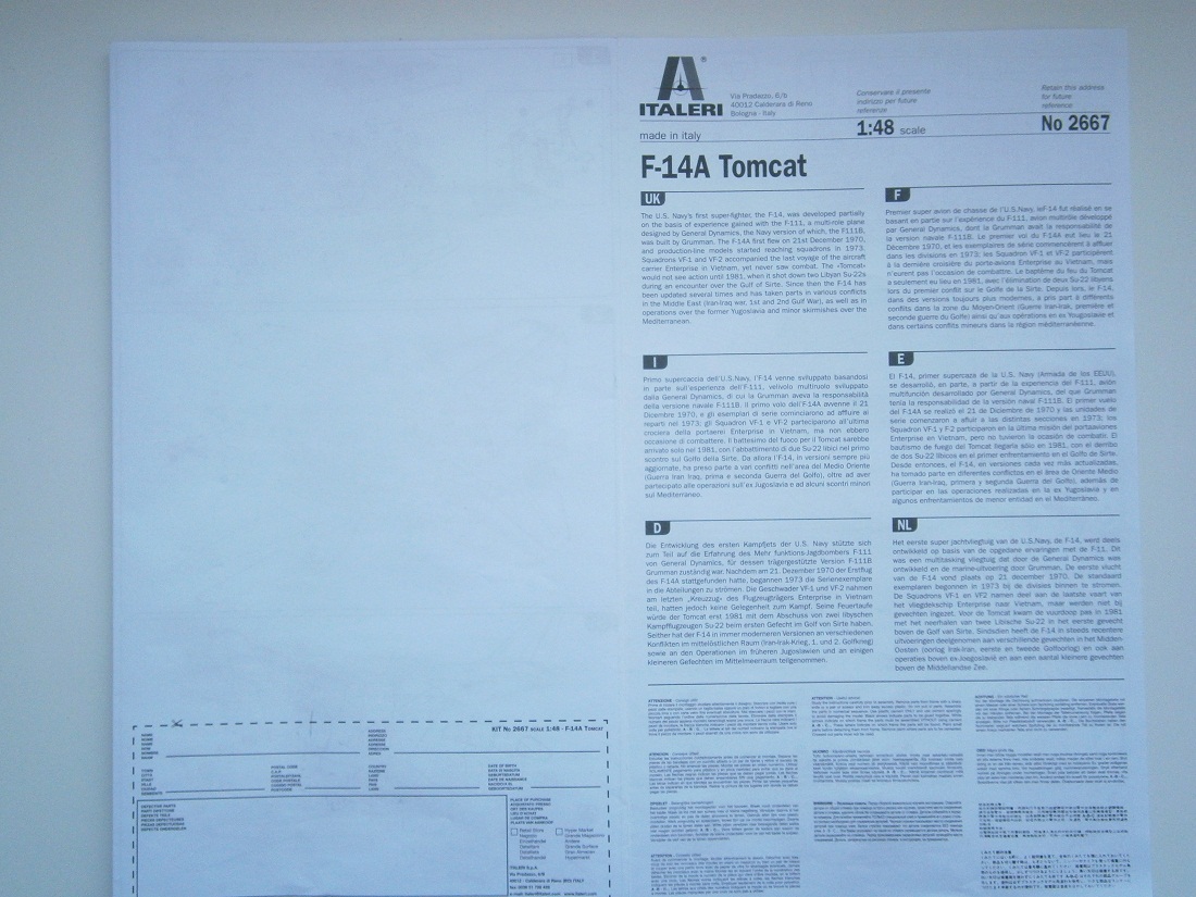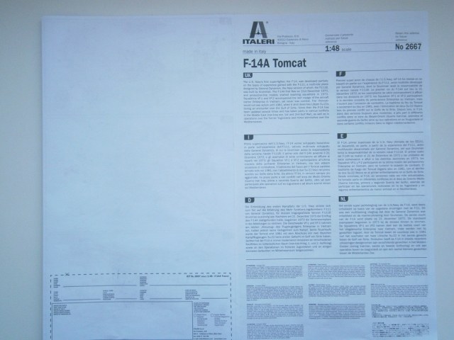 Приветствую Всех и Доброго времени суток! Представляю на обзор модель американского палубного истребителя F-14A TOMCAT от производителя ITALERY в 48-м масштабе.В красочной упаковке находится четыре литника с деталями светло-серого цвета,хорошего качества,без облоя,и один литник из прозрачного пластика остекление фонаря. Очень понравился качественный крой, он довольно таки глубокий,выделены лючки,а особенно впечатлили заклепочные швы.Инструкция по сборке отличного качества выполнена на белом раскладном листе.Деколь в наборе мне очень понравилась,она выполнена на формате А4 отличного качества,производитель предлагает три варианта выполнения данного борта VF-84 " JOLLY ROGERS"1976, USS. NIMITZ, VF-1 "WOLFPACK" 1975 USS. ENTERPRISE, VF-213 " BLACK LIONS " 1975, USS. KITTY HAWK. ИЗ косяков в наборе их довольно не много, кабина в принципе не плохая,но я ее буду менять на смоляную от AIRES . Сопло двигателей можно сразу выкинуть,они просто овощные!!!,также меняю их от AIRES ,также приобретаю фототравление. Стойки шасси тоже надо будет дорабатывать. Не большой косячок вдоль остекления фонаря линия от литья,его можно пильнуть и отполировать.Ну вот вроде и все,у кого появятся вопросы по донному киту обращайтесь .С уважением Дмитрий.
