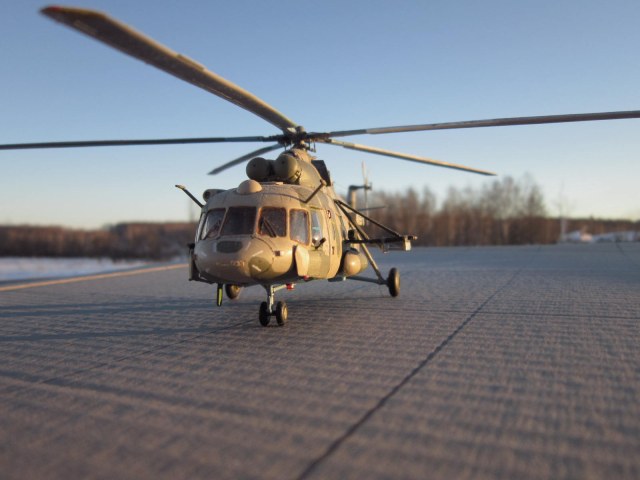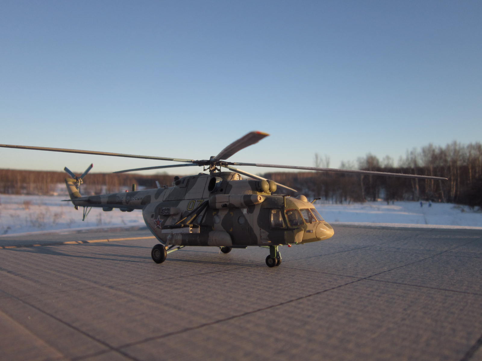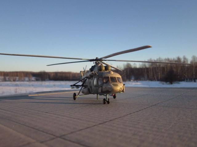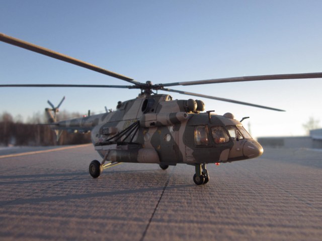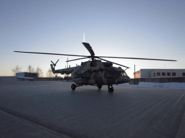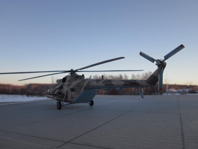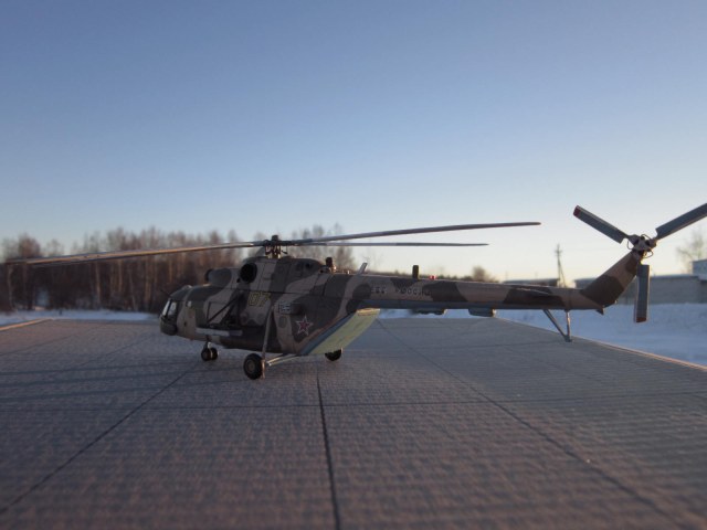 задумка несомненно дельная, у самого заготовленна ХБ-шная "восьмерка" на тему подобного перепила, только на Ми-8АМТШ. Все то, что перепилено технически сделано хорошо. Но по матчасти есть недочеты, самый яркий пожалуй - рампа. Сделана хорошо, но не правильно, она короче чем нужно, вертолет выглядит куцо. И по маленьким фото не могу понять, есть ли за навесными бронелистами остекление, блоки АСО на бортах кажутся непропорциональными по форме. Ну и конечно все-таки лучше пилить ХБ чем звезду, да она тоже кривенькая, но не настолько.