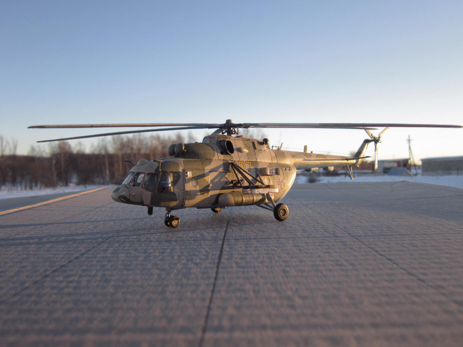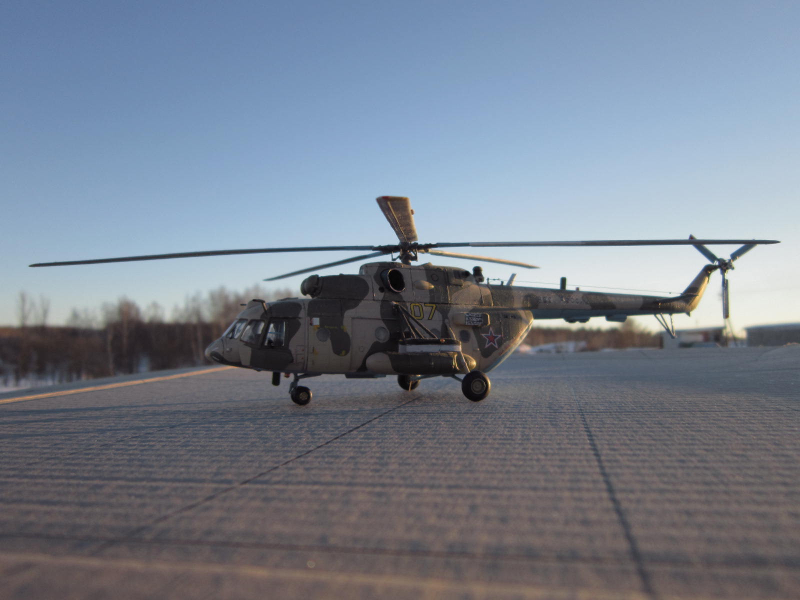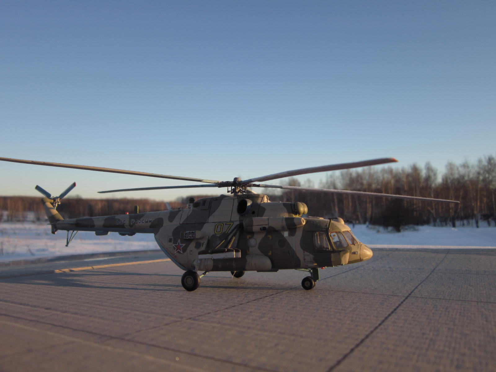 задумка несомненно дельная, у самого заготовленна ХБ-шная "восьмерка" на тему подобного перепила, только на Ми-8АМТШ. Все то, что перепилено технически сделано хорошо. Но по матчасти есть недочеты, самый яркий пожалуй - рампа. Сделана хорошо, но не правильно, она короче чем нужно, вертолет выглядит куцо. И по маленьким фото не могу понять, есть ли за навесными бронелистами остекление, блоки АСО на бортах кажутся непропорциональными по форме. Ну и конечно все-таки лучше пилить ХБ чем звезду, да она тоже кривенькая, но не настолько.