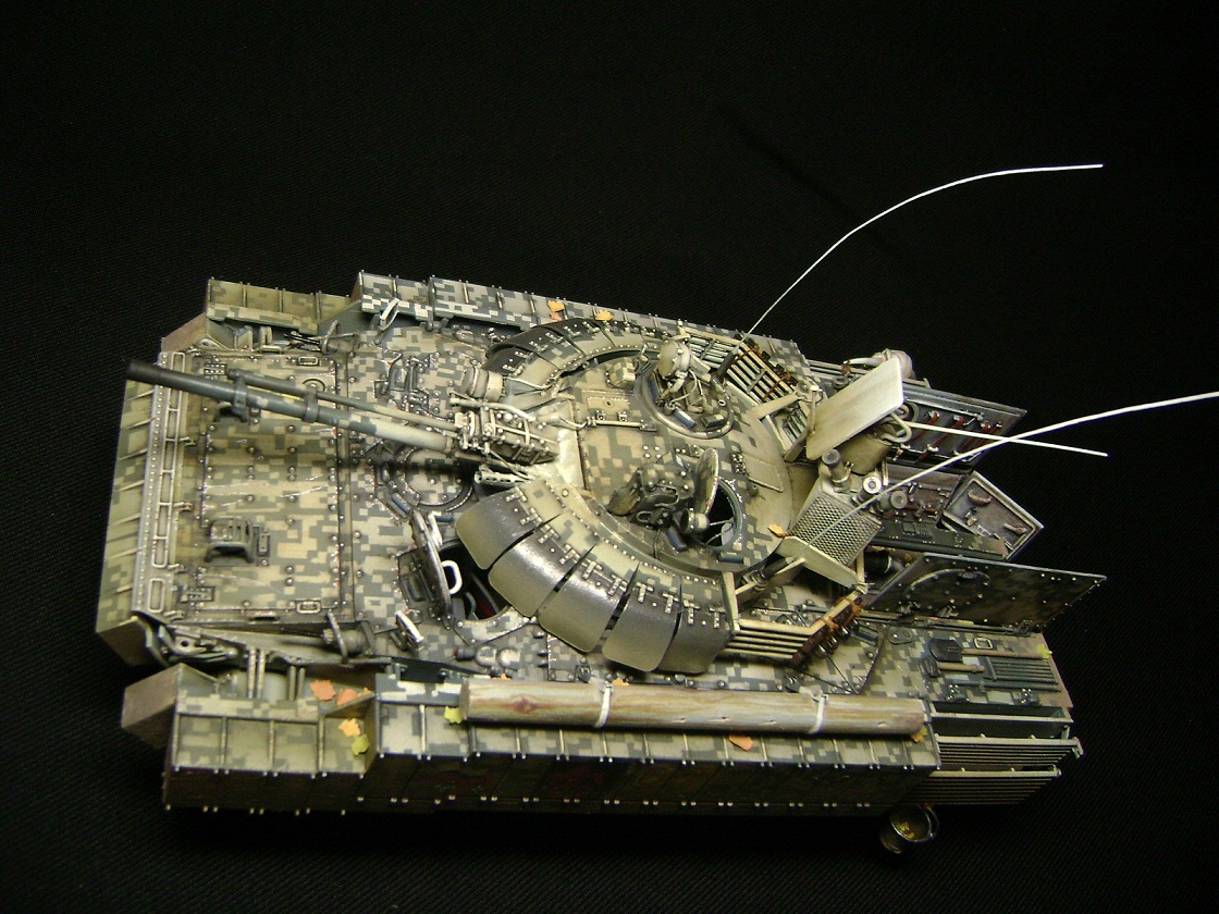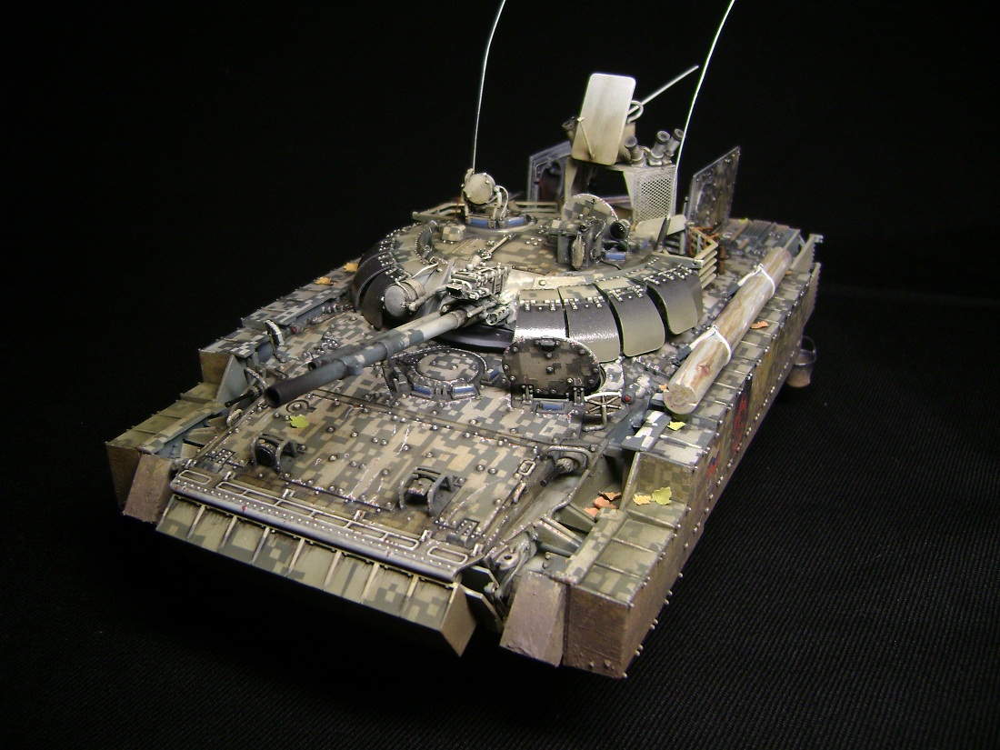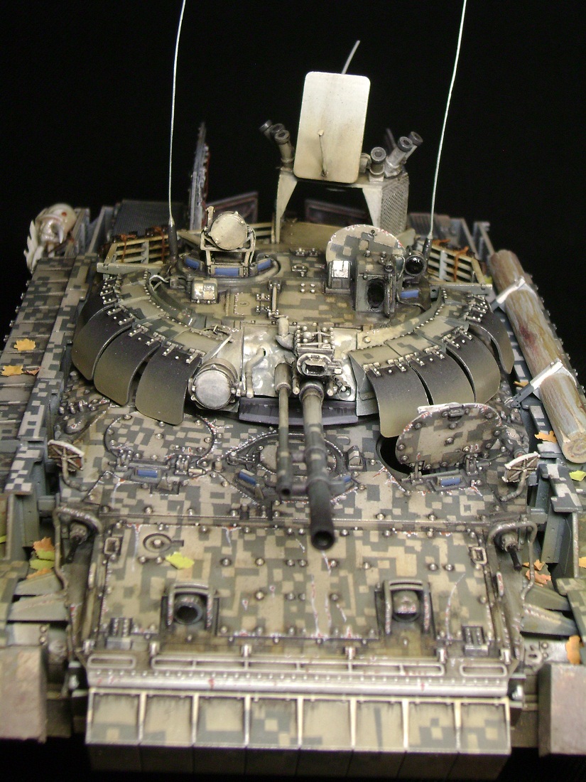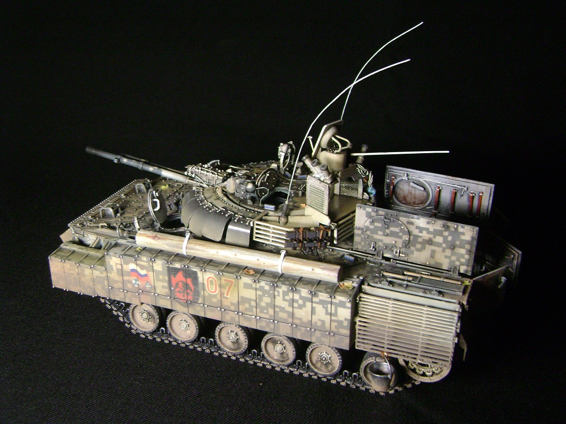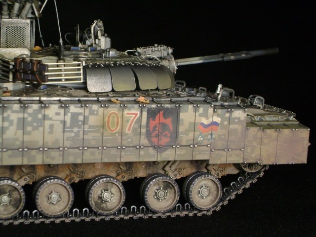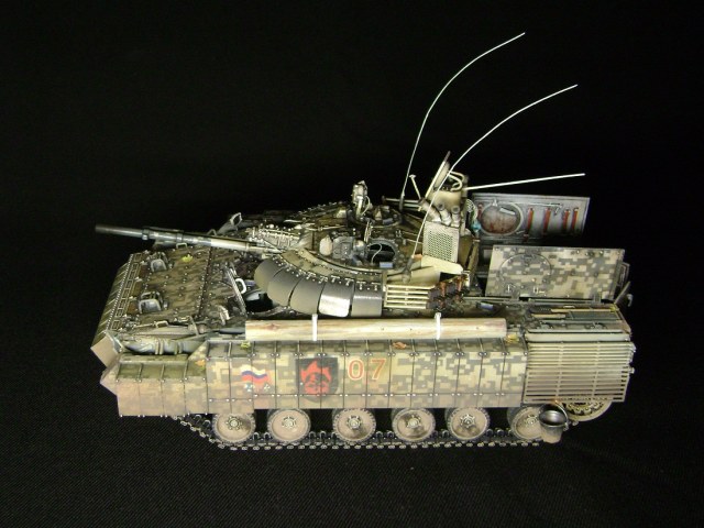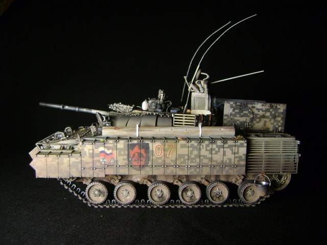 Машина принадлежит 7ой штурмовой группе, камуфляж цифровой городской, для ведения боевых действий в условиях промышленных объектов и, главным образом, г.Припять. На башне установлен универсальный детектор аномалий "Луч-М2", по бокам расположены 6 гранатометов. Полка, на которой установлен детектор, не препятствует удалению из башни стреляных гильз от 100мм орудия. На правом борту укреплен трофей - череп припятского мутанта, добытый членами экипажа и ставший своеобразным талисманом машины.